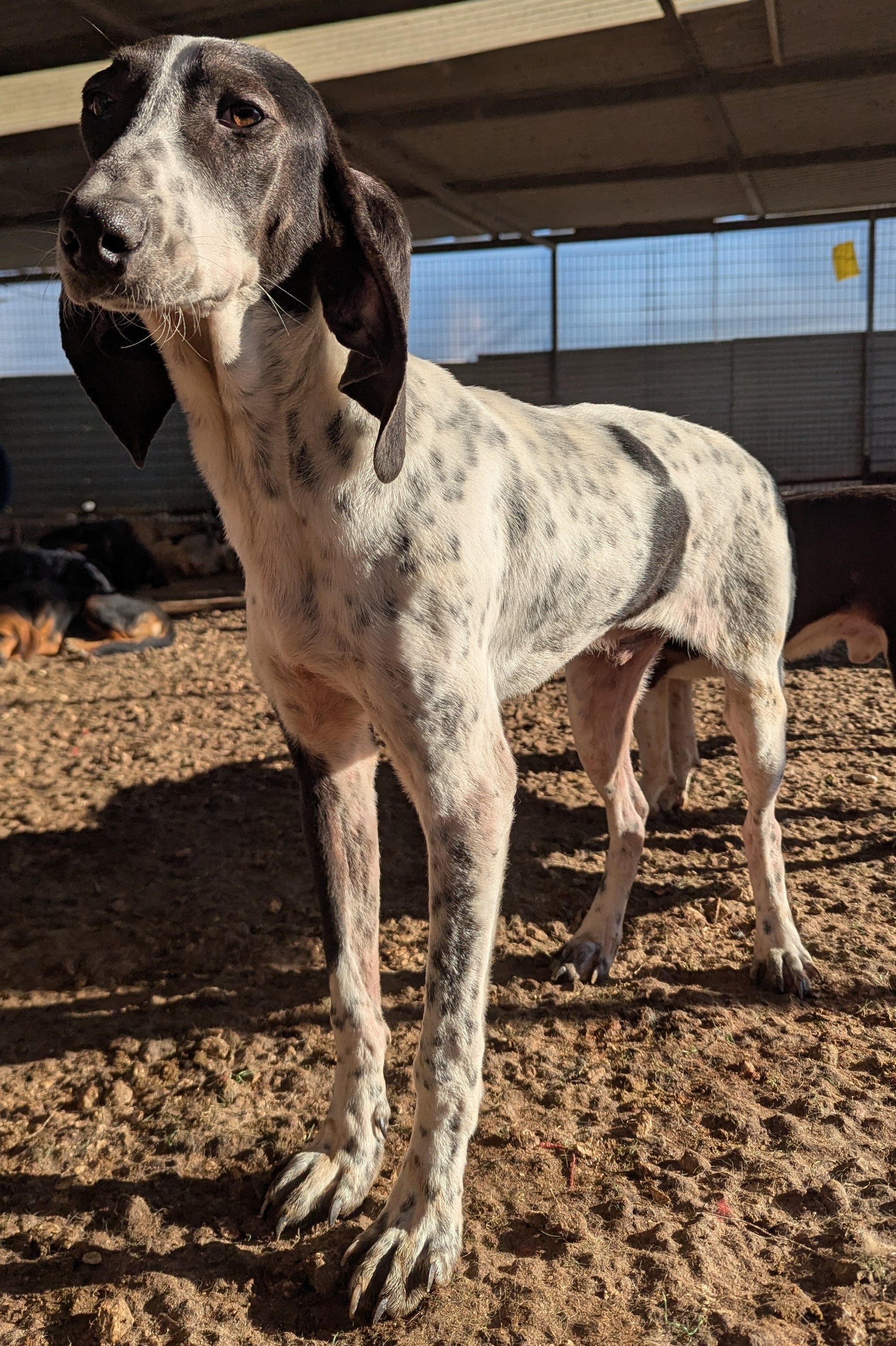 Больше среднего размера мальчик охотничей породы. Окрас белый с чёрными пятнами. Дружелюбный, общительный