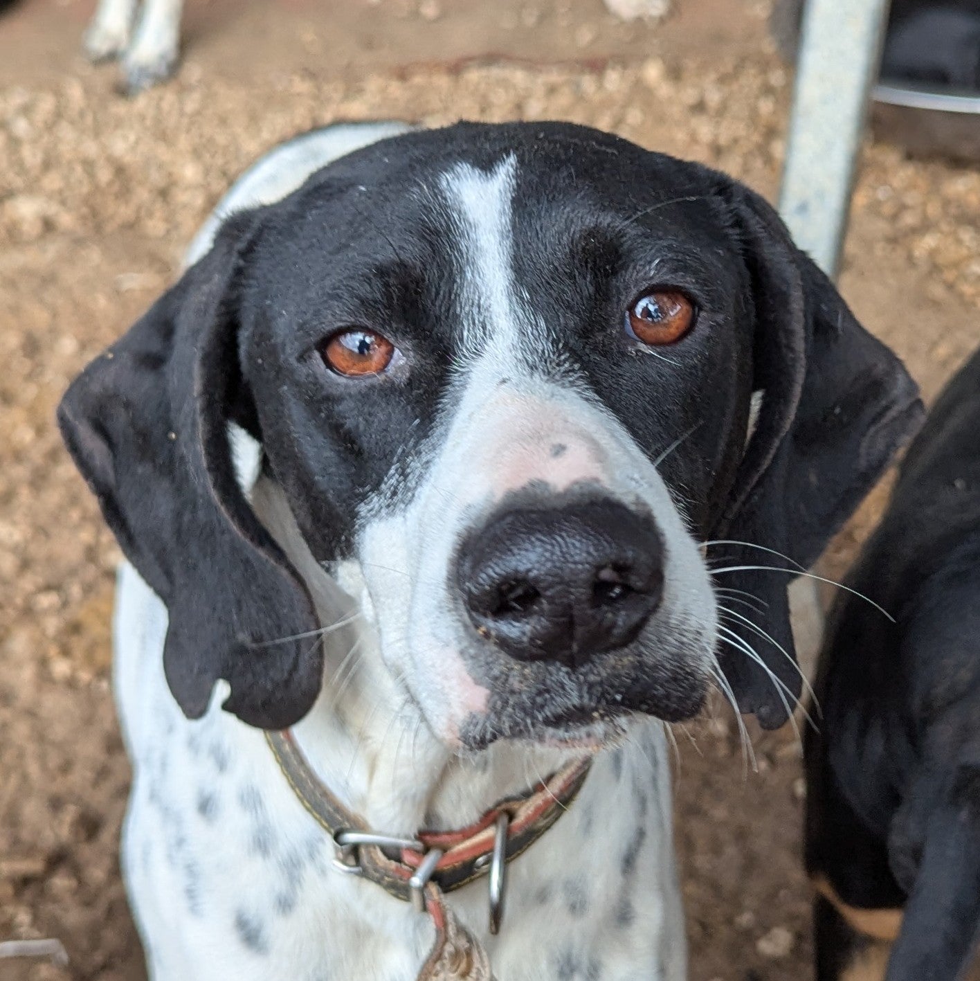 Среднего размера девочка пойнтер, белого окраса с черными пятнами и изящно изогнутыми ушами в форме буквы S. Активная, шумная в игре. Любит внимание человека