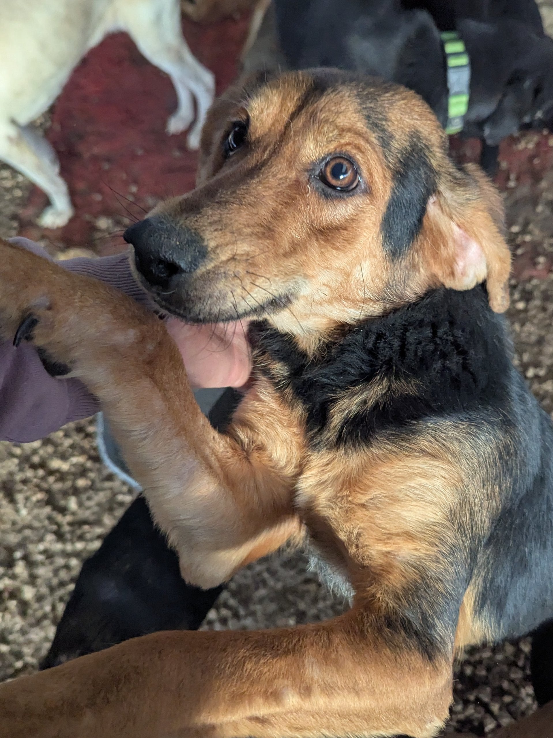 Came in to the shelter as a puppy. Now moved to a pen with other adults