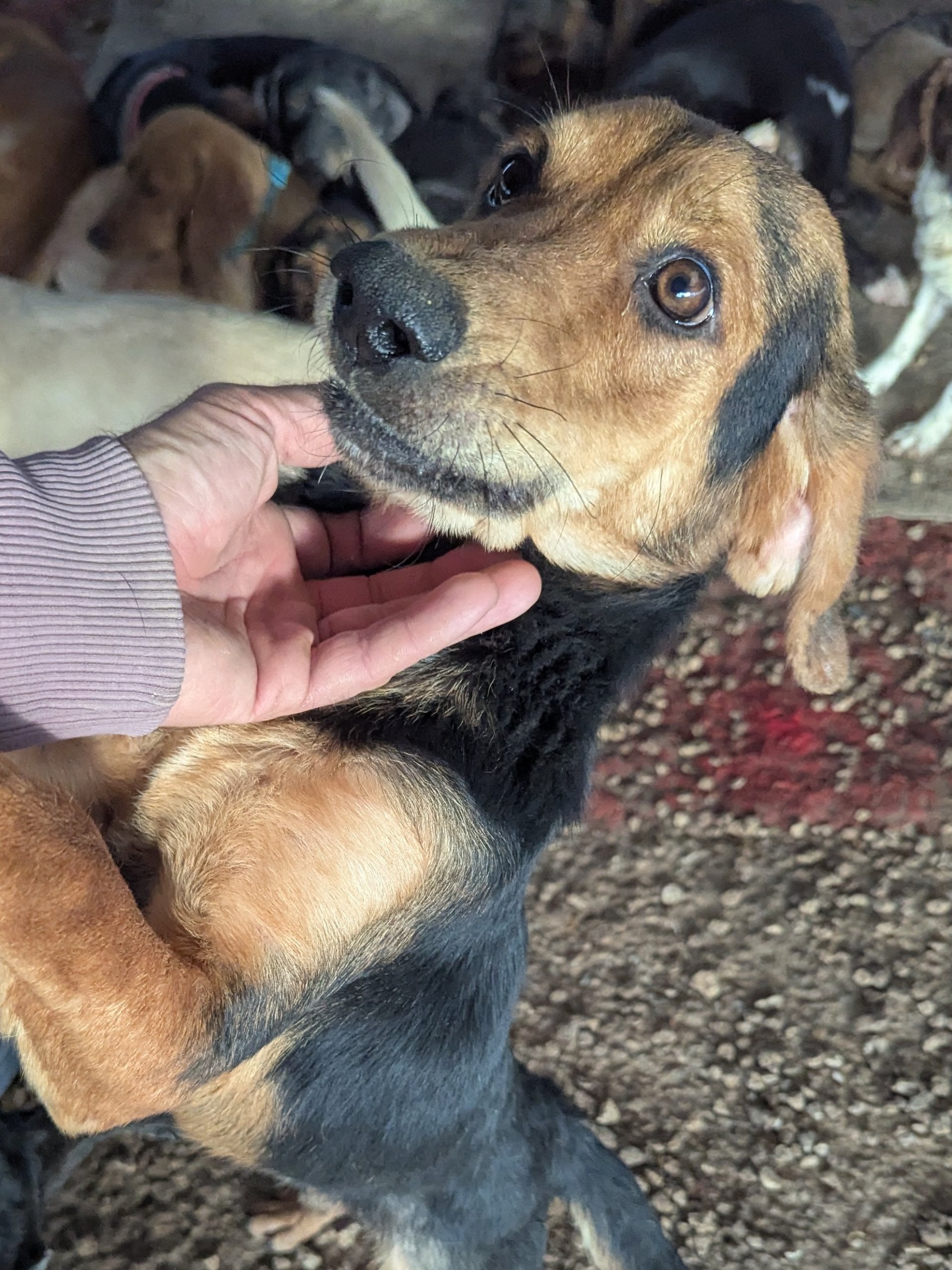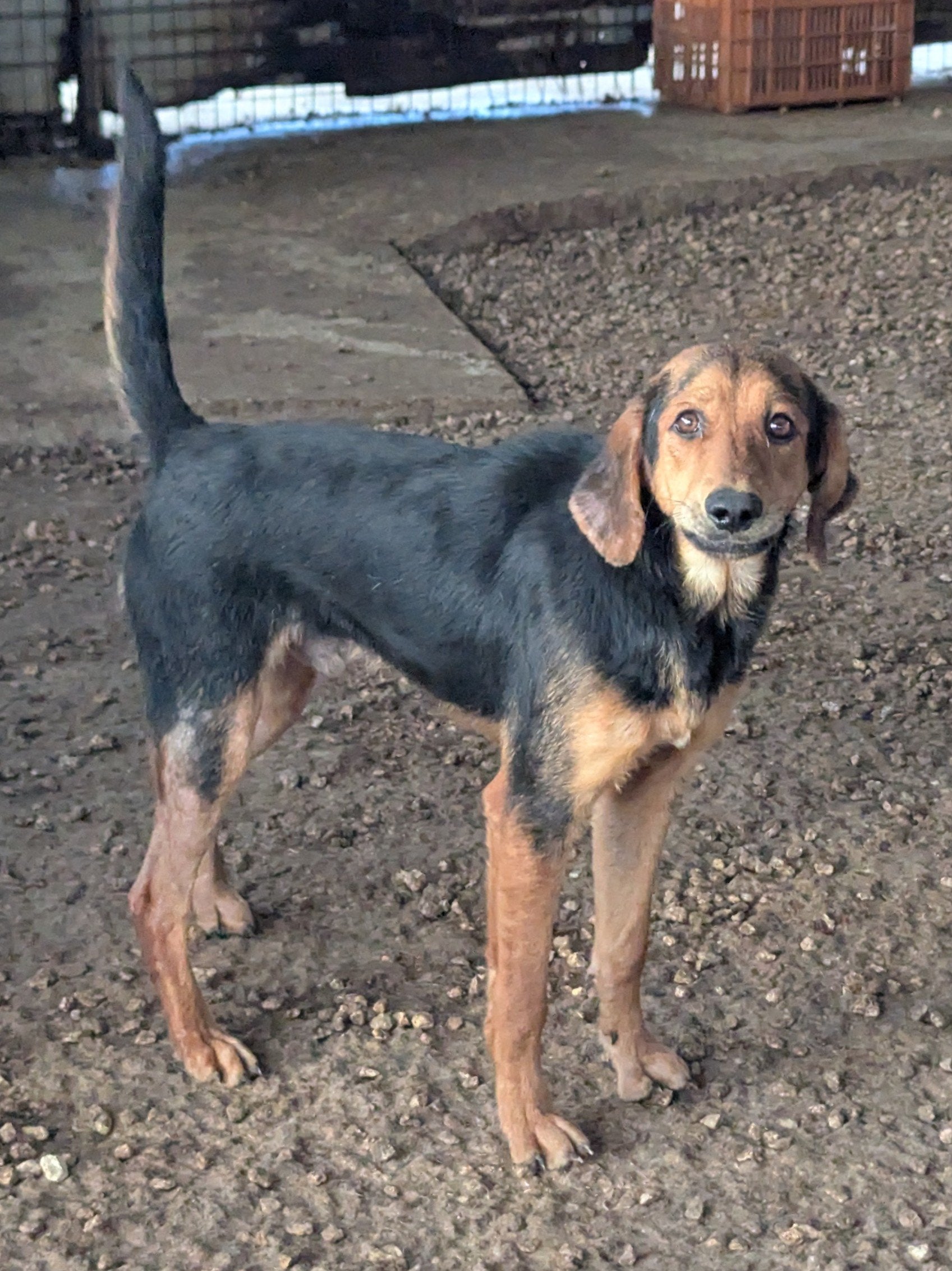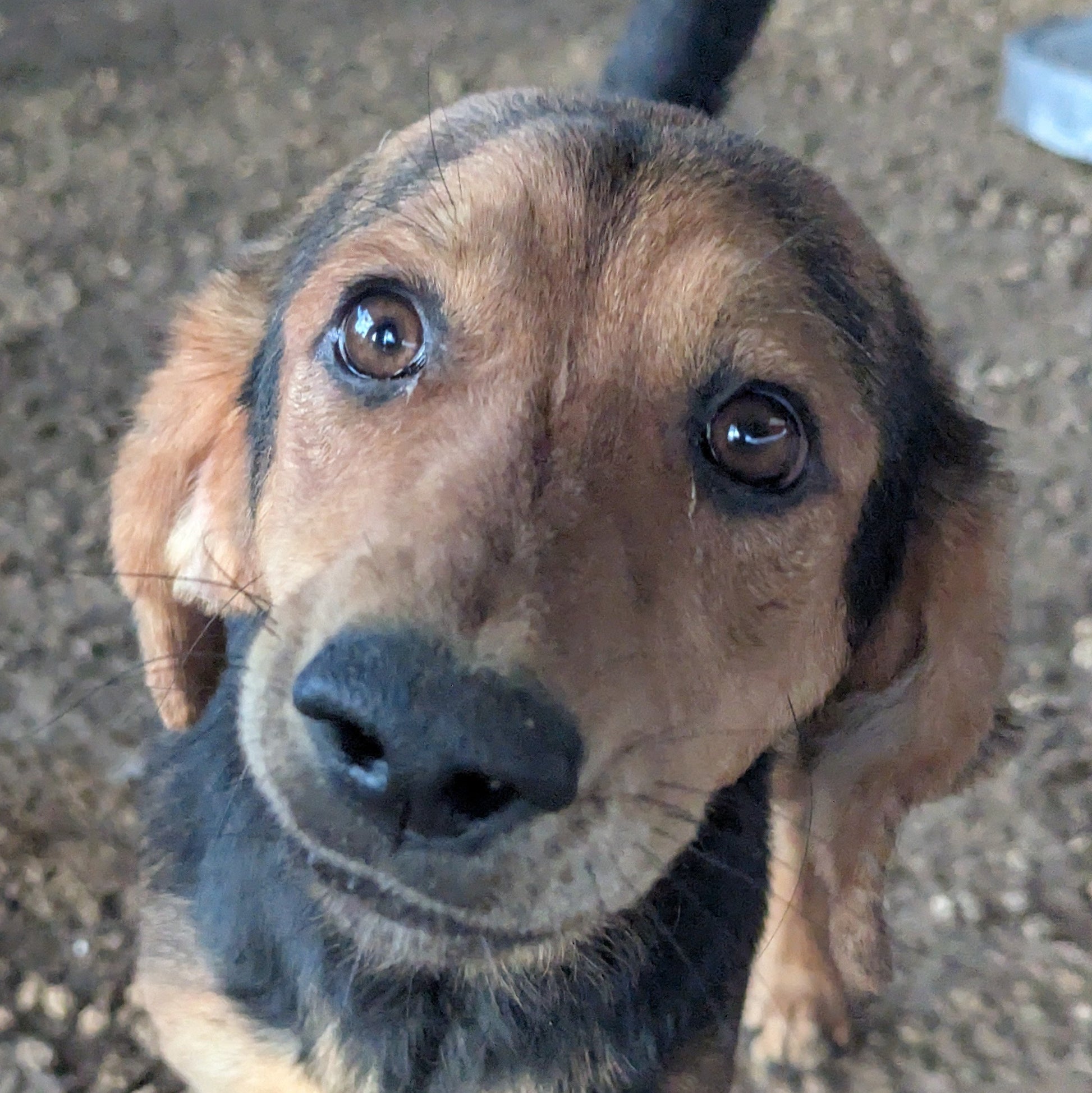 Very young medium-sized mixed breed male. People oriented, very affectionate. Wide-open eyes, permanently surprised. Always looks for attention. Good on lead
