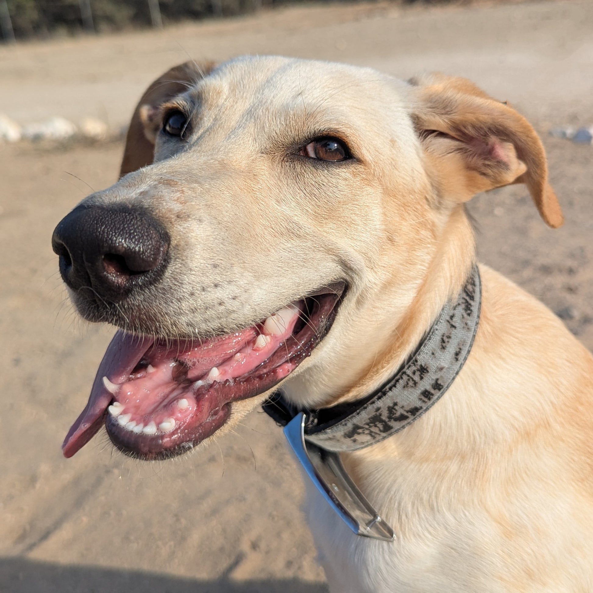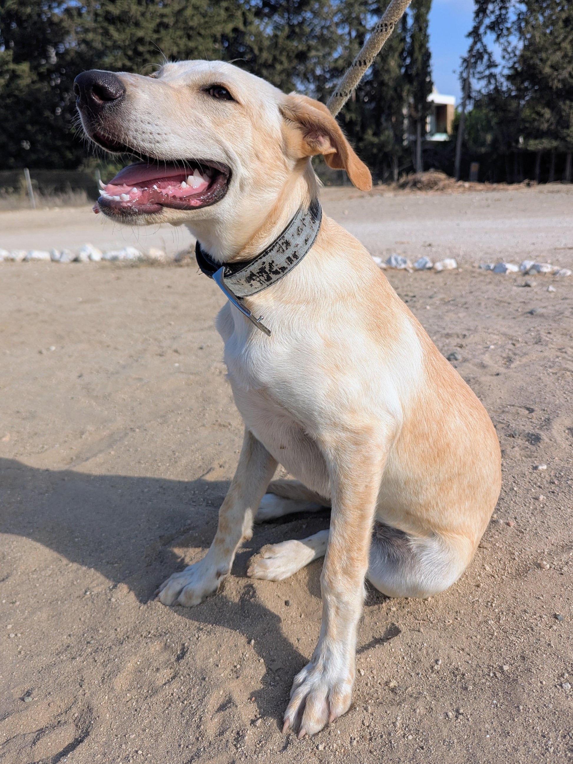 Medium-sized young Labrador cross female, pale coat. Friendly and affectionate. She's still scared by being surrounded by other dogs