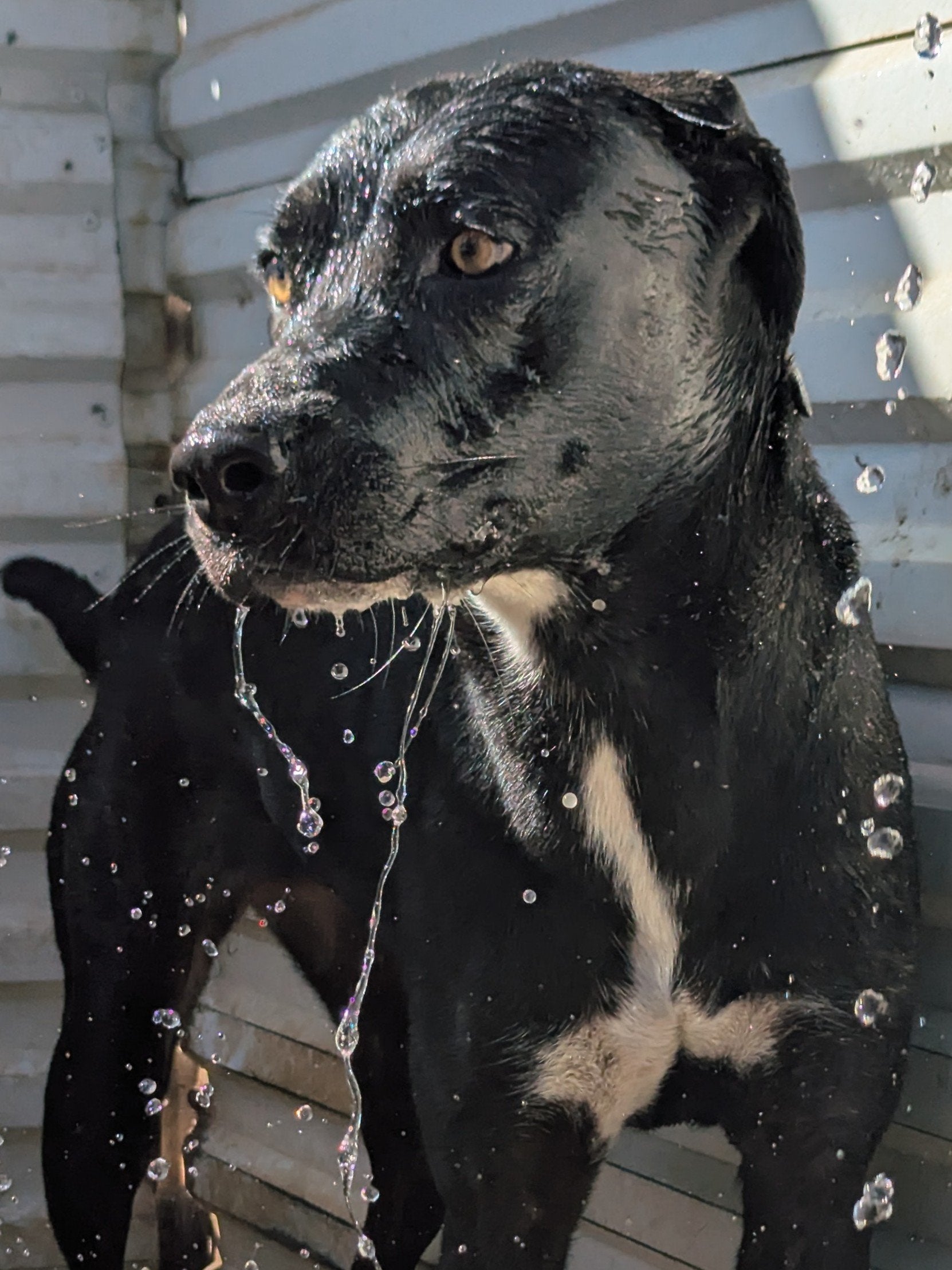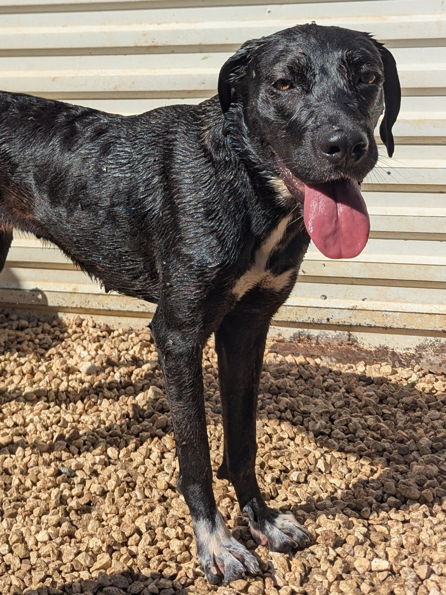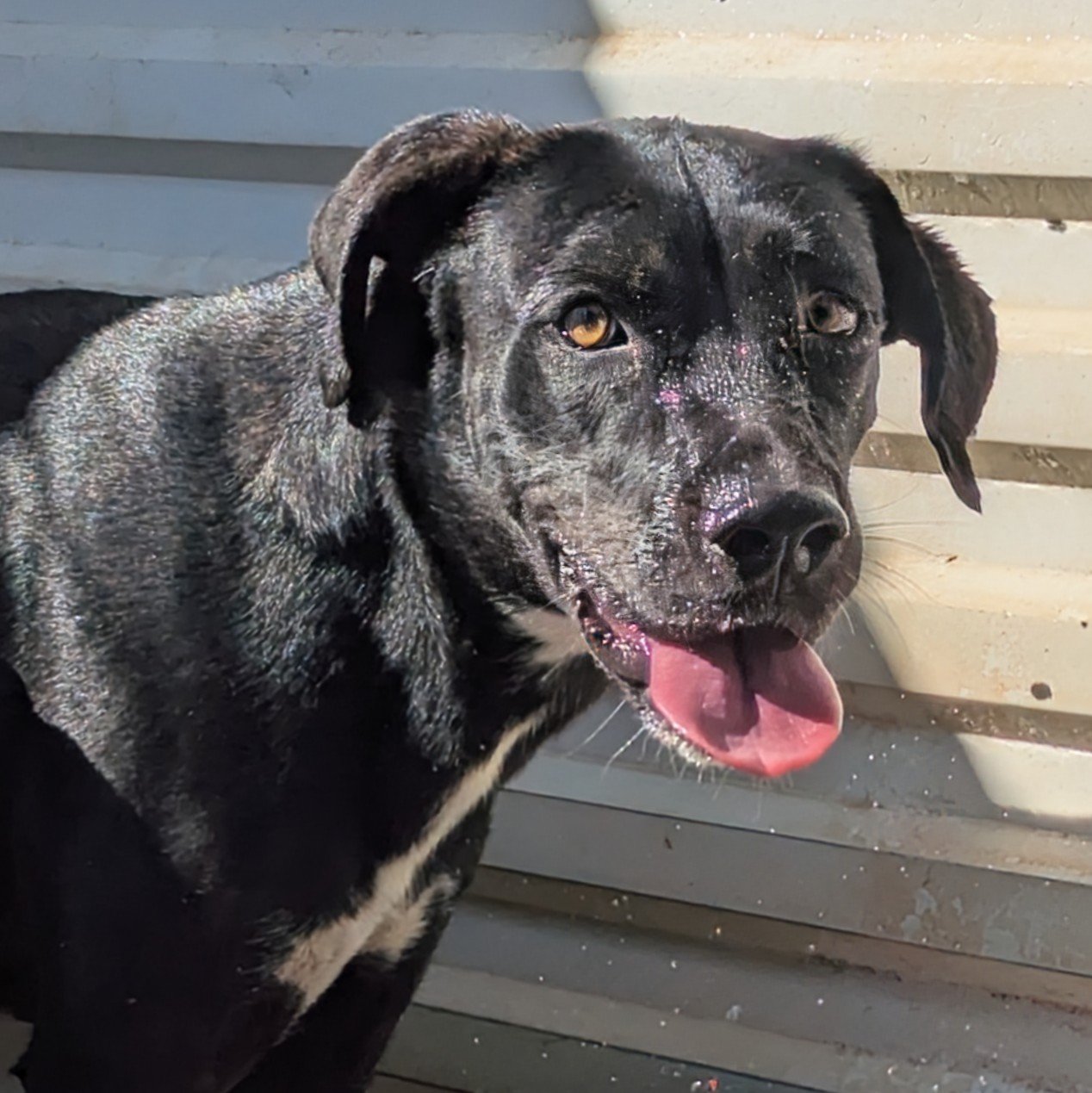 Big-sized young female, black with white patch on her chest. Active, playful, friendly