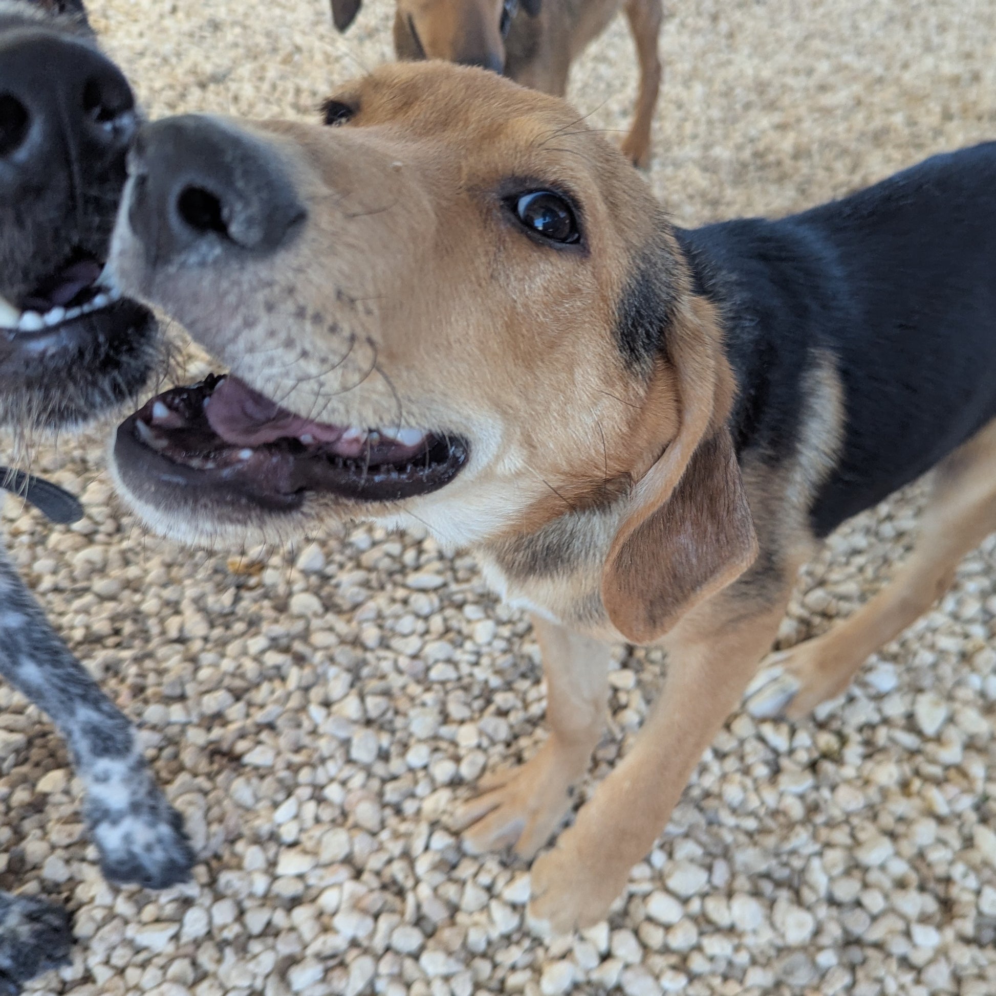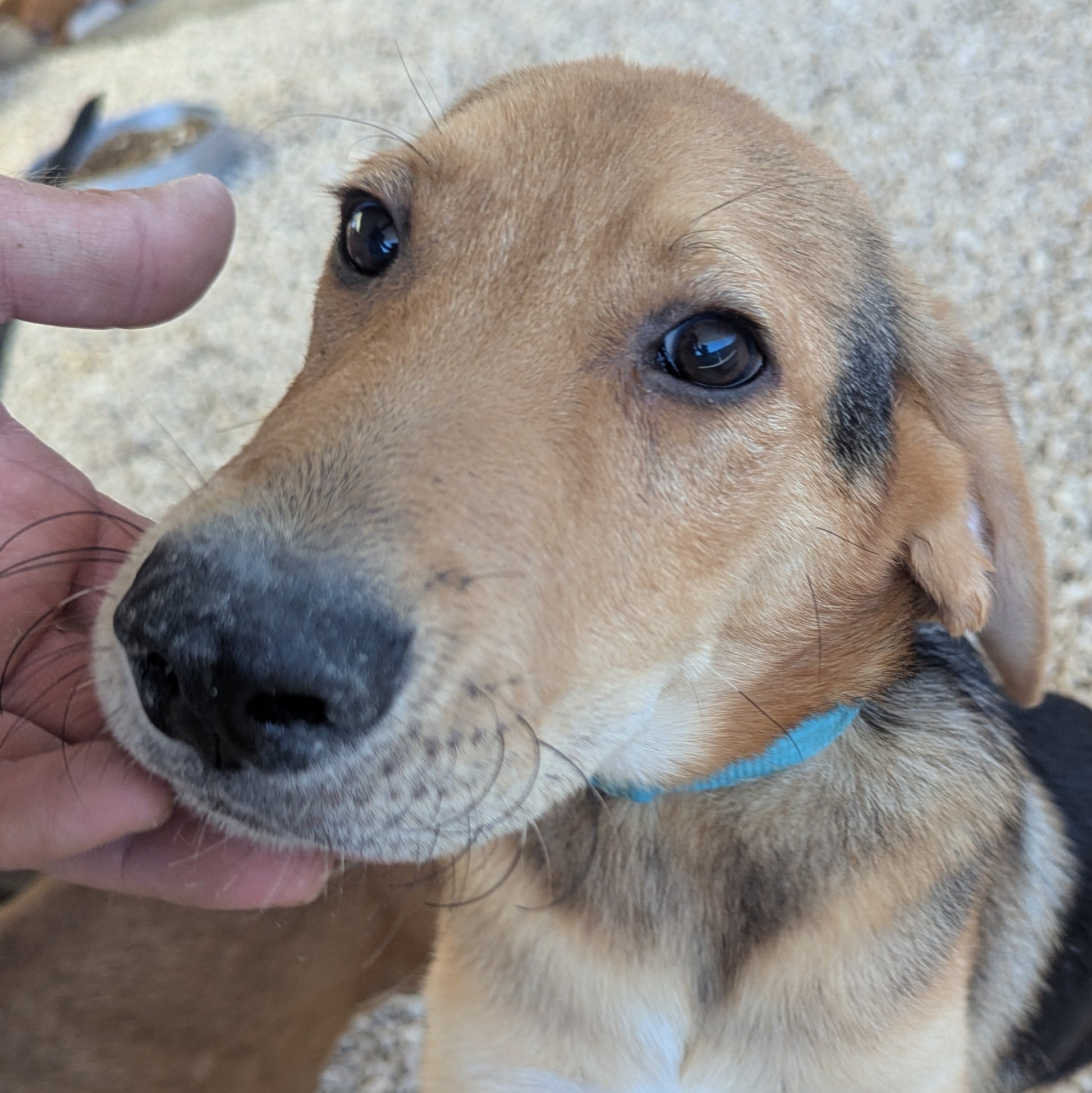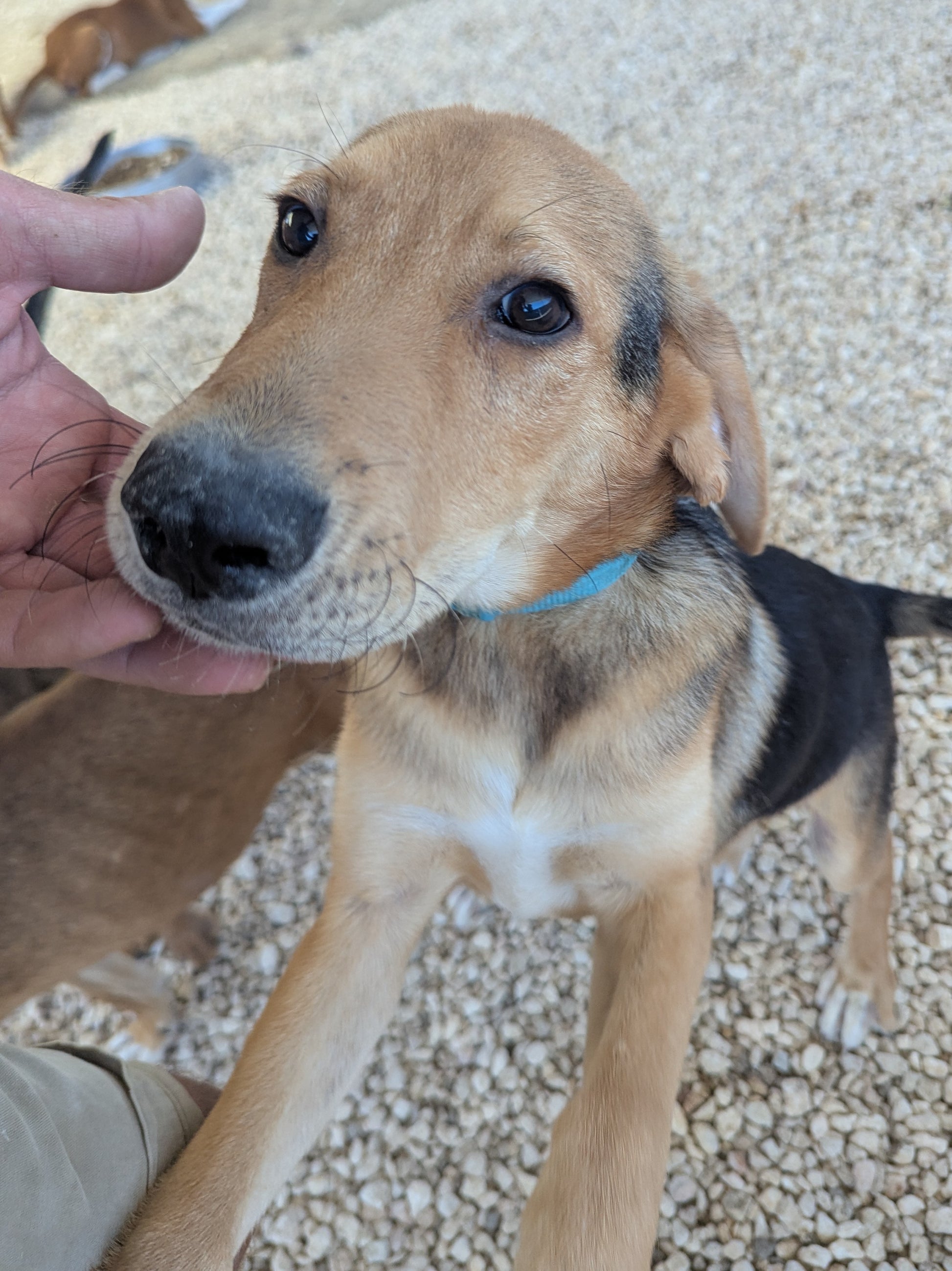 Среднего размера мальчик щенок. Окрас чёрный со светло-коричневым и белым. Пытается доминировать с другими собаками, даже более старшими. Дружелюбен к человеку