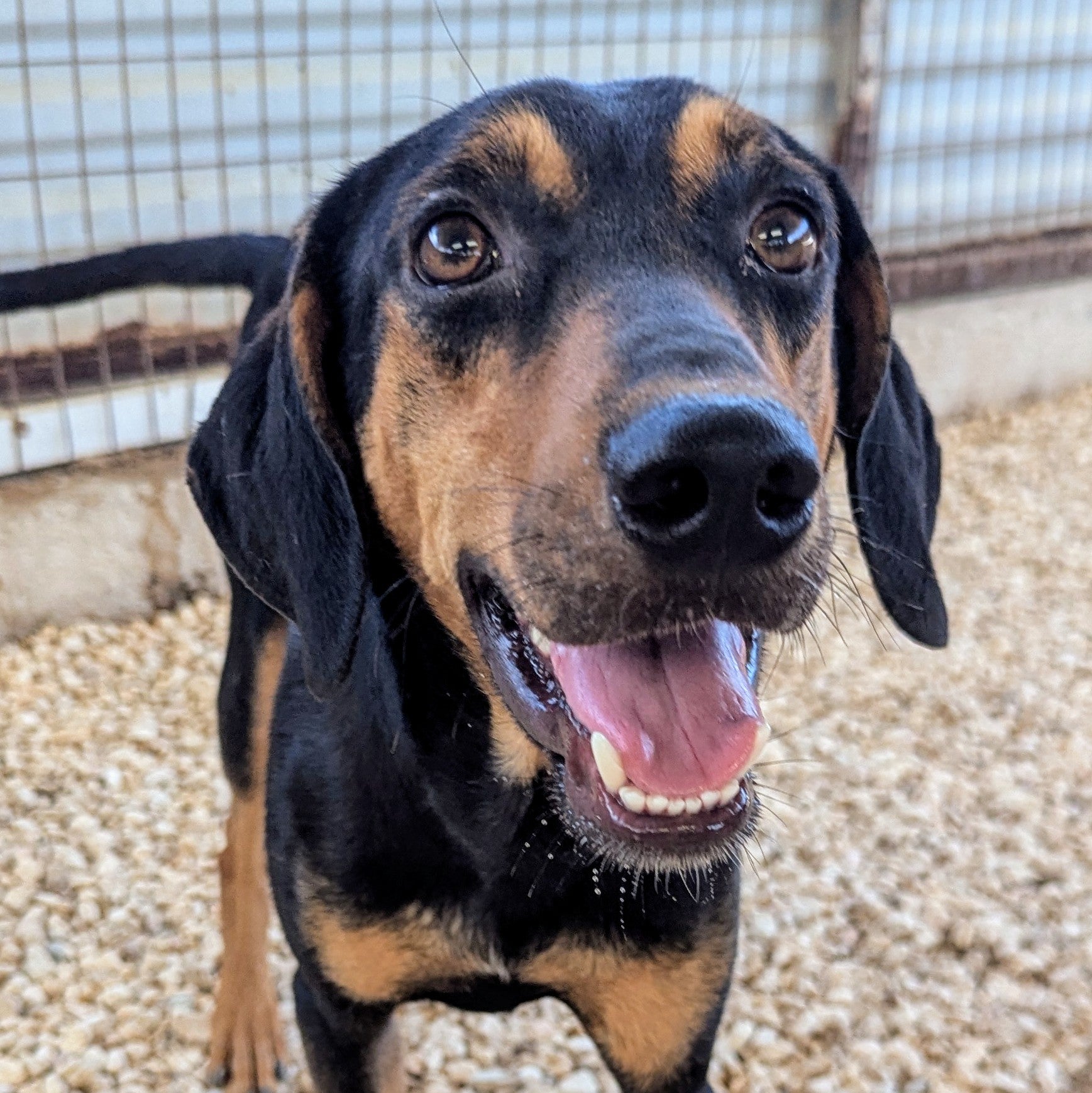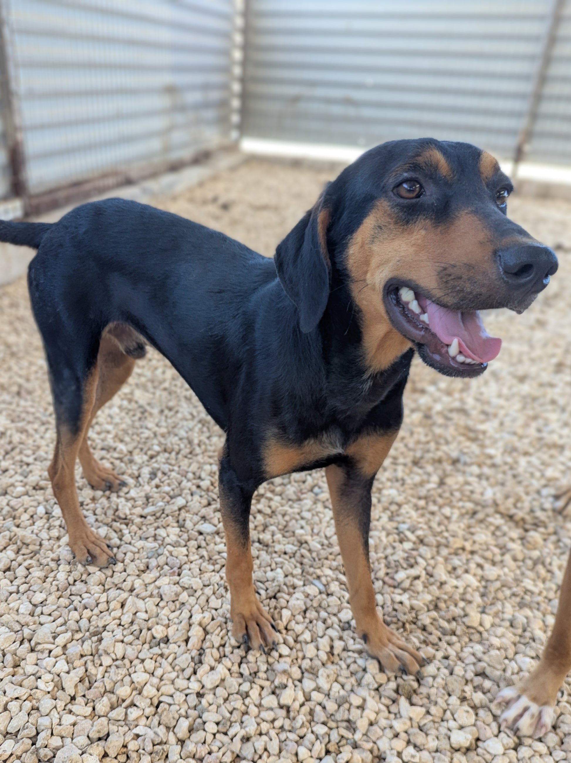 Среднего размера мальчик метис охотничей породы чёрного с рыжим окраса. Высокий, стройный, худощавый. Дружелюбен к человеку