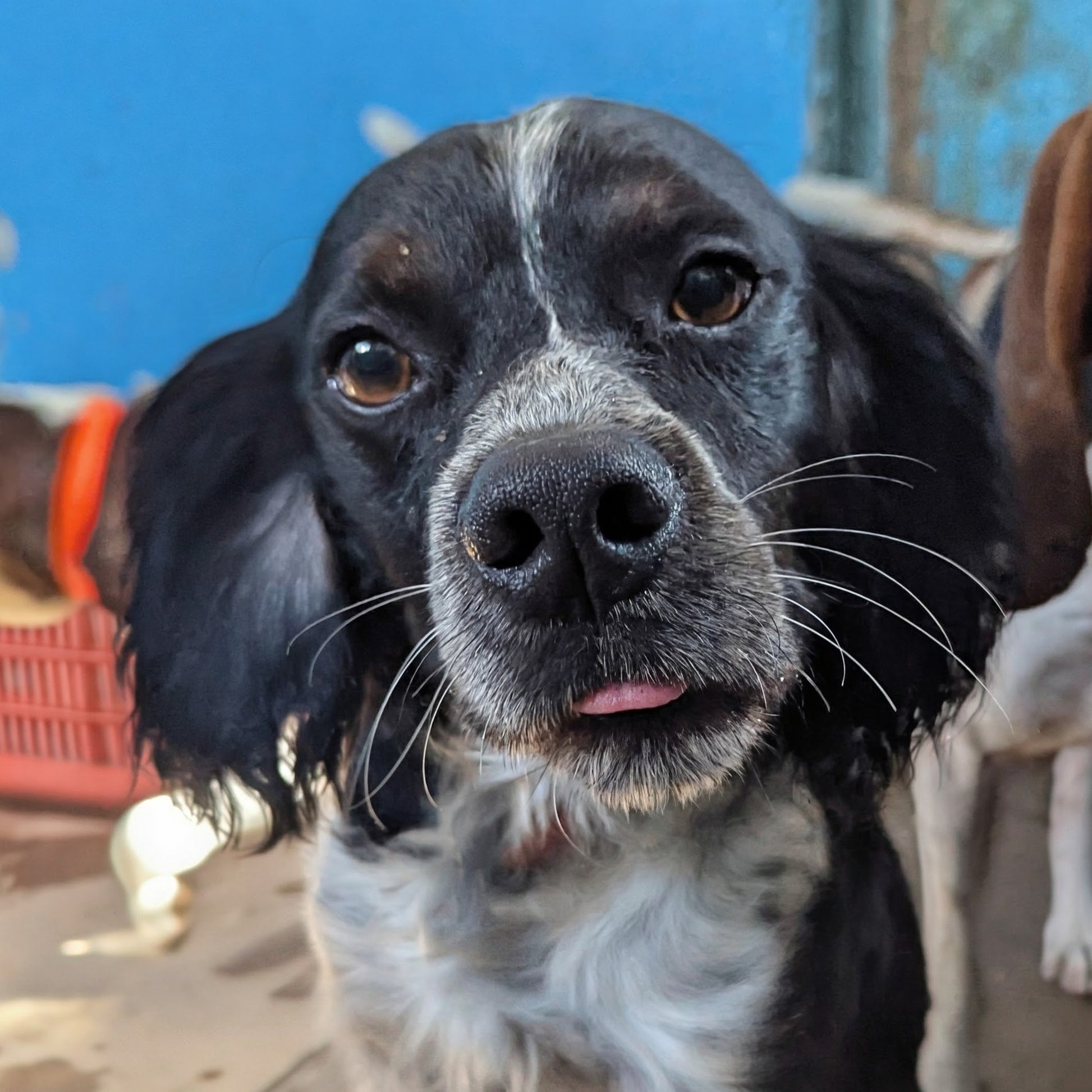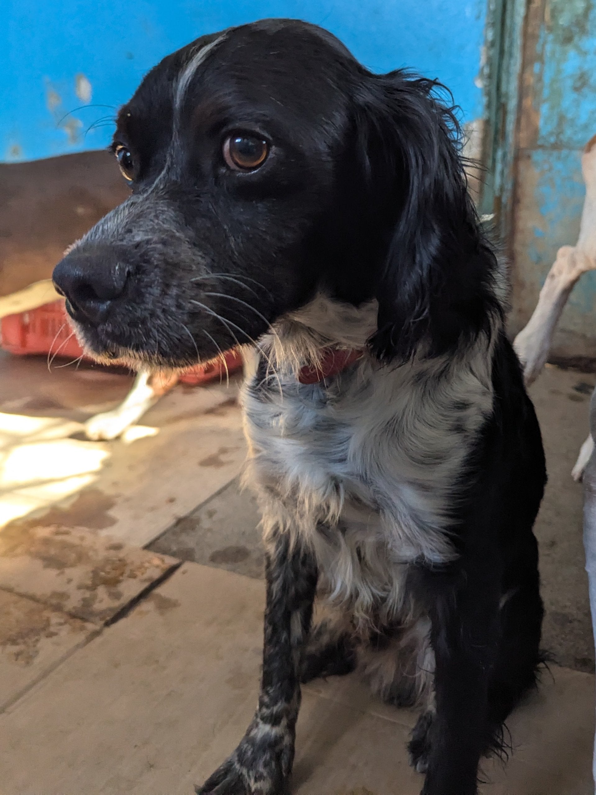 Small to medium-sized Spaniel cross male, black with little white. Friendly and affectionate with people