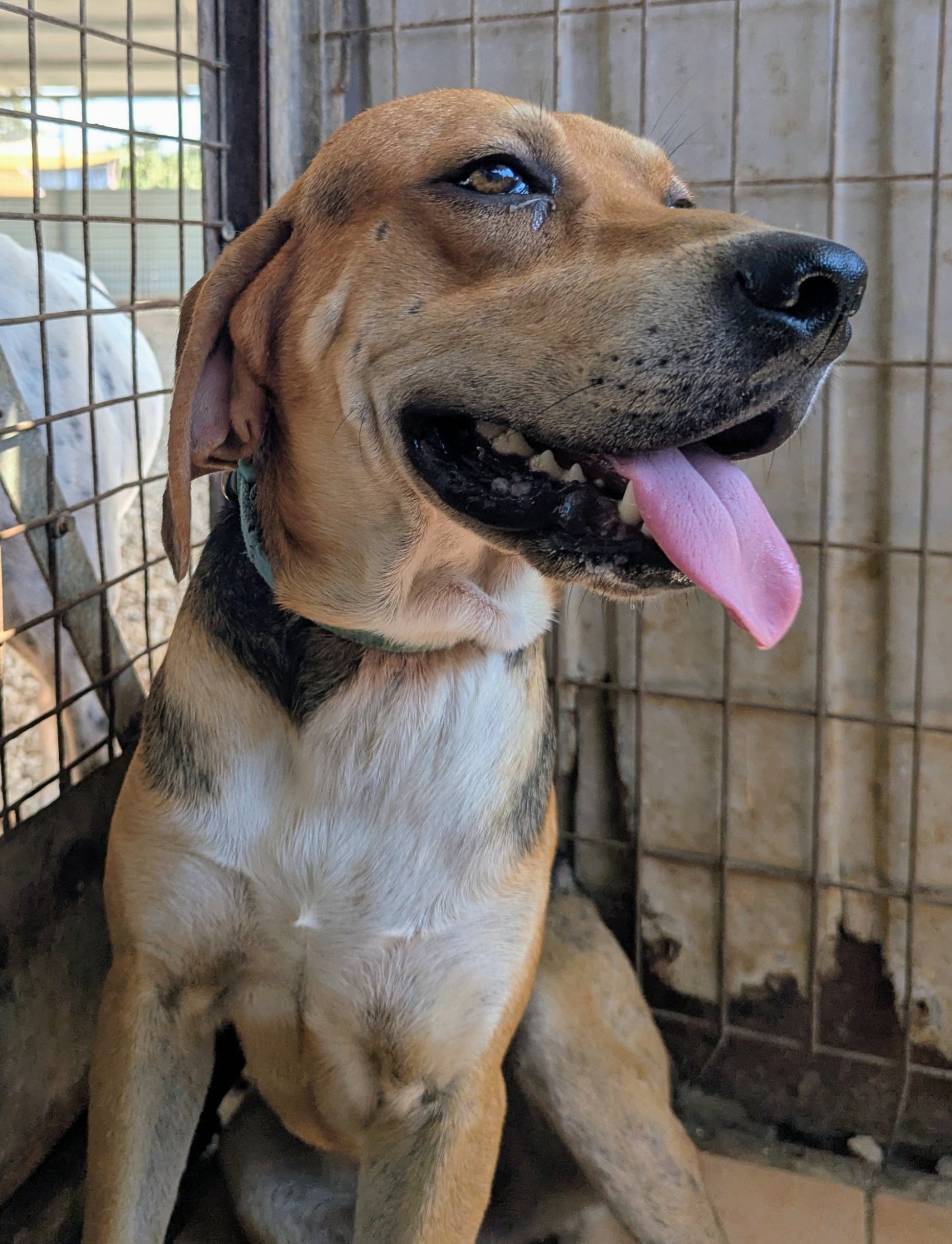 Medium-sized young male, tan with black and little white. Affectionate and friendly. Curated by our wonderful volunteer Elena