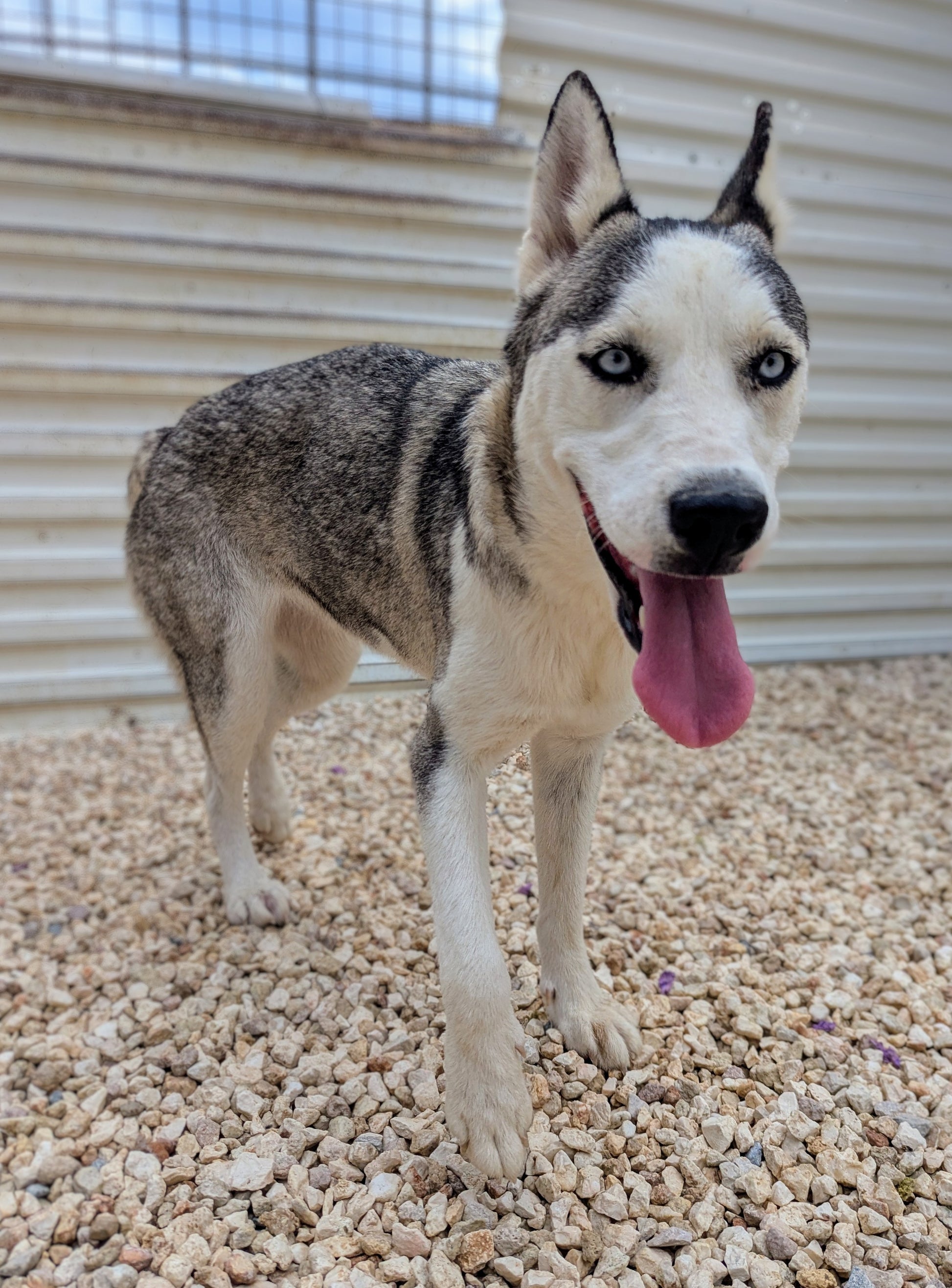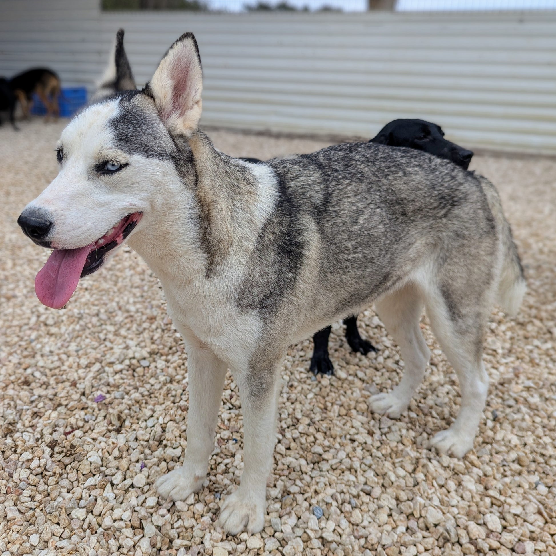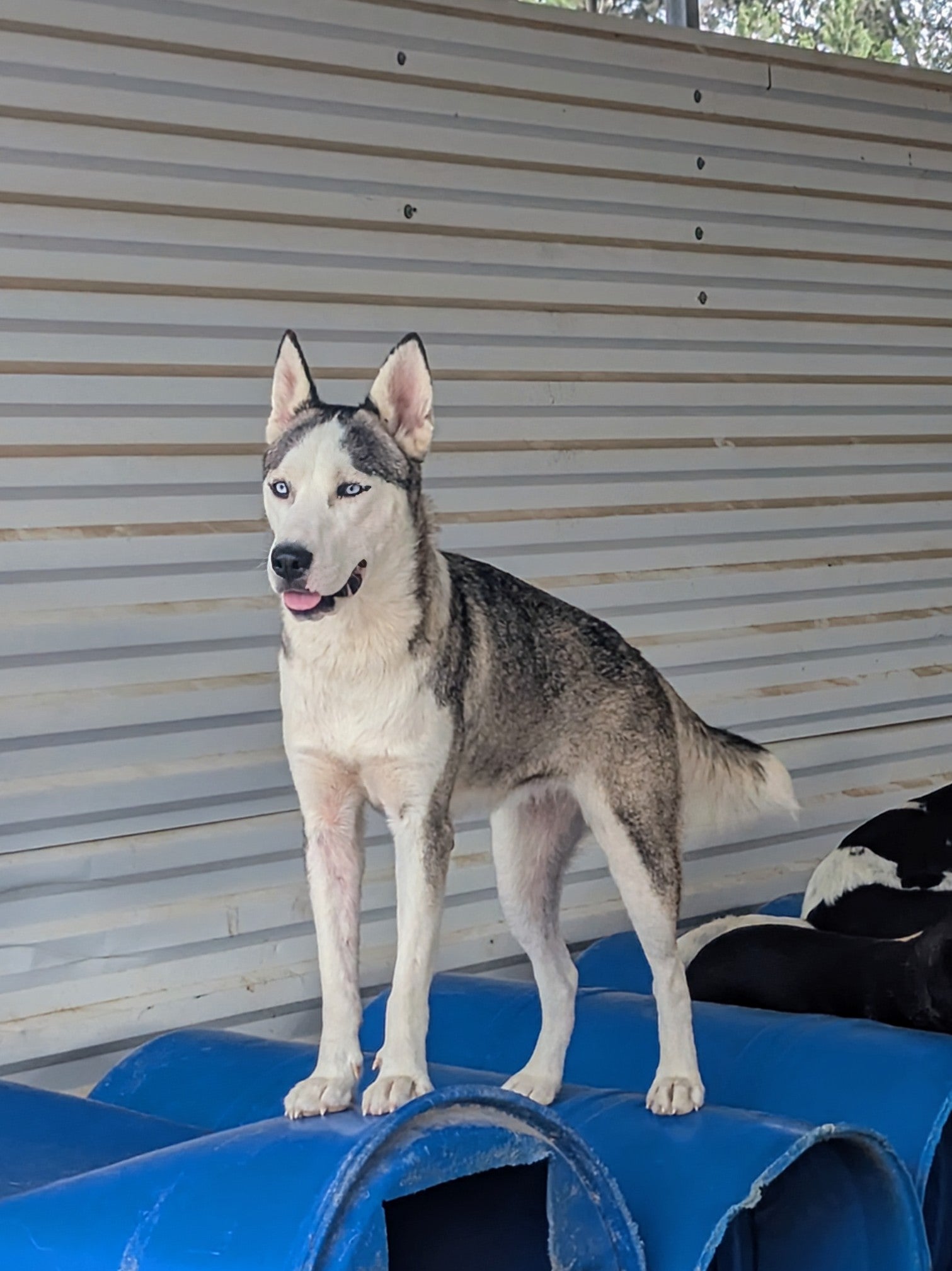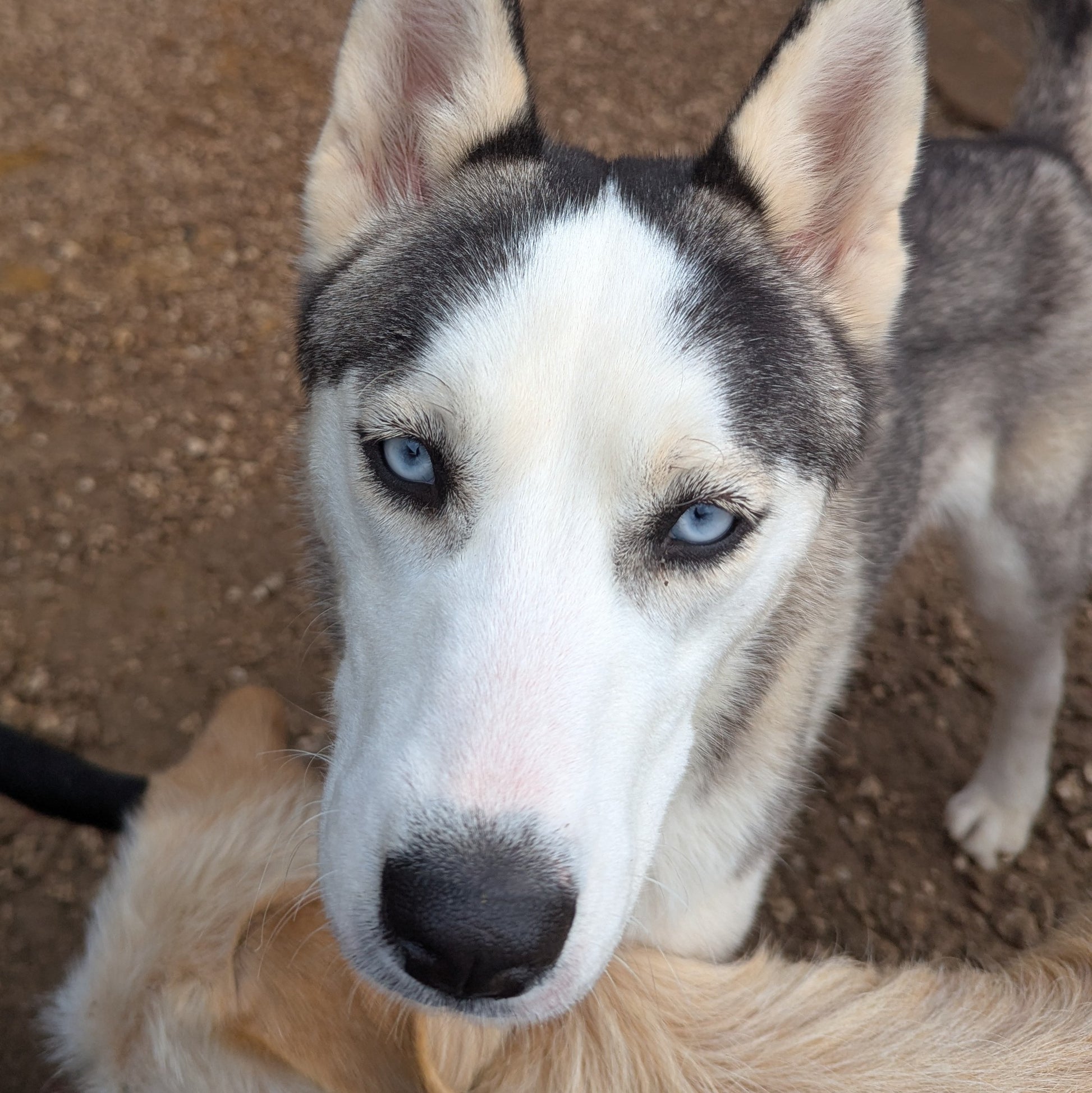 Молодая некрупная девочка хаски с голубыми глазами. Бывает задиристой с другими собаками, и сама подвергается атакам. Очень активна на прогулках. Не любит кошек