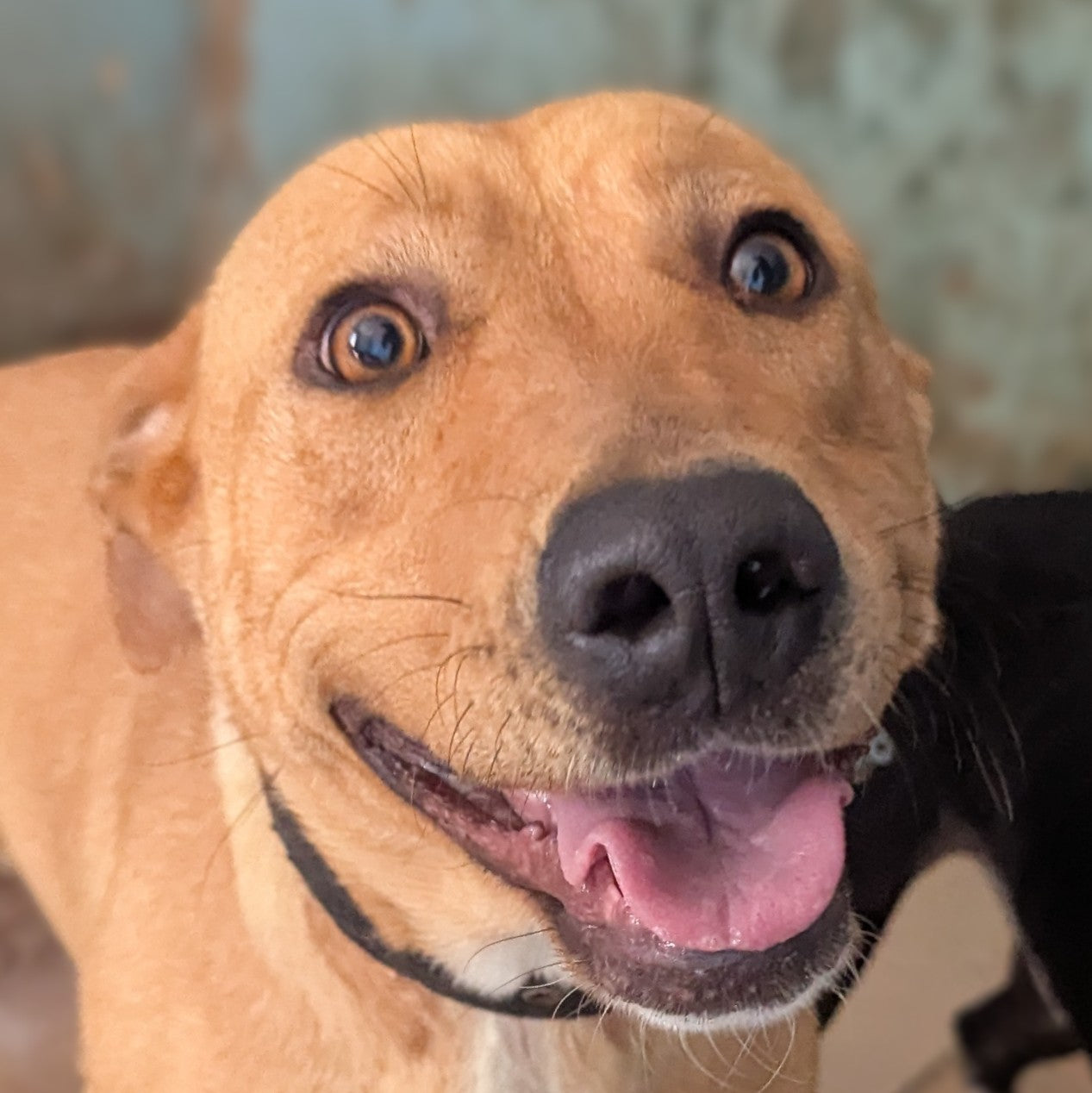 Среднего к крупному размера девочка золотистого окраса с белым пятном на груди и пальцах всех лап