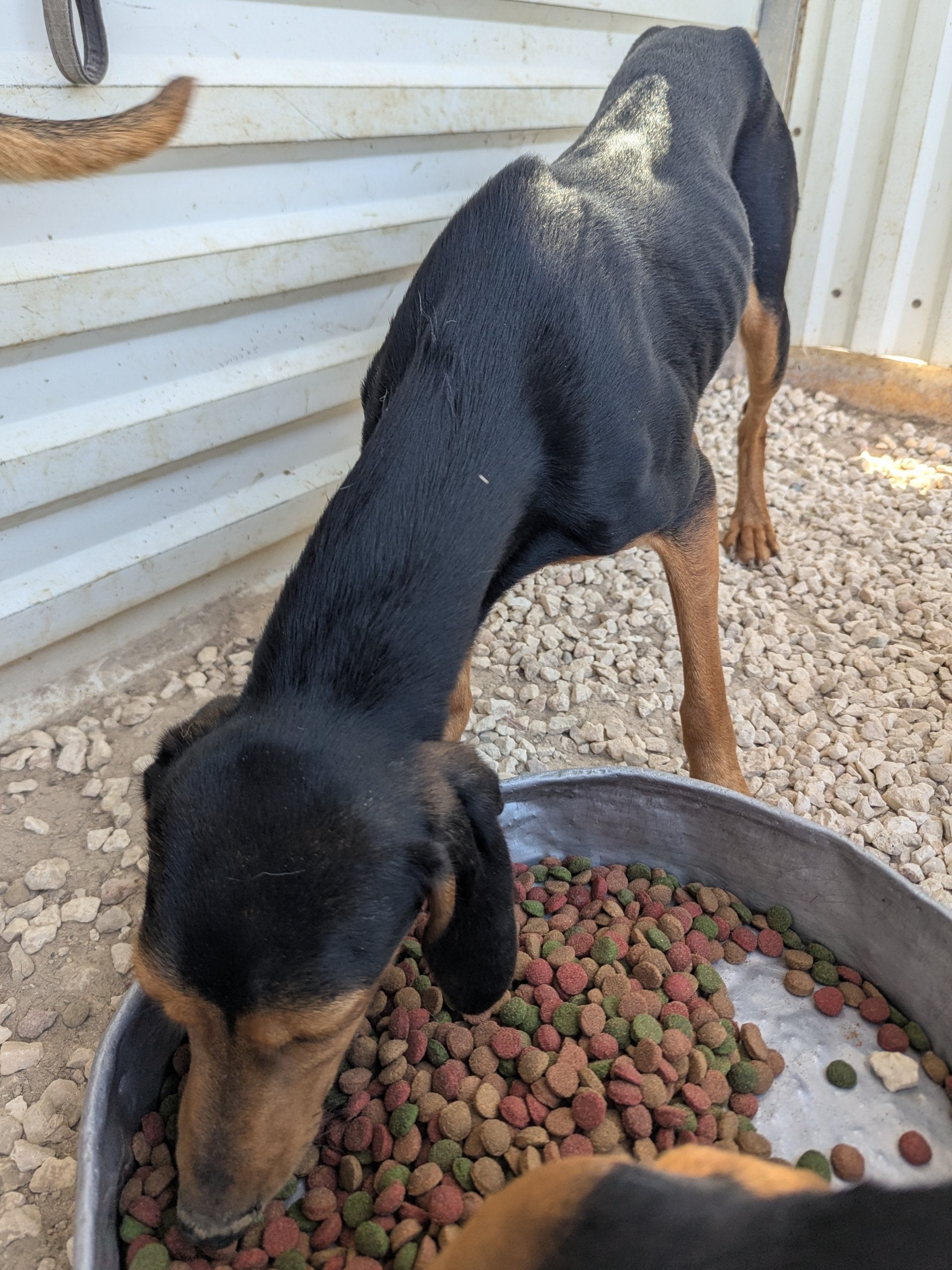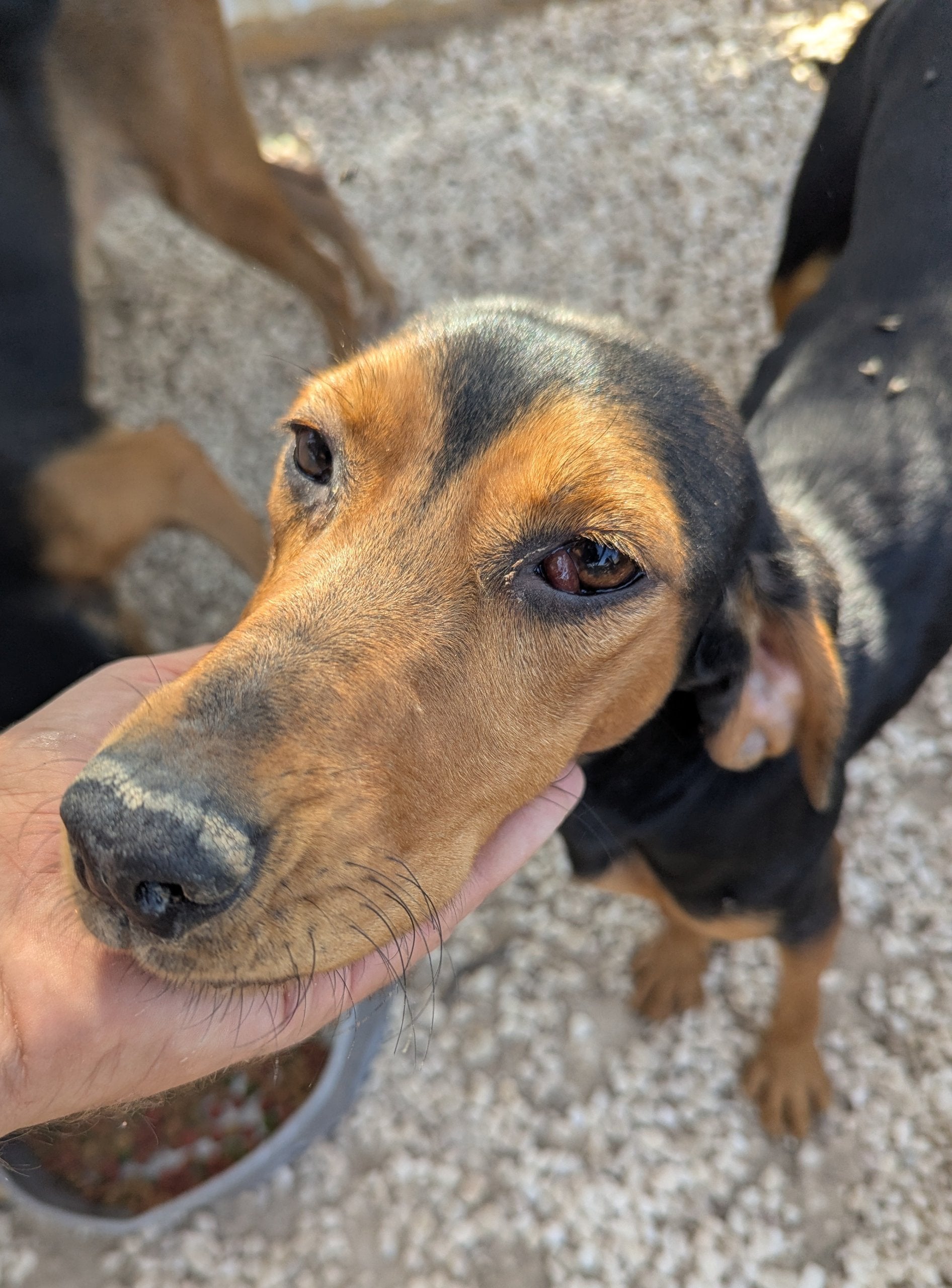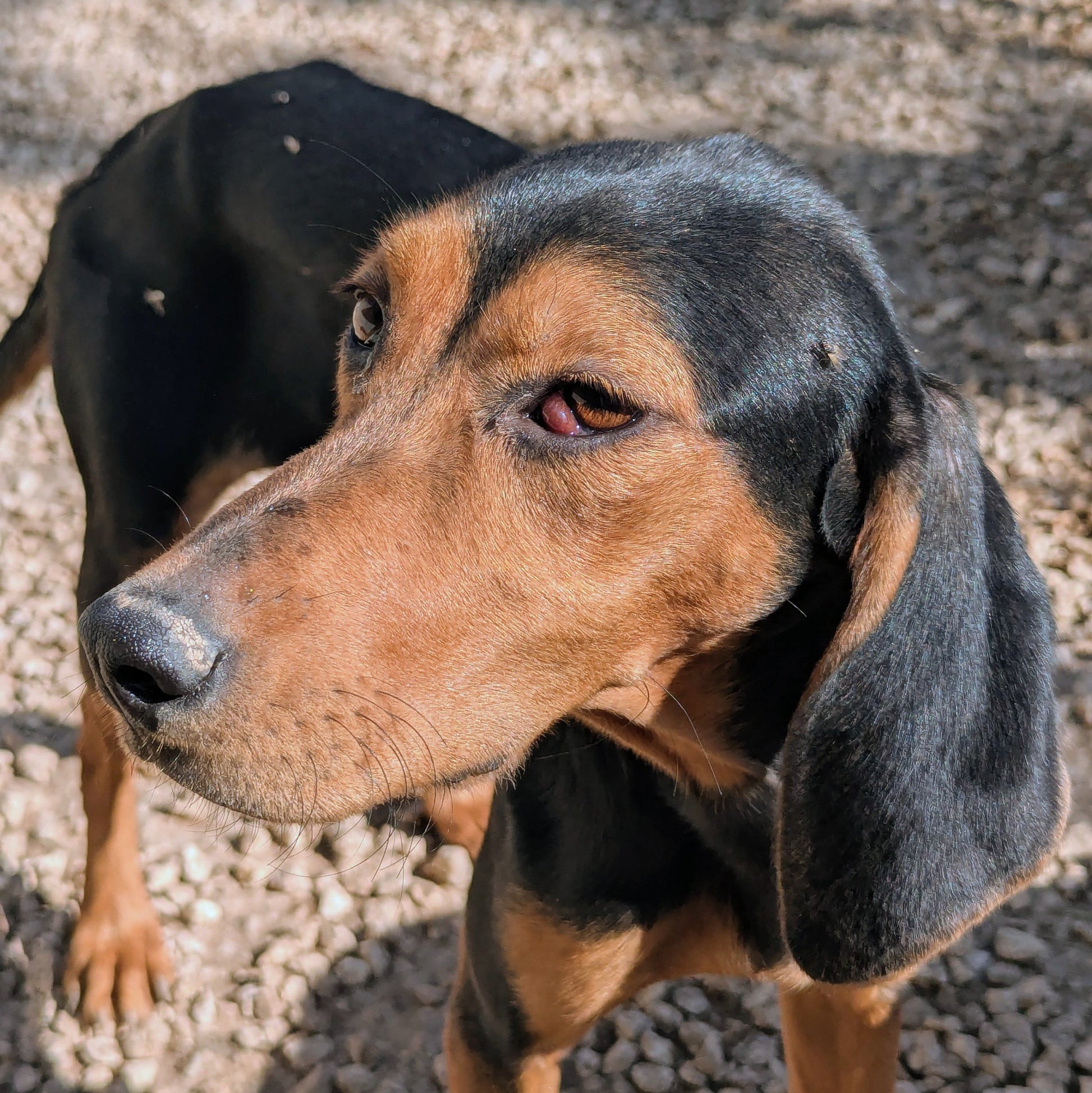 Small to medium-sized young hunting cross female, black and tan. Very skinny, and suffering of a cherry eye