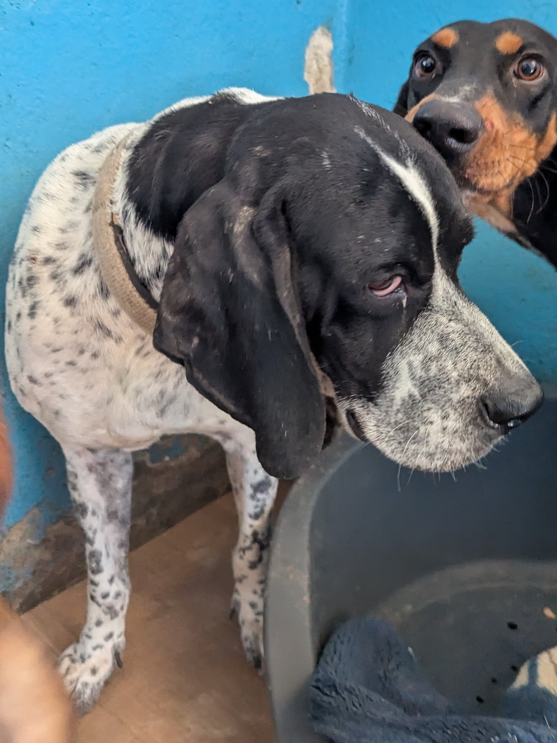 Среднего размера мальчик пойнтер. Окрас белый с чёрным и мелкими серыми пятнами