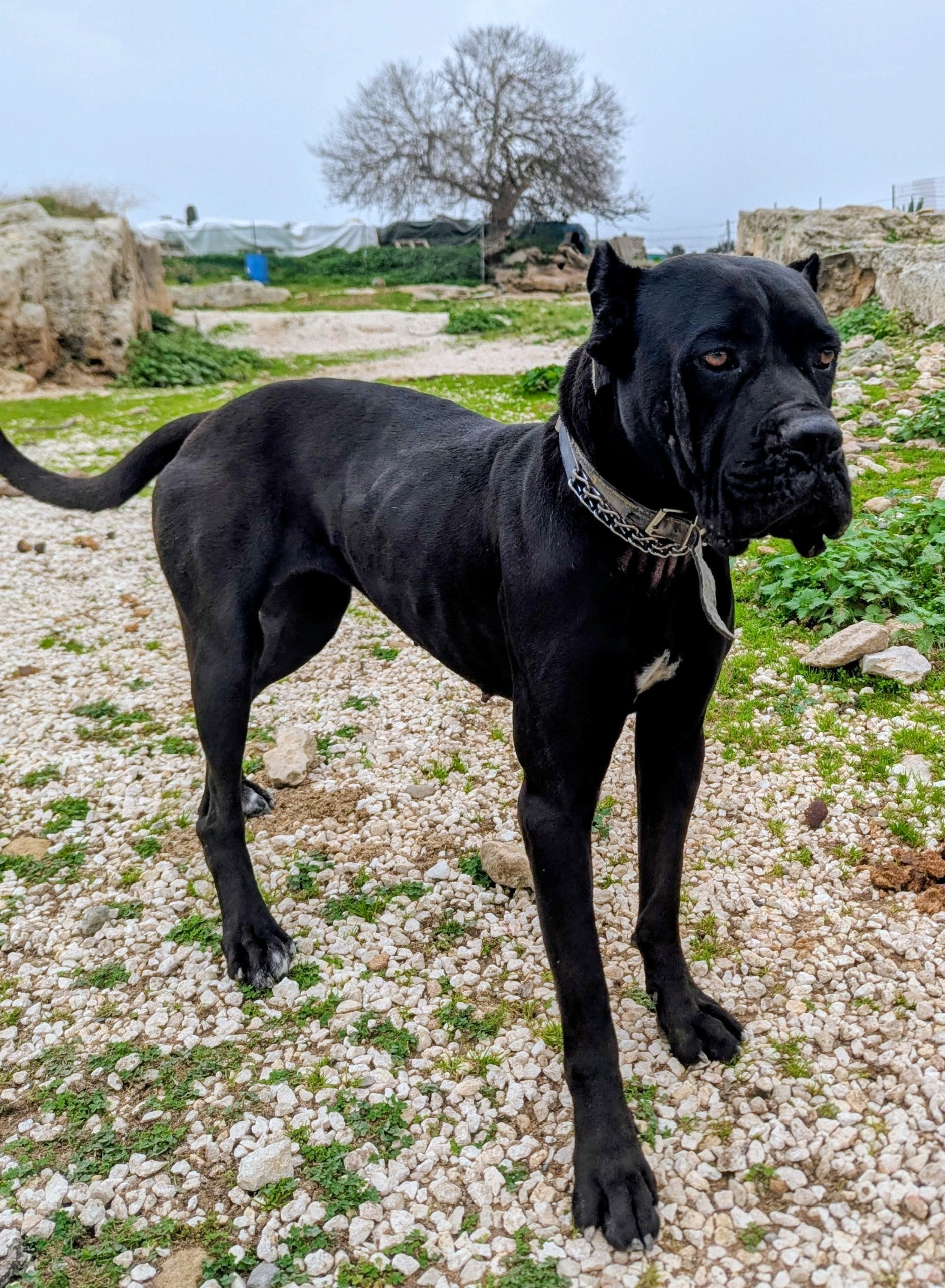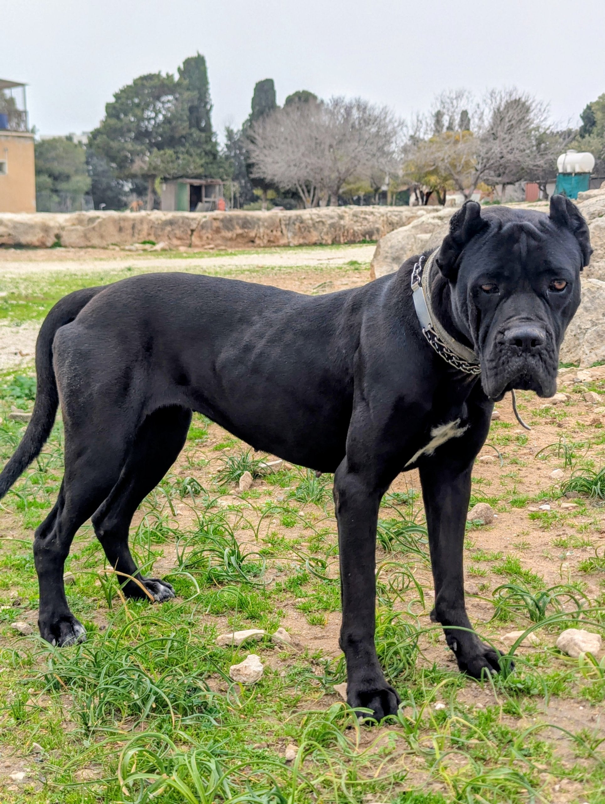 Big-sized young Cane Corso female, black with white patch on her chest. The ears are cropped, and the tail is left intact