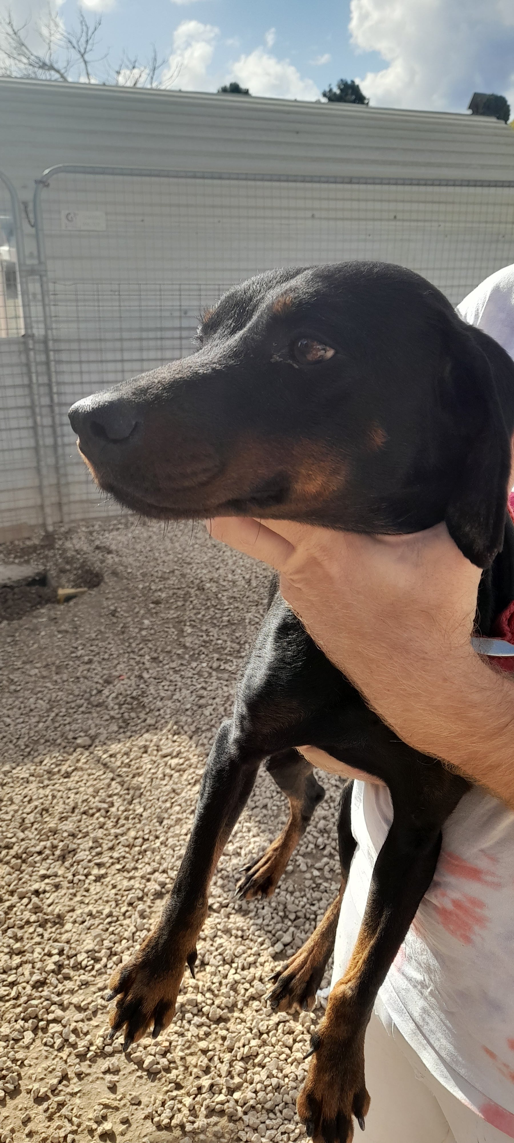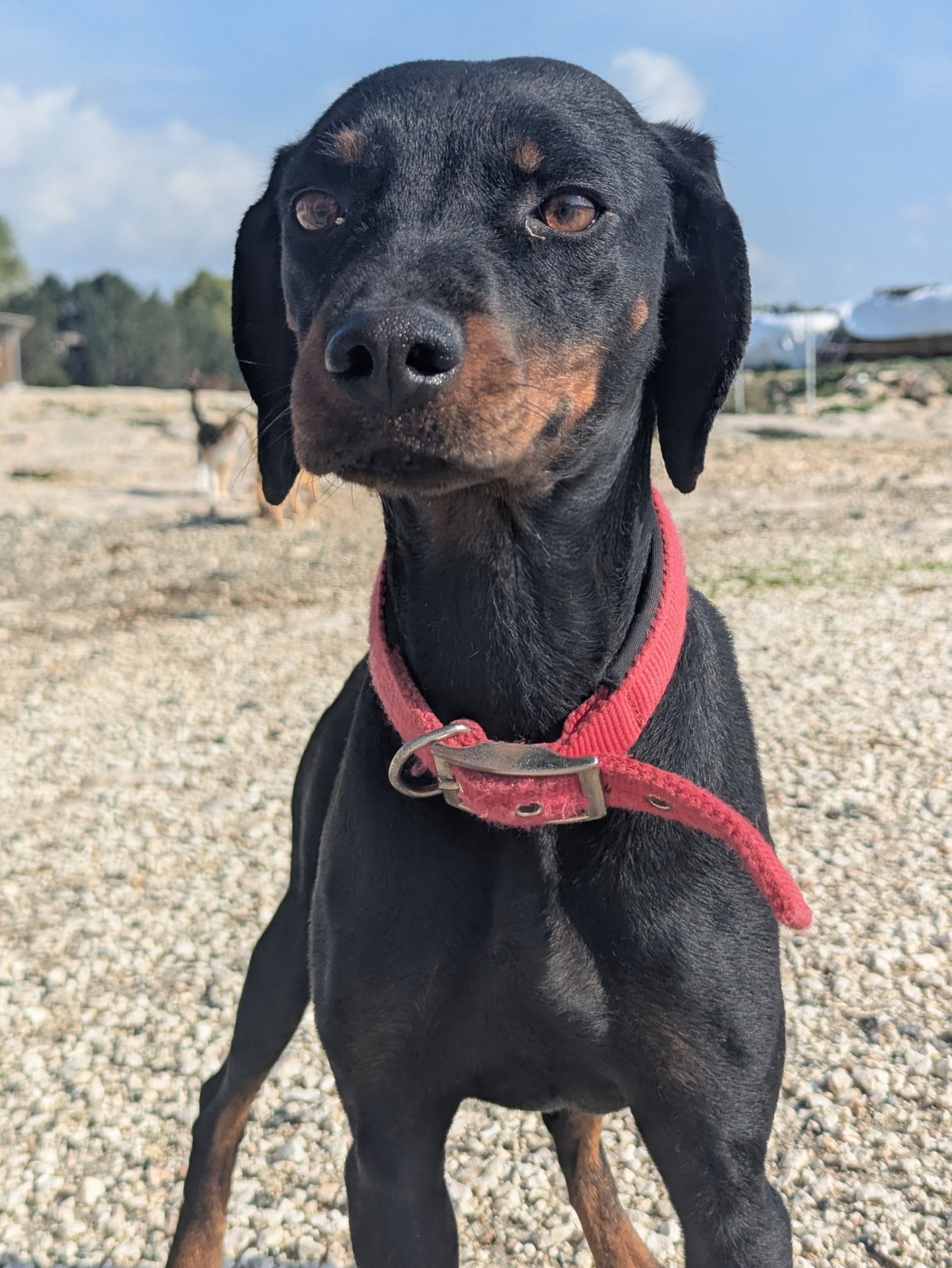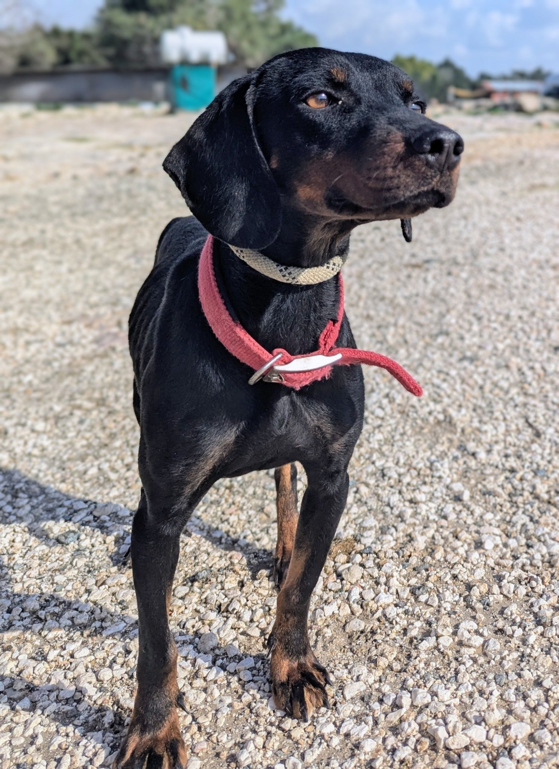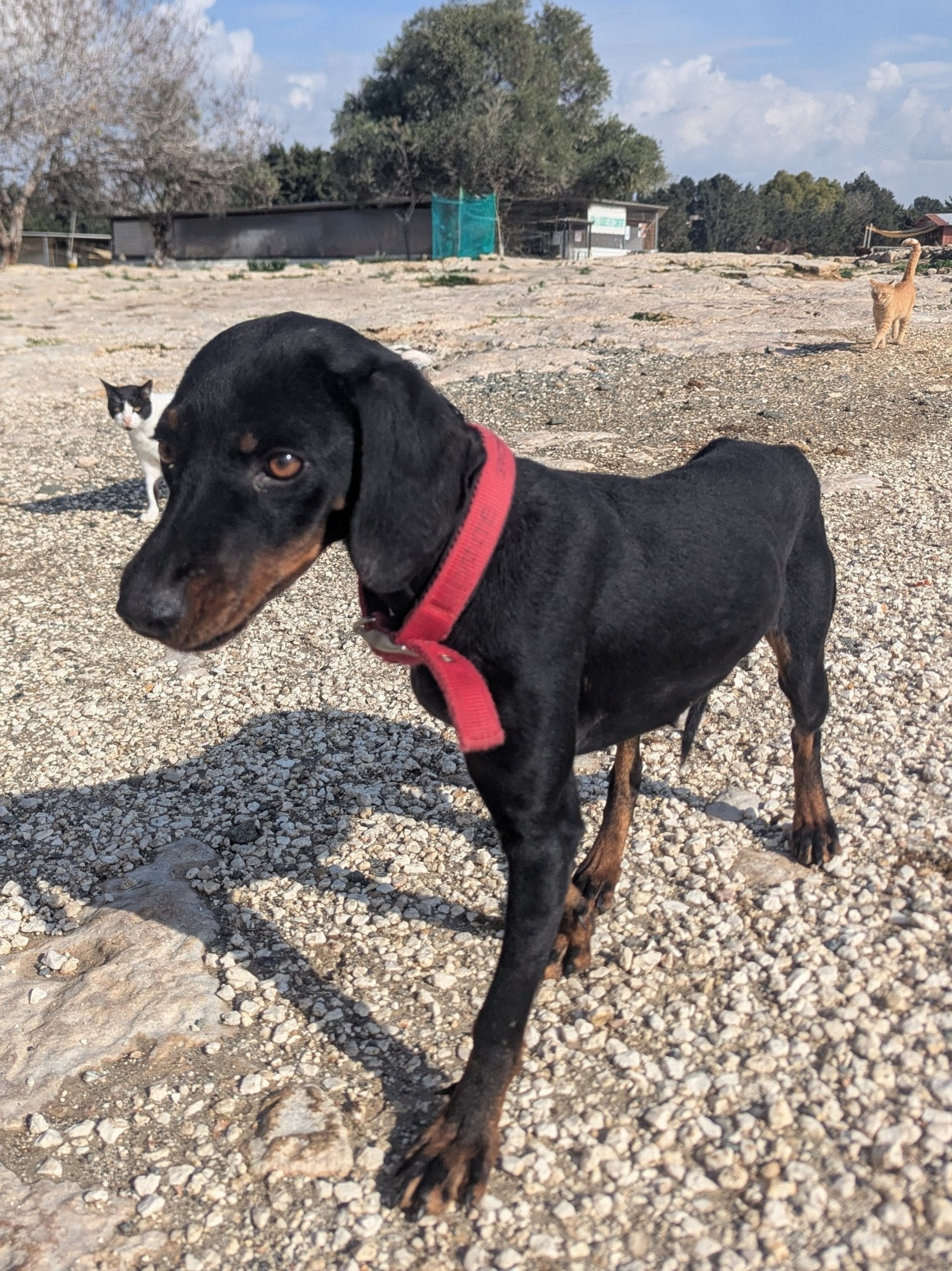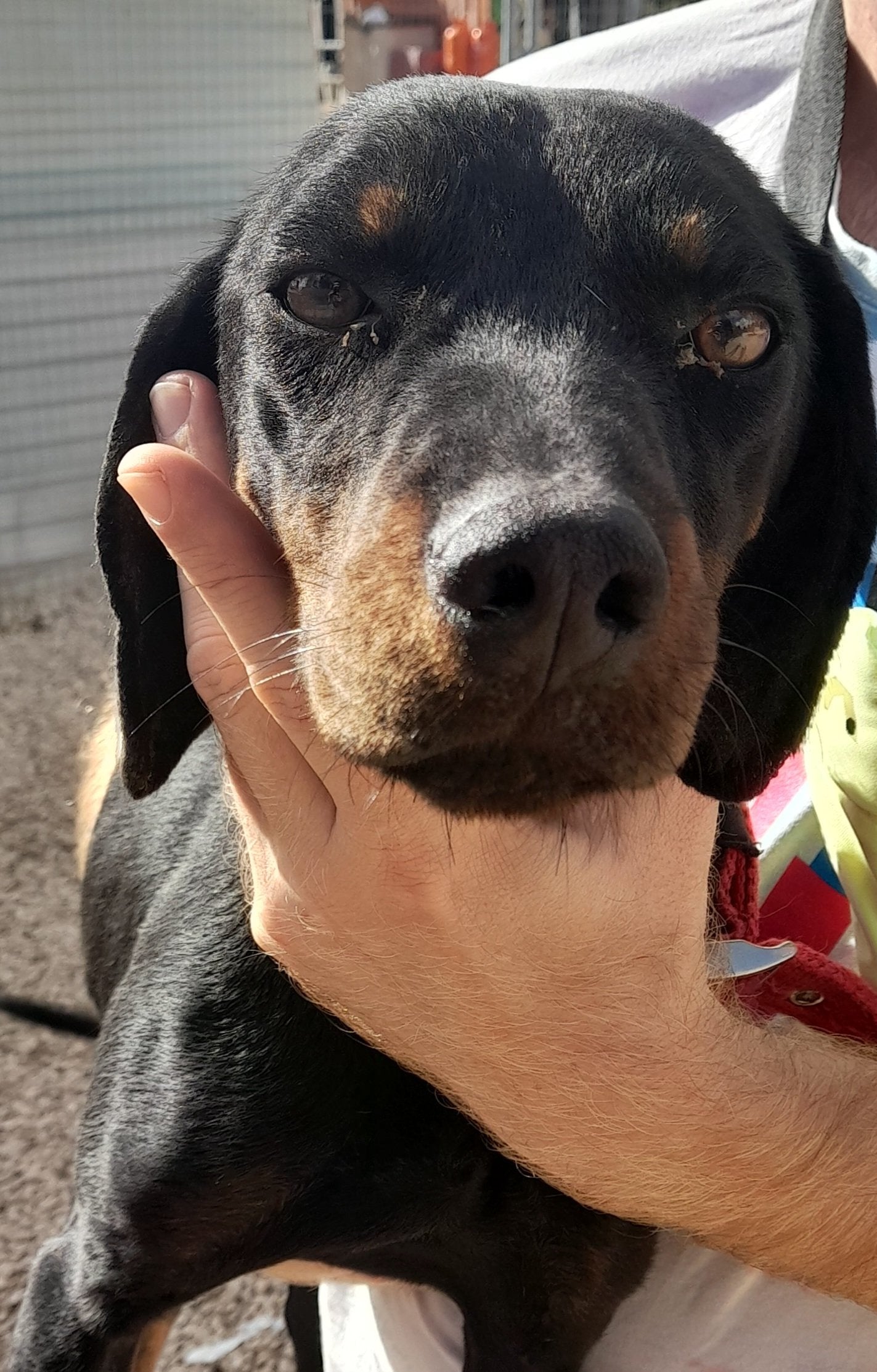 Black medium-sized girl with very little tan. Short hair. Friendly, came to shelter malnourished at Christmas.