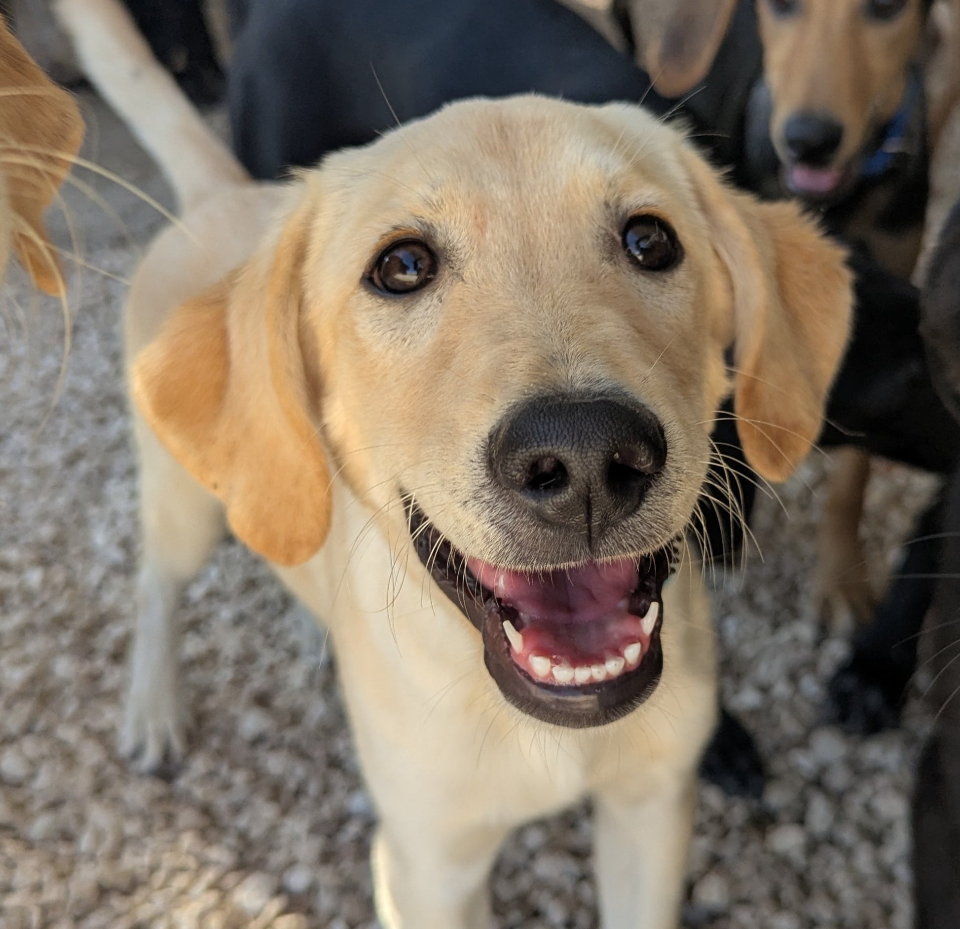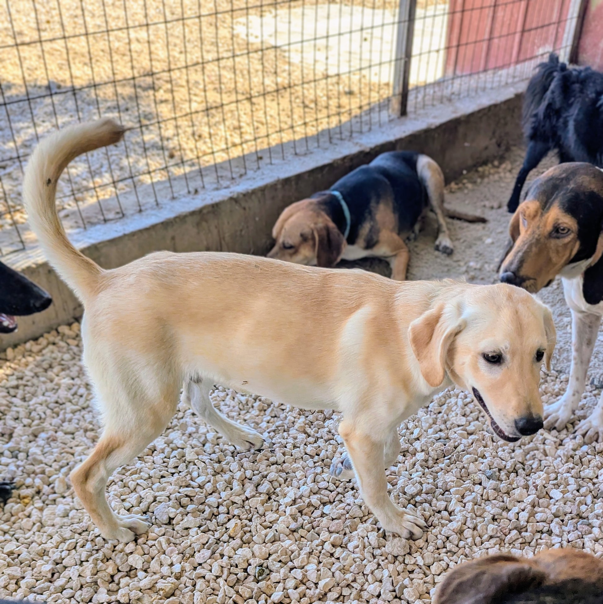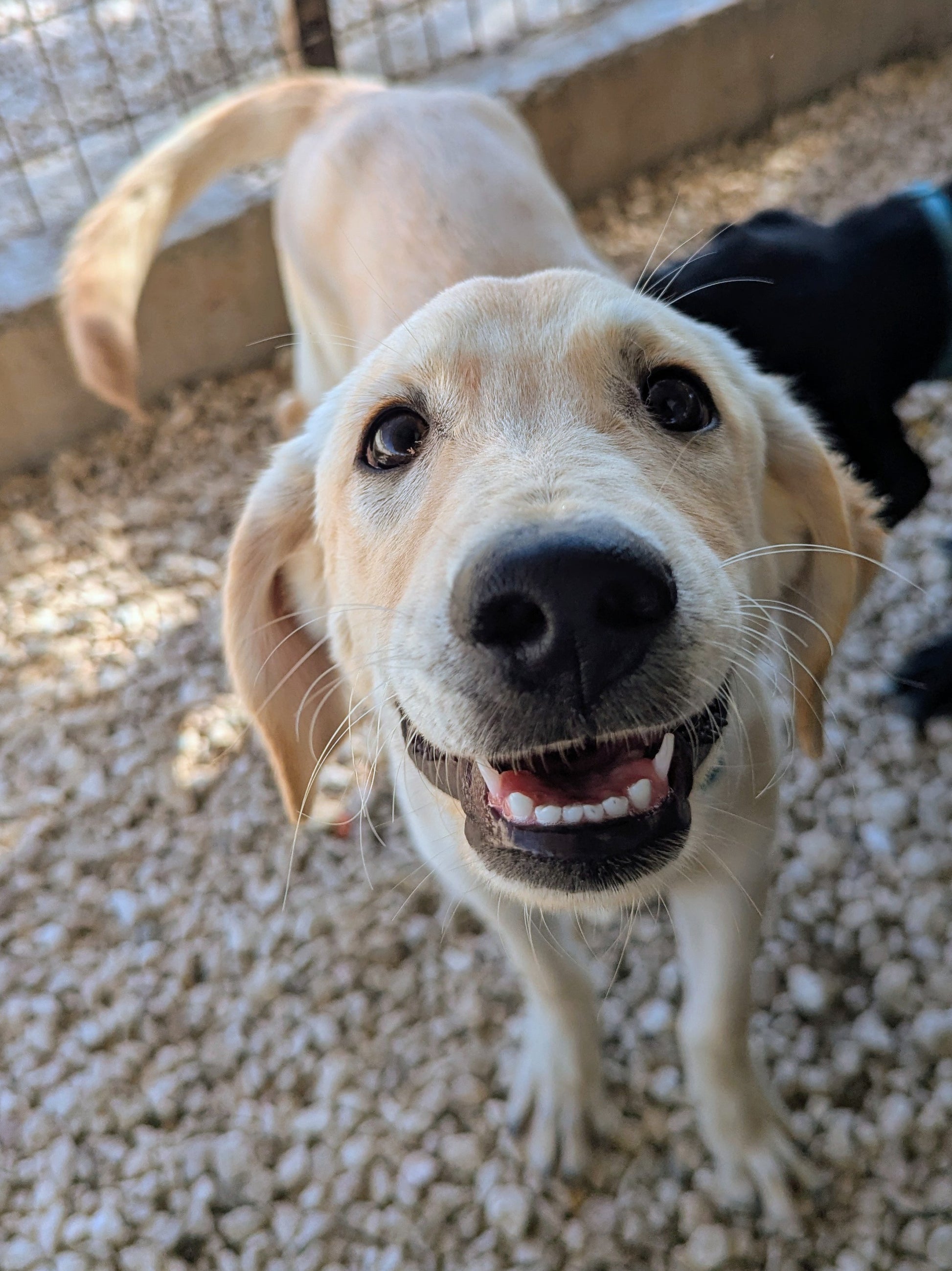 Medium-sized young pale Labrador cross puppy. Very playful and friendly