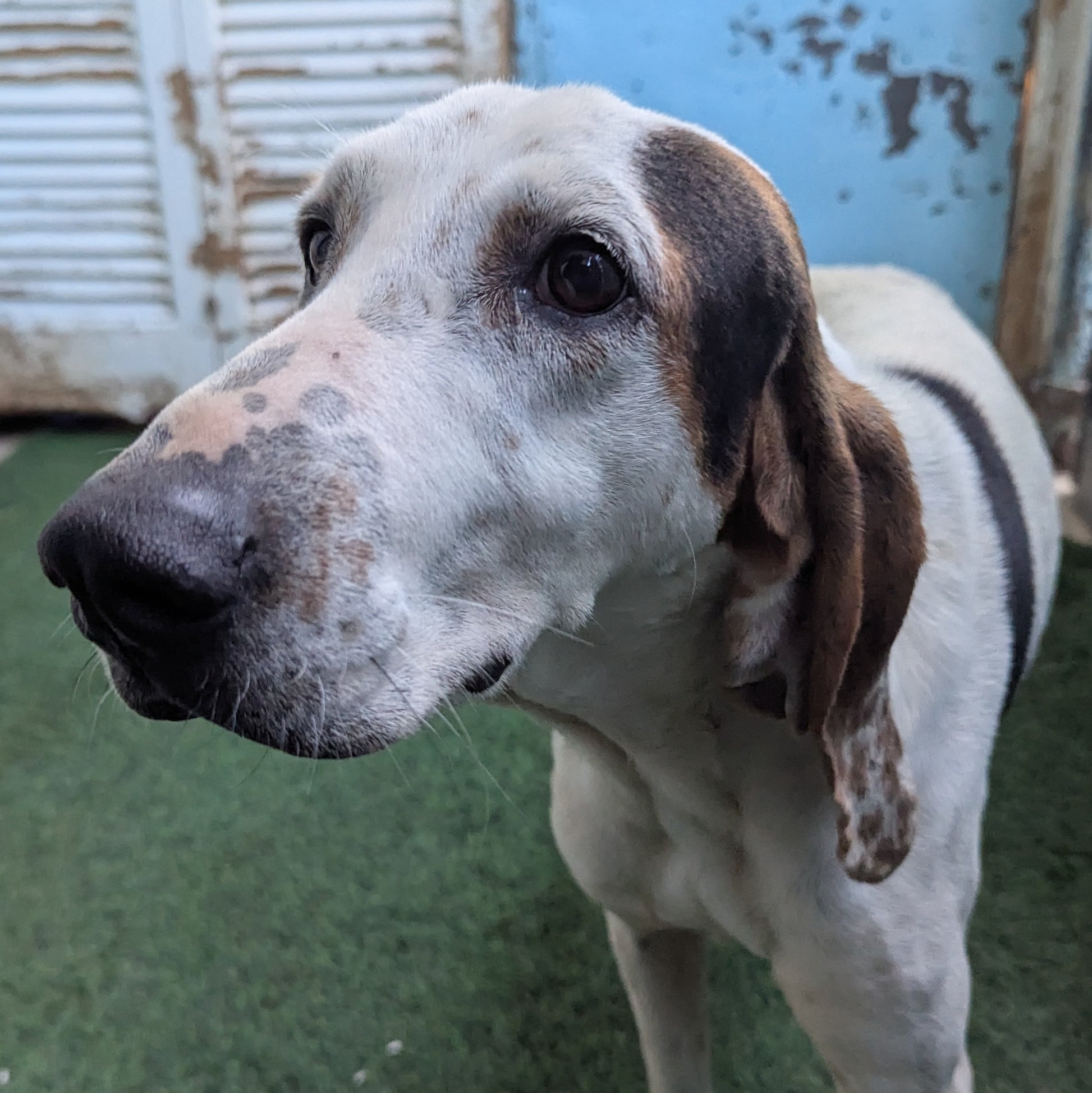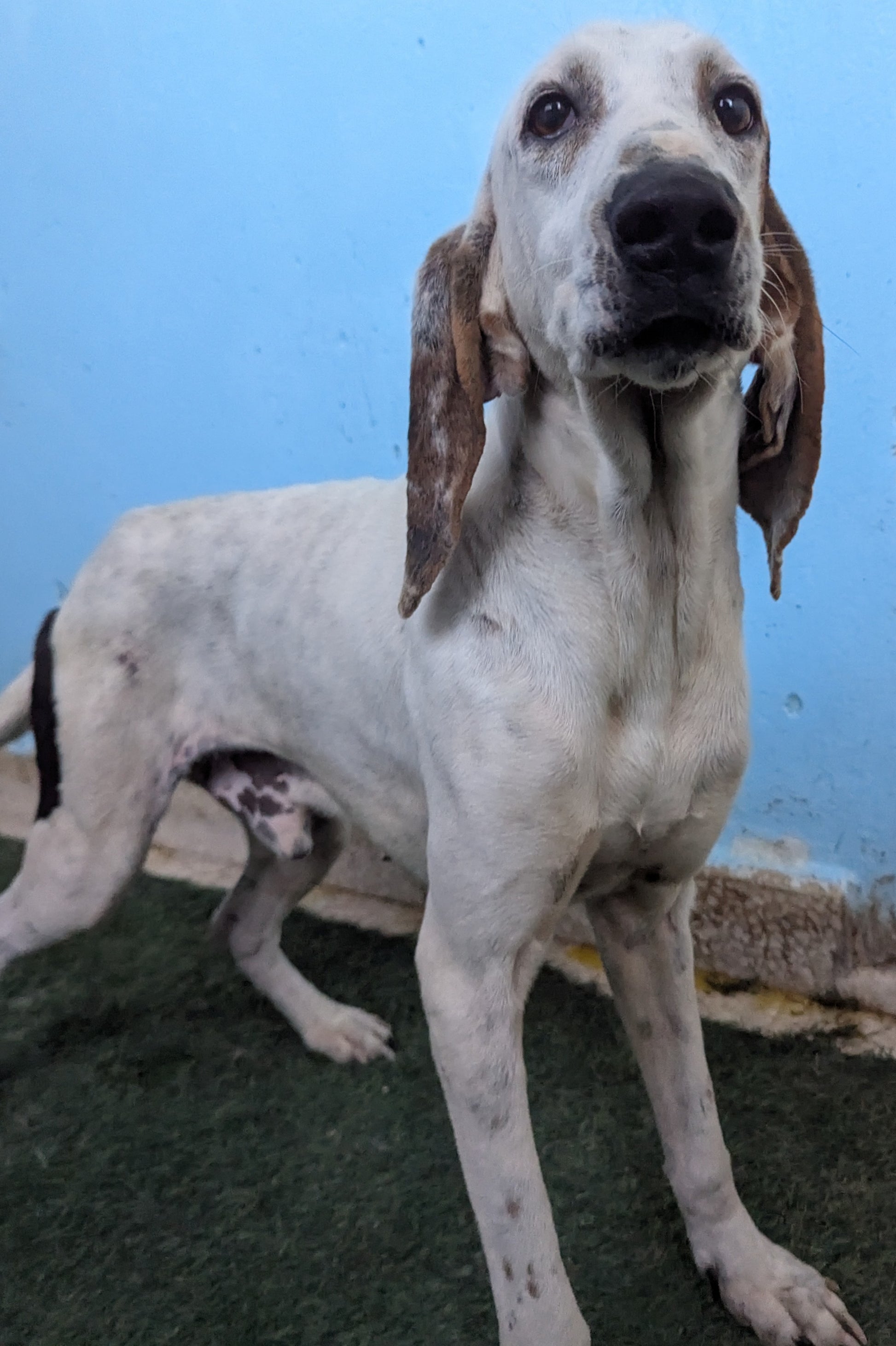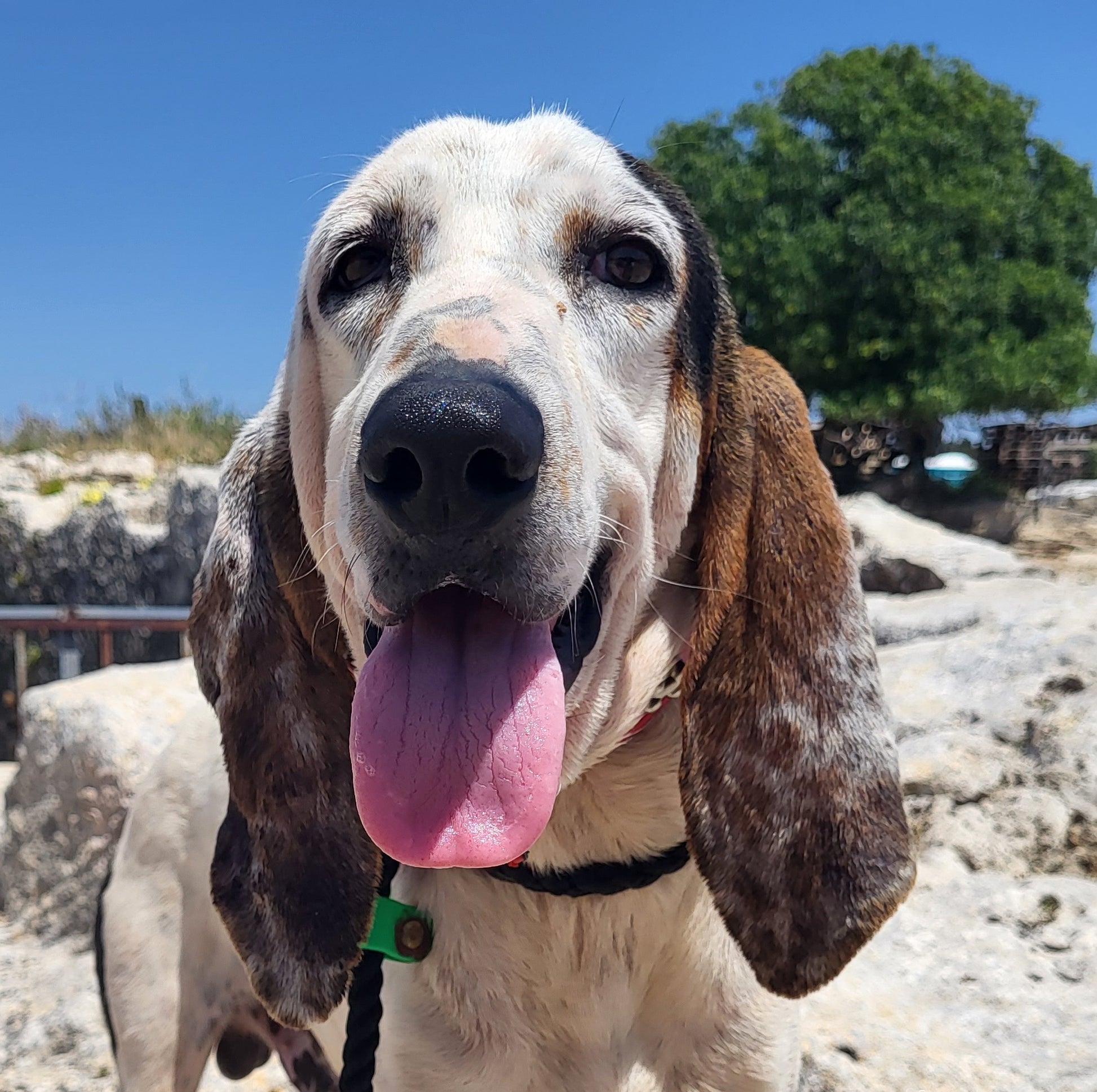 Полноразмерный крупный мальчик охотничей породы с длинными ушами. Триколор. Доминантный по отношению к собакам. Дружелюбен с человеком