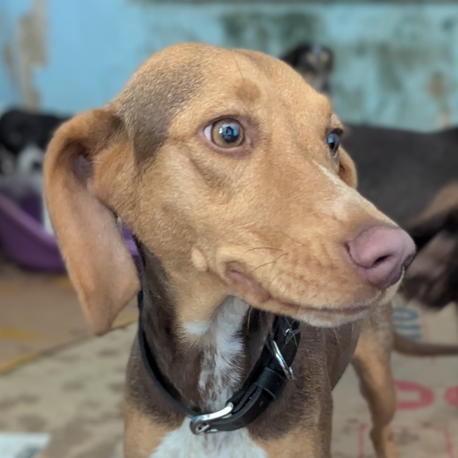 Среднего размера девочка, метис охотничей породы. Окрас темно-коричневый, рыжий и белый. Спокойная, дружелюбная. Любит грызть что-нибудь, когда скучает