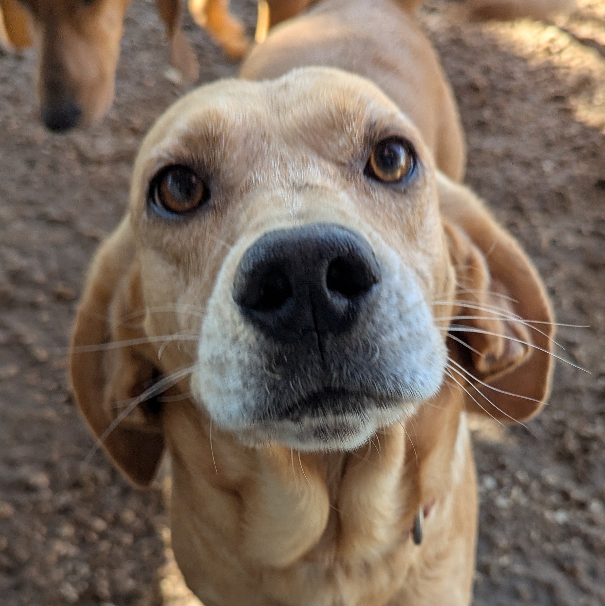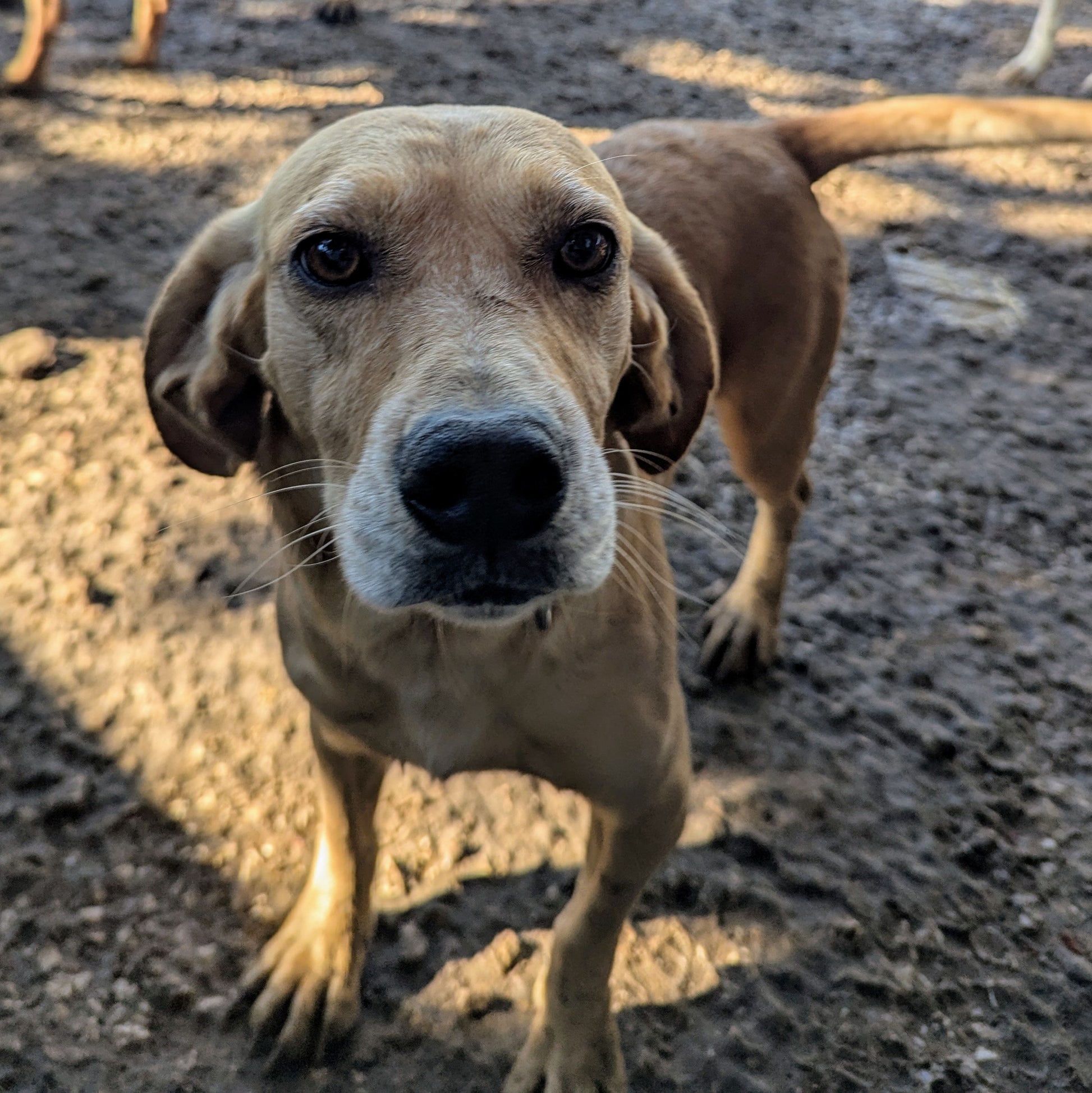 Небольшого размера девочка золотистого с проседью окраса с короткими лапами. Любит внимание человека и ищет его скромно и ненавязчиво