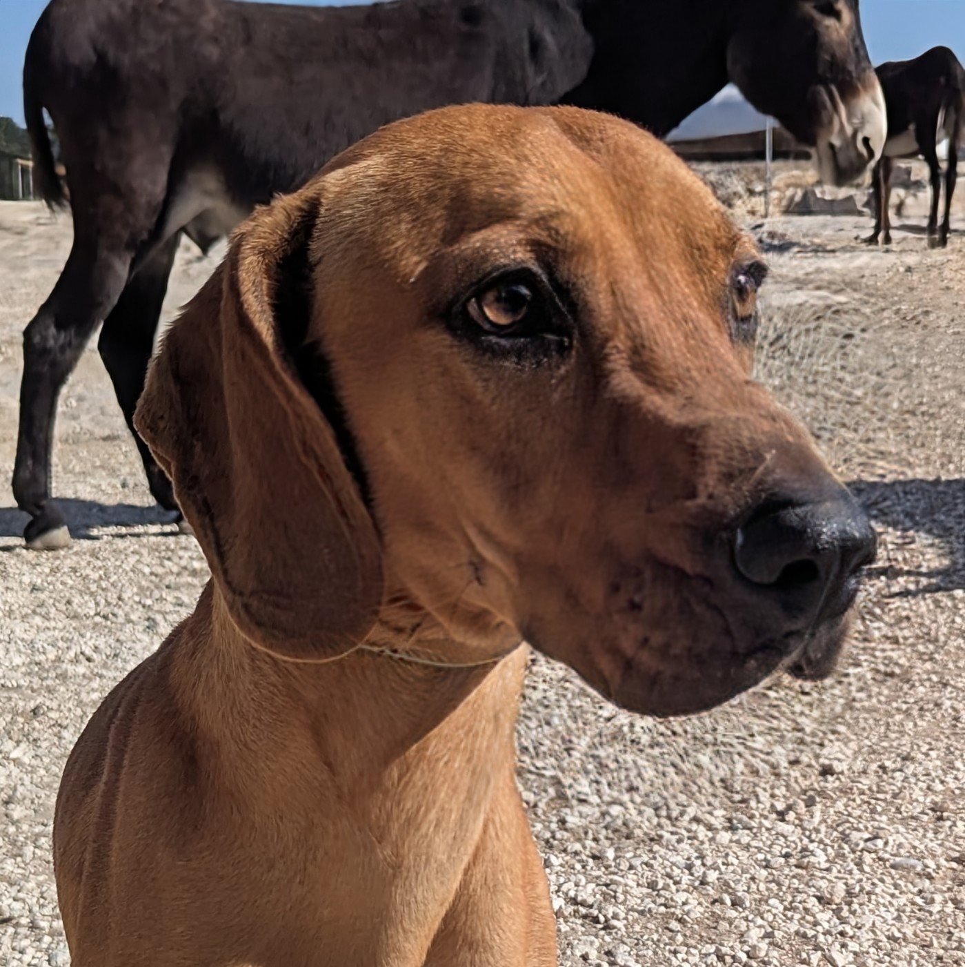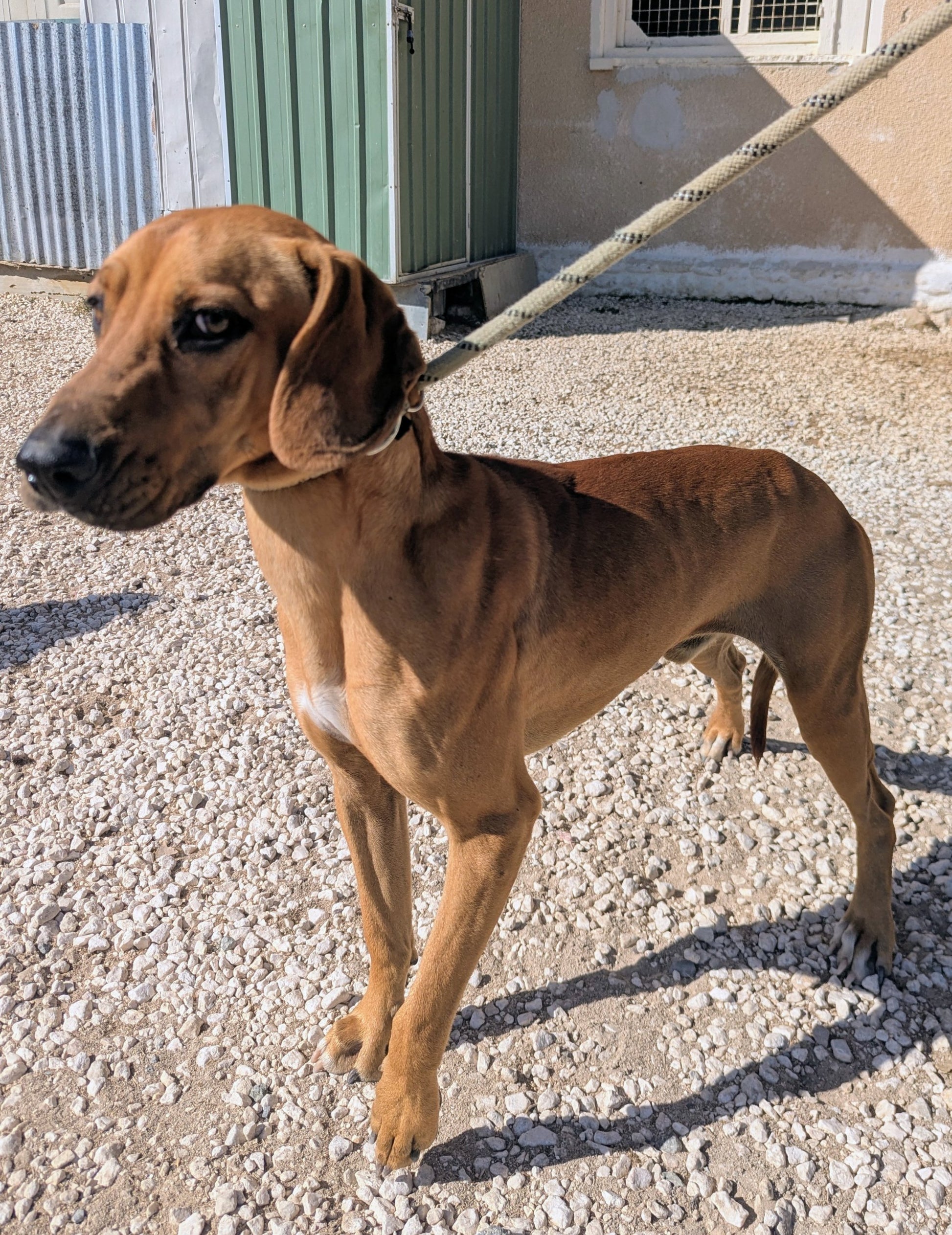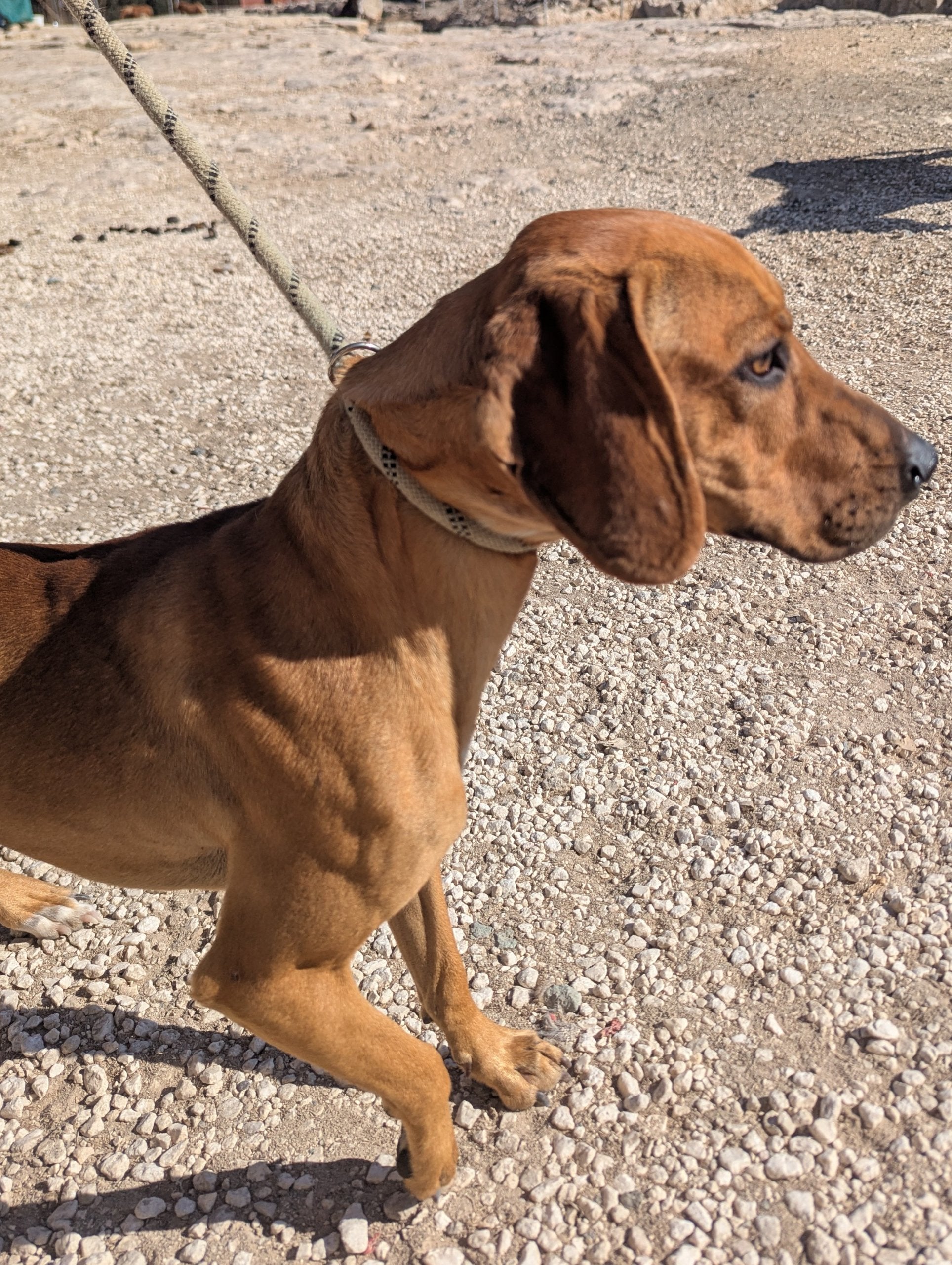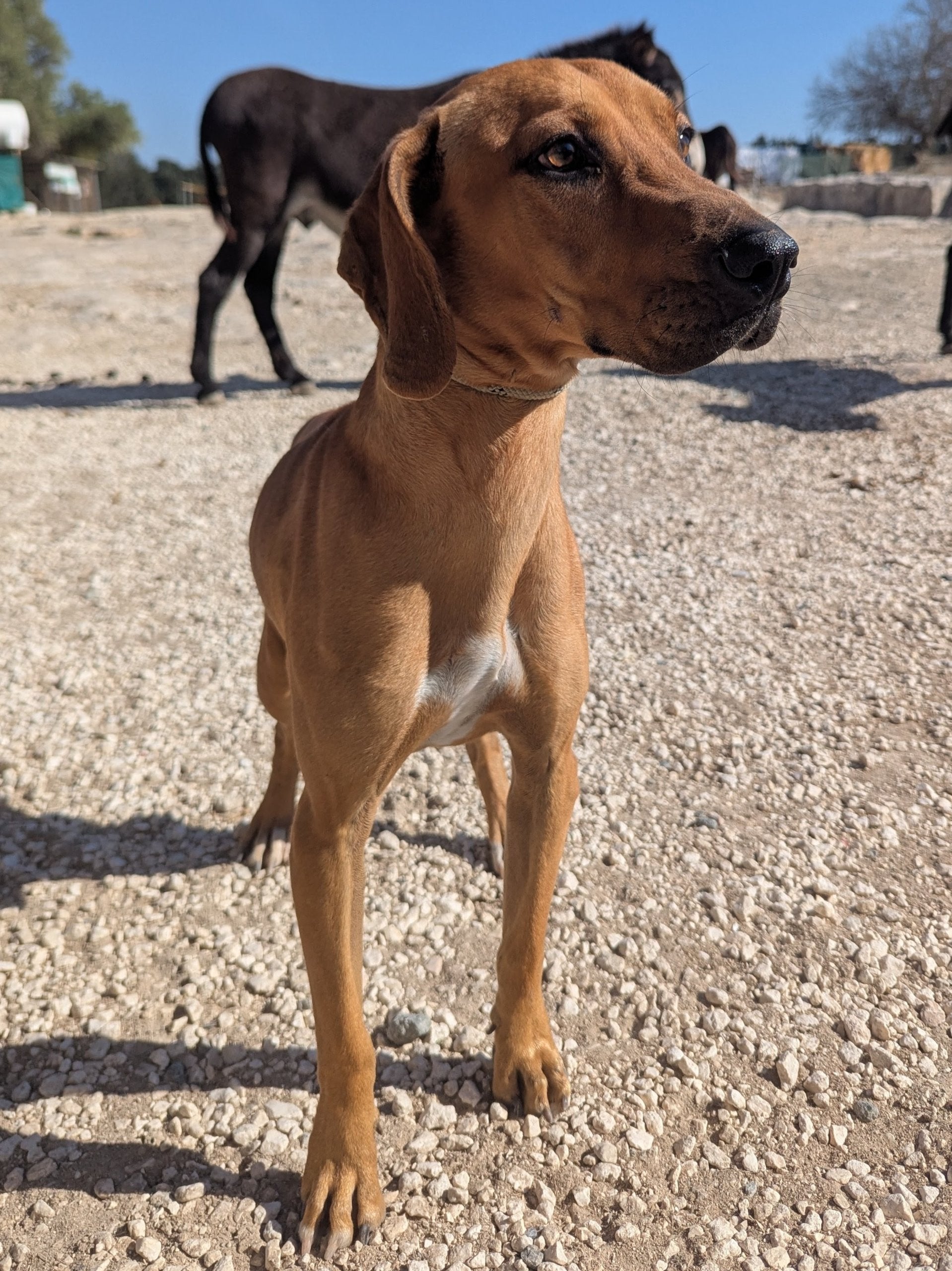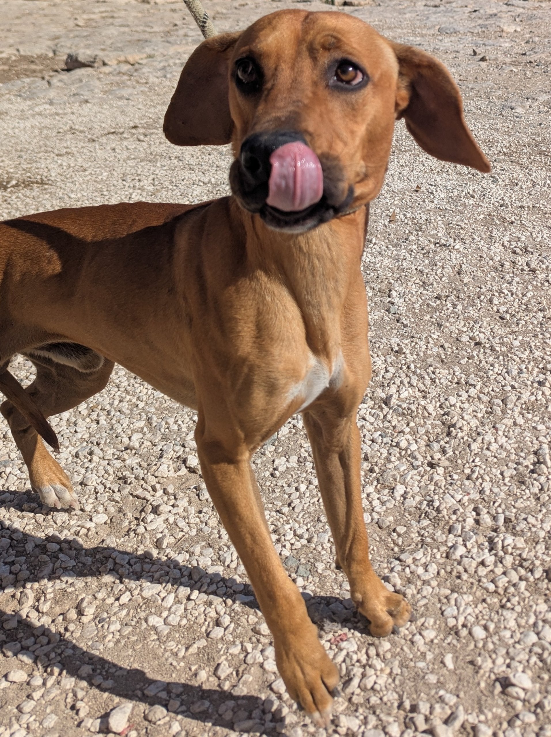 Medium-sized young hunter cross male, smooth tan coat with little white patch on his chest