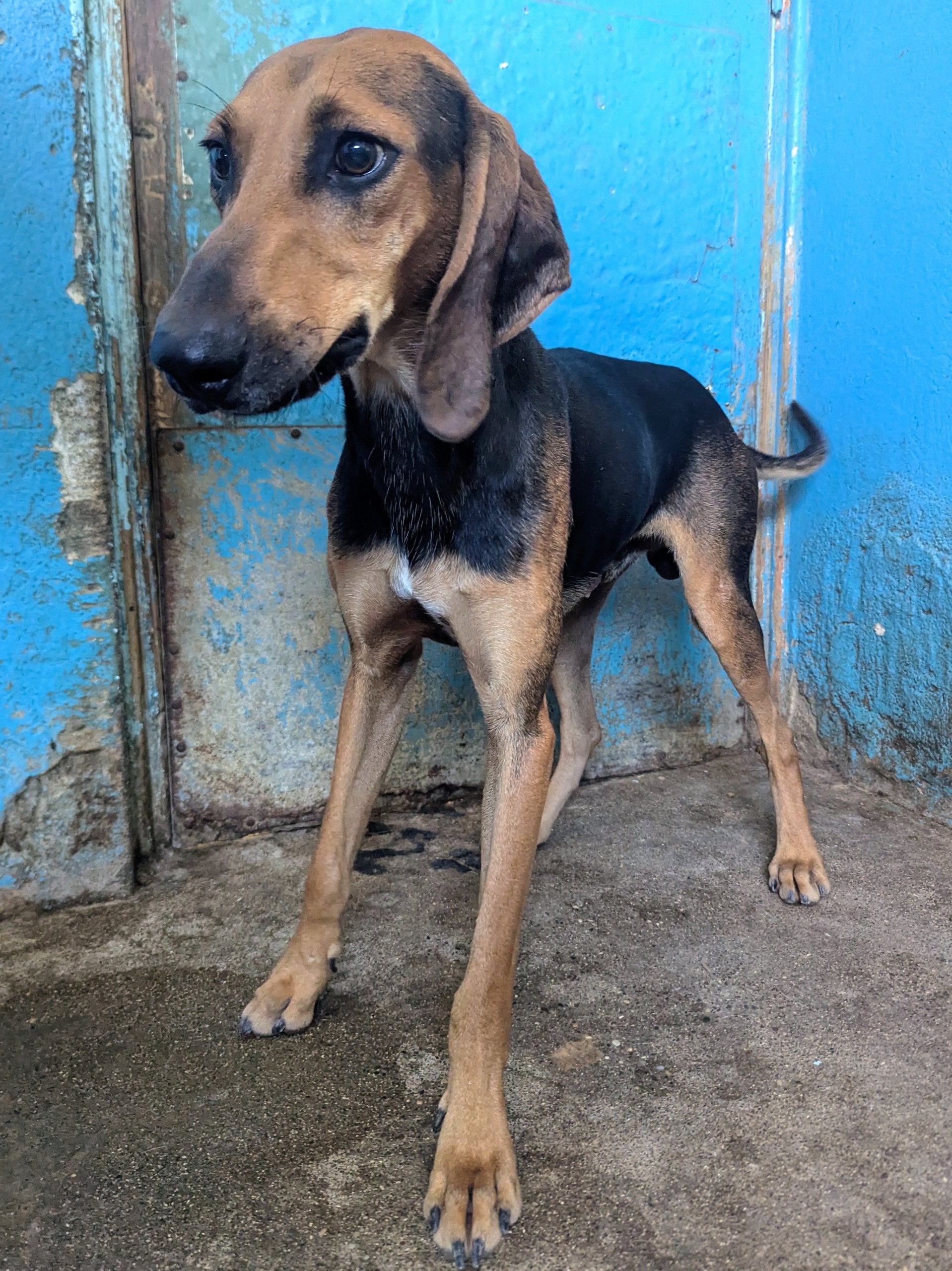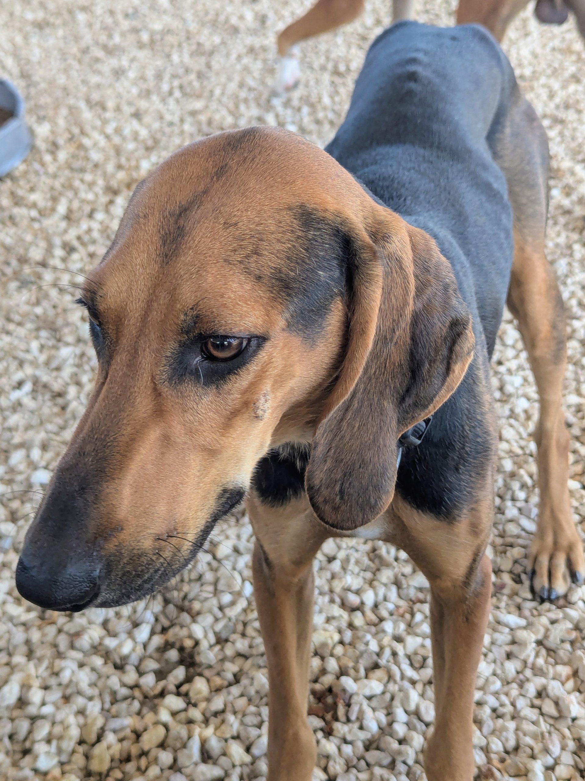 Medium-sized hunter cross male, black and tan with small white stripe on his chest