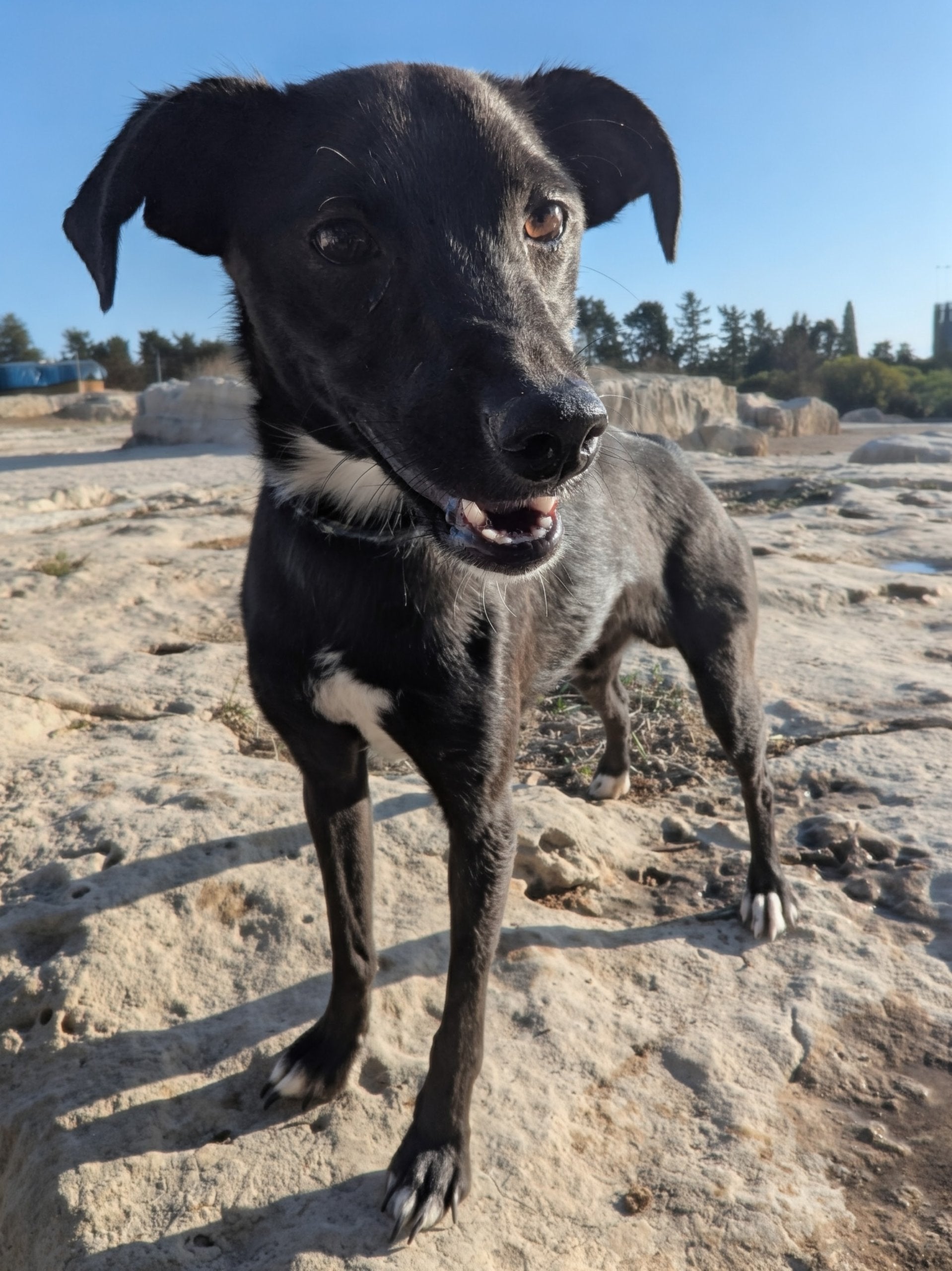 Miniature and sweet young male, black with white patches on his chest, neck, and toes. Very slim and elegant. Friendly and affectionate. A brother of Kirby