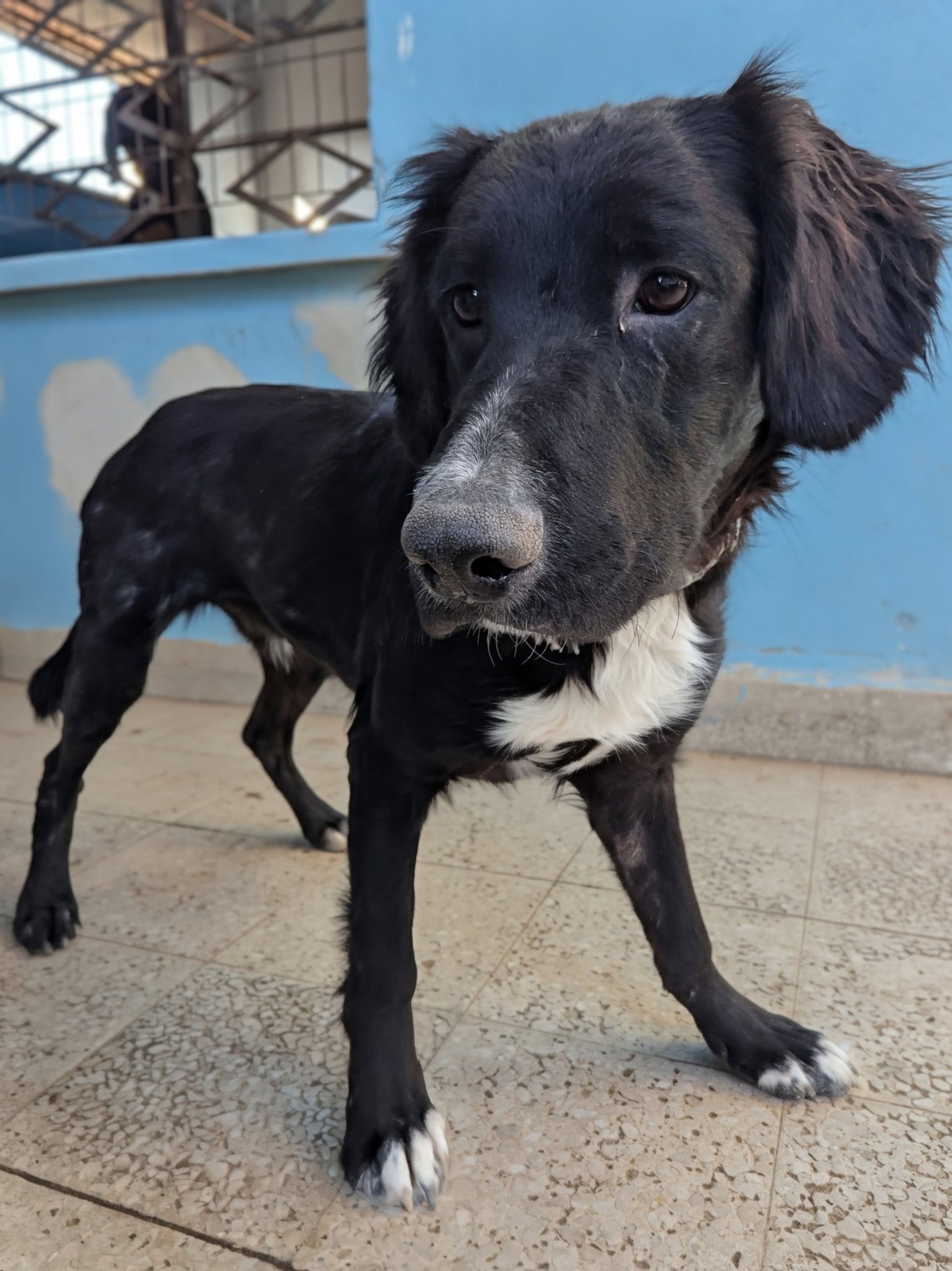 Medium-sized young mixed breed male. Black fluffy coat with little white on his chest and toes, fluffy ears. Playful, but sometimes too bully with others