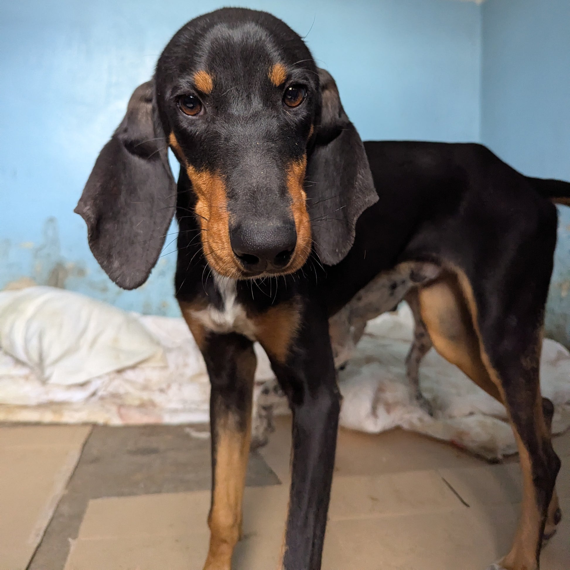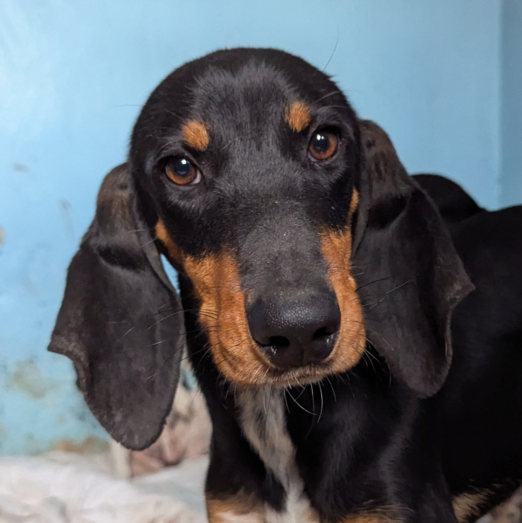 Молодой изящный мальчик среднего роста, черный с коричневым и белой грудью. Дружелюбный, общительный