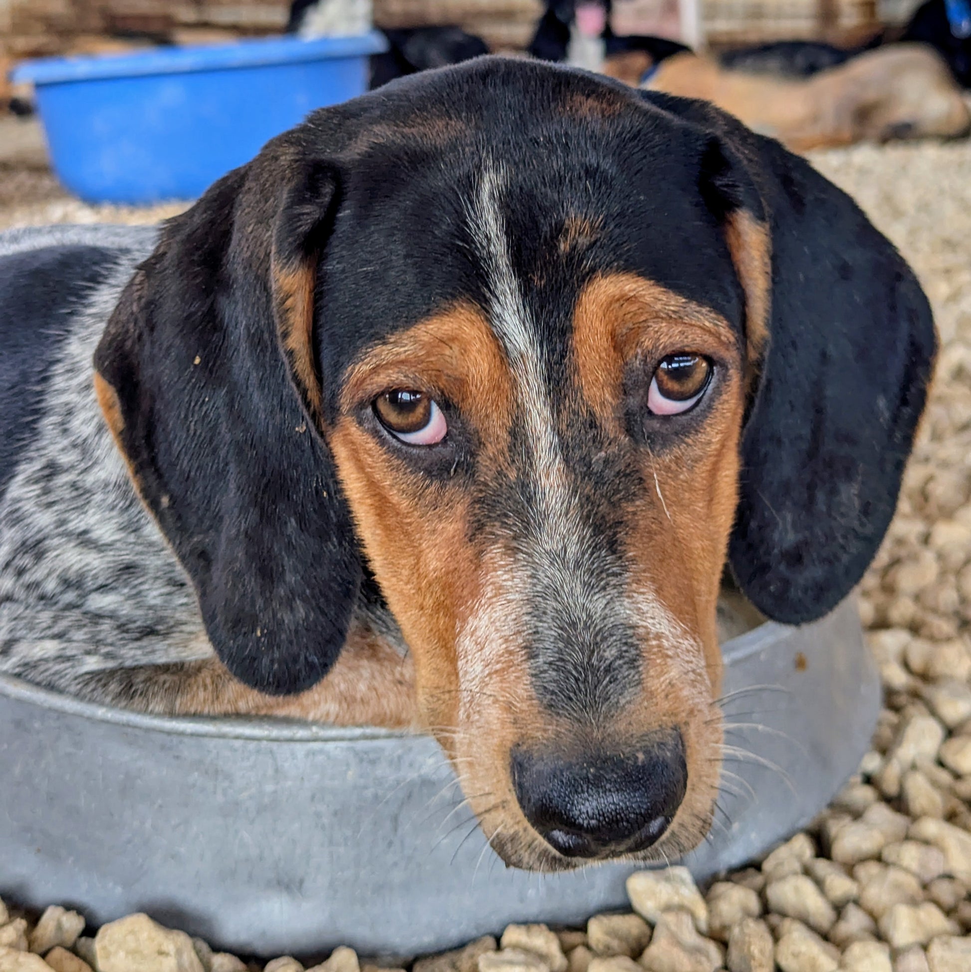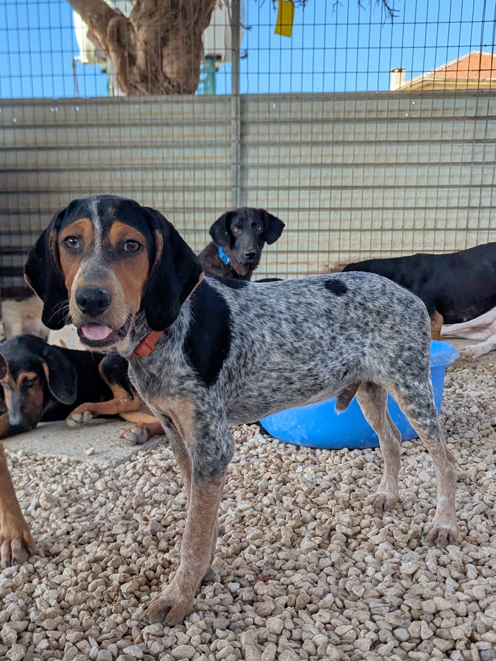 Young mid-size hunter mix, grey-white with black and tan. Just out of puppyhood – shy, curious, and ready to meet you