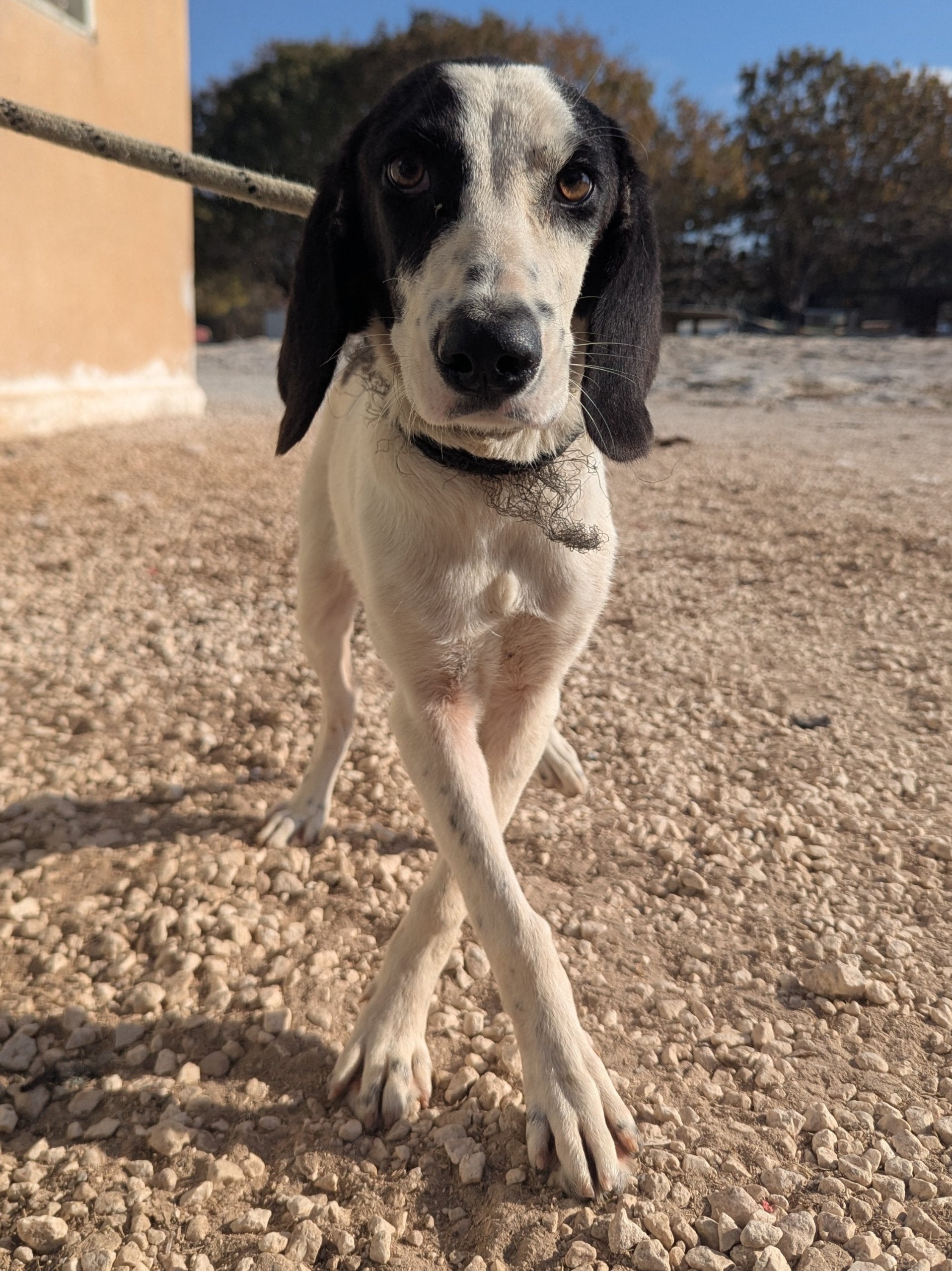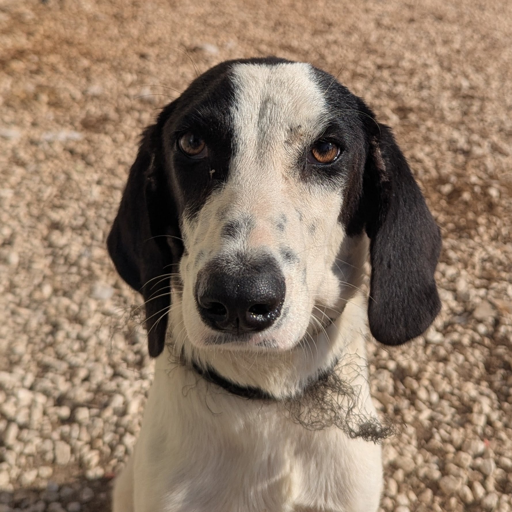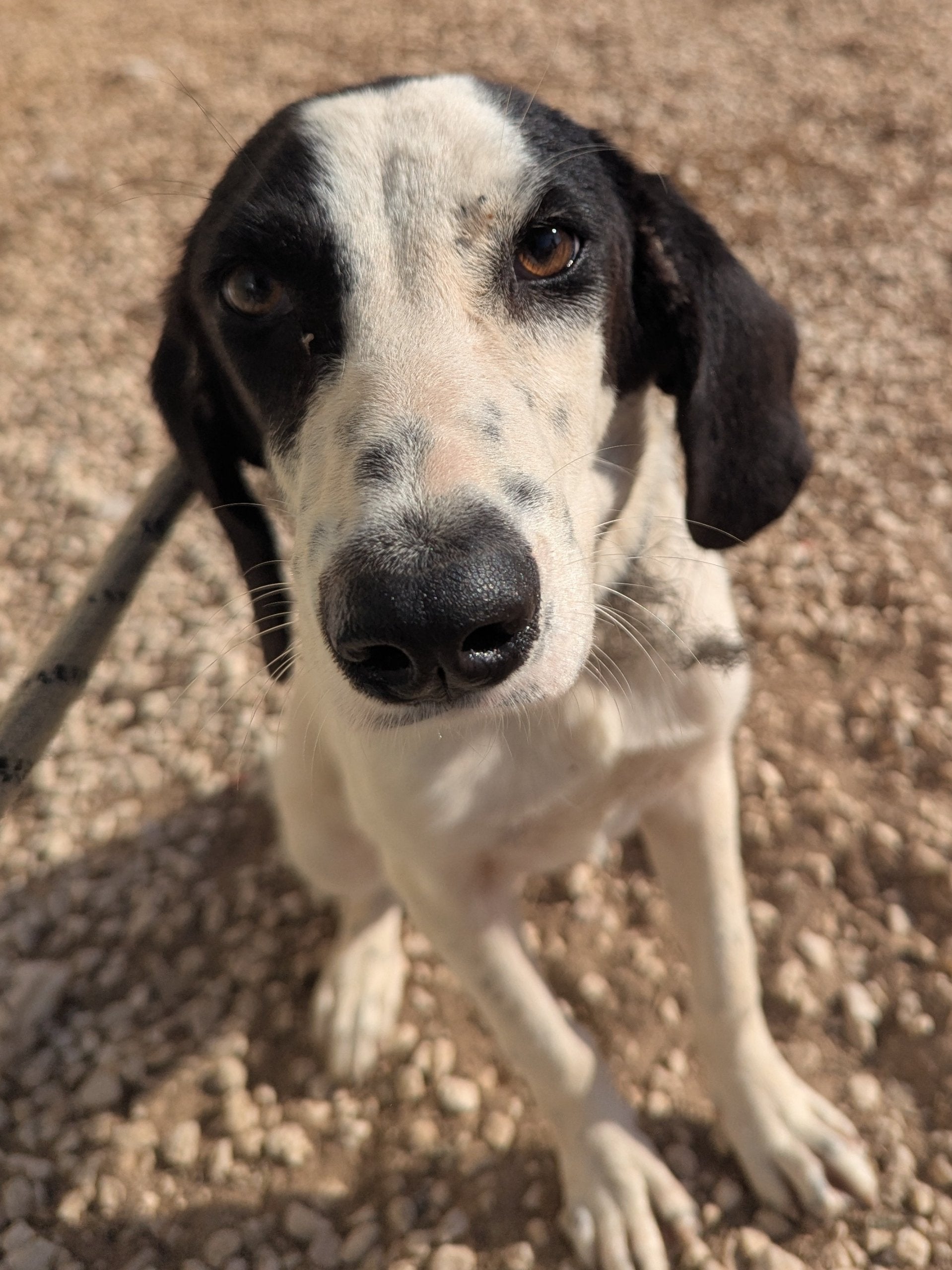 Medium-sized very young Pointer cross female, white with black patches. Calm, affectionate