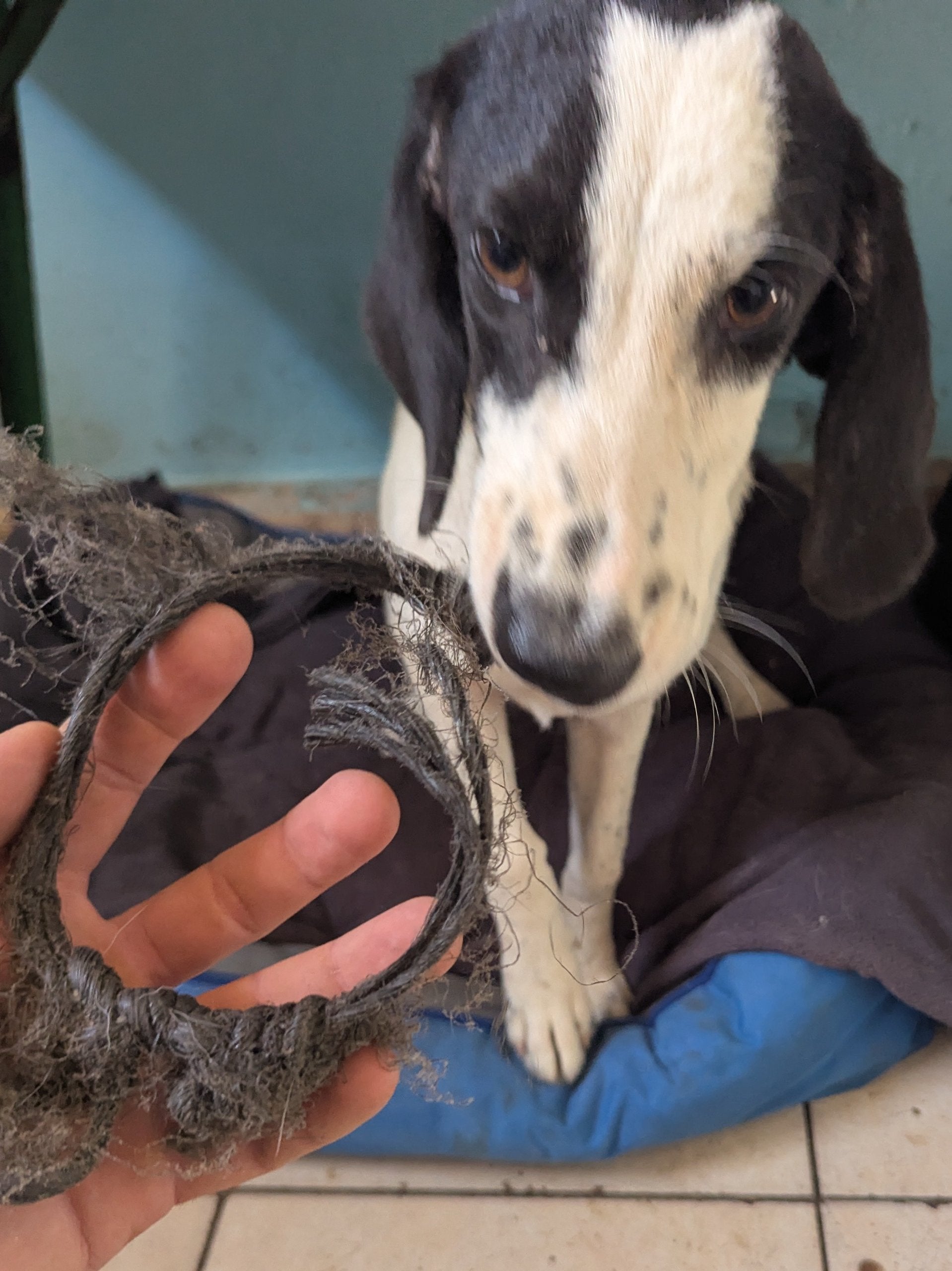 This dog was brought to the shelter on 28.09.2025 having black plastic rope around her neck