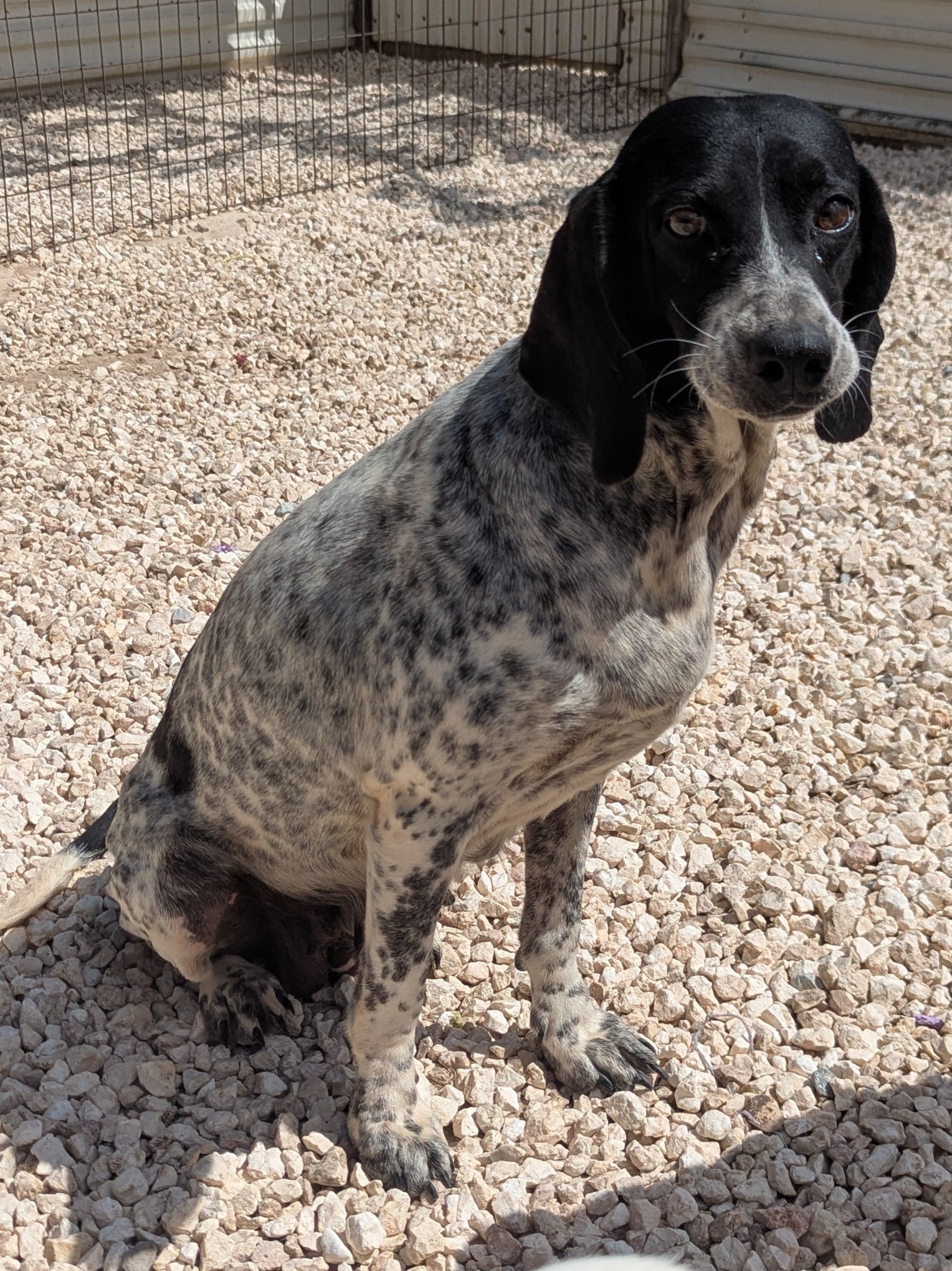 Меньше среднего размера девочка пойнтер, серая с черными пятнами. Дружелюбная. Grey collar (lost)