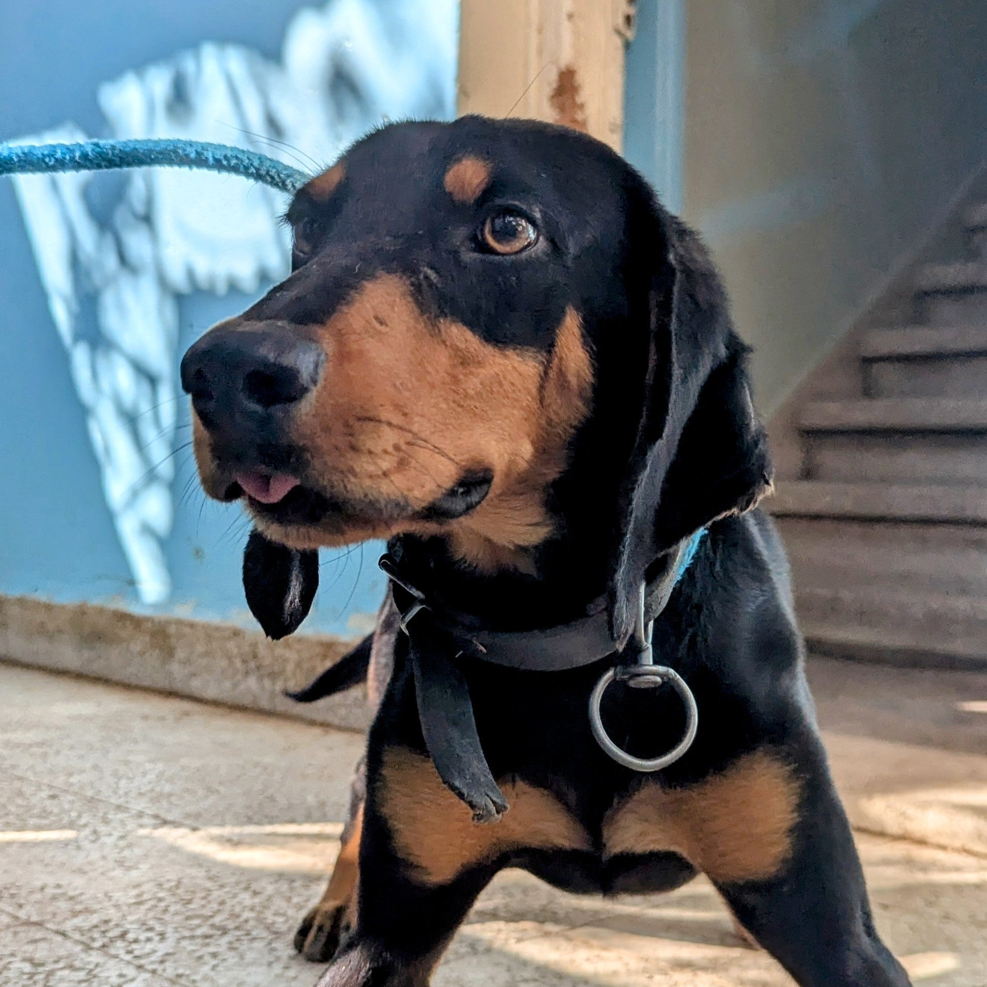 Среднего размера мальчик охотничей породы. Окрас черный с коричневым