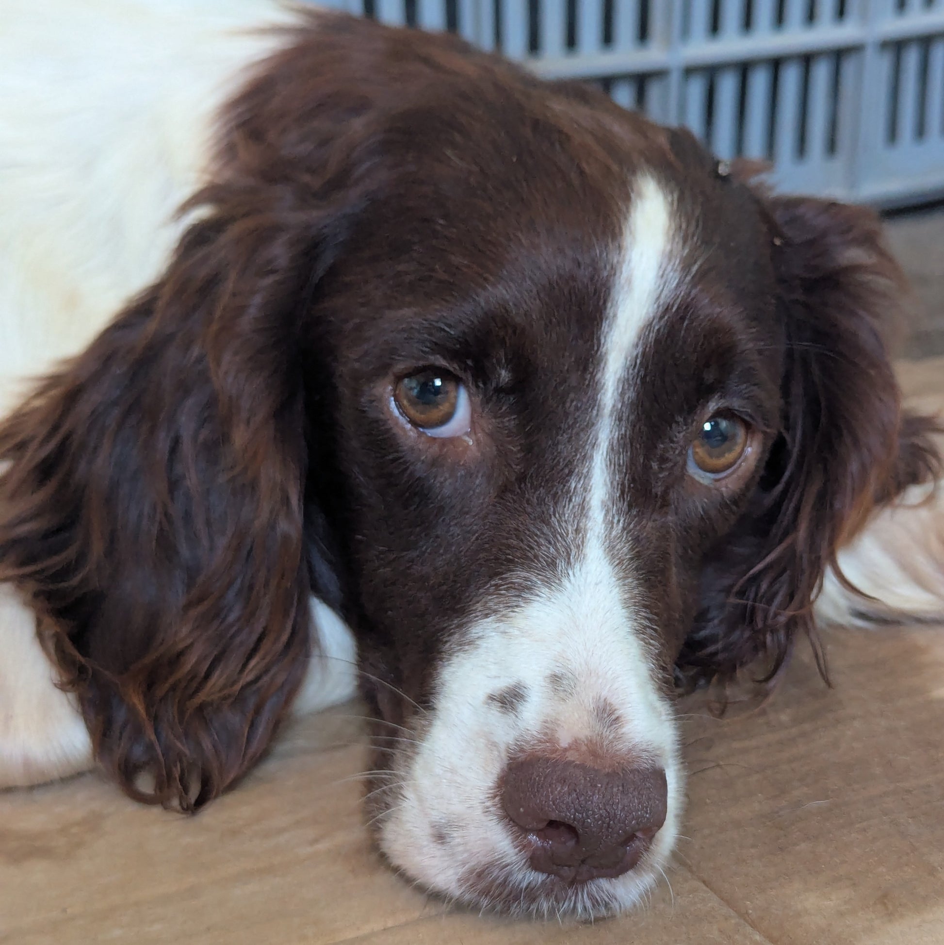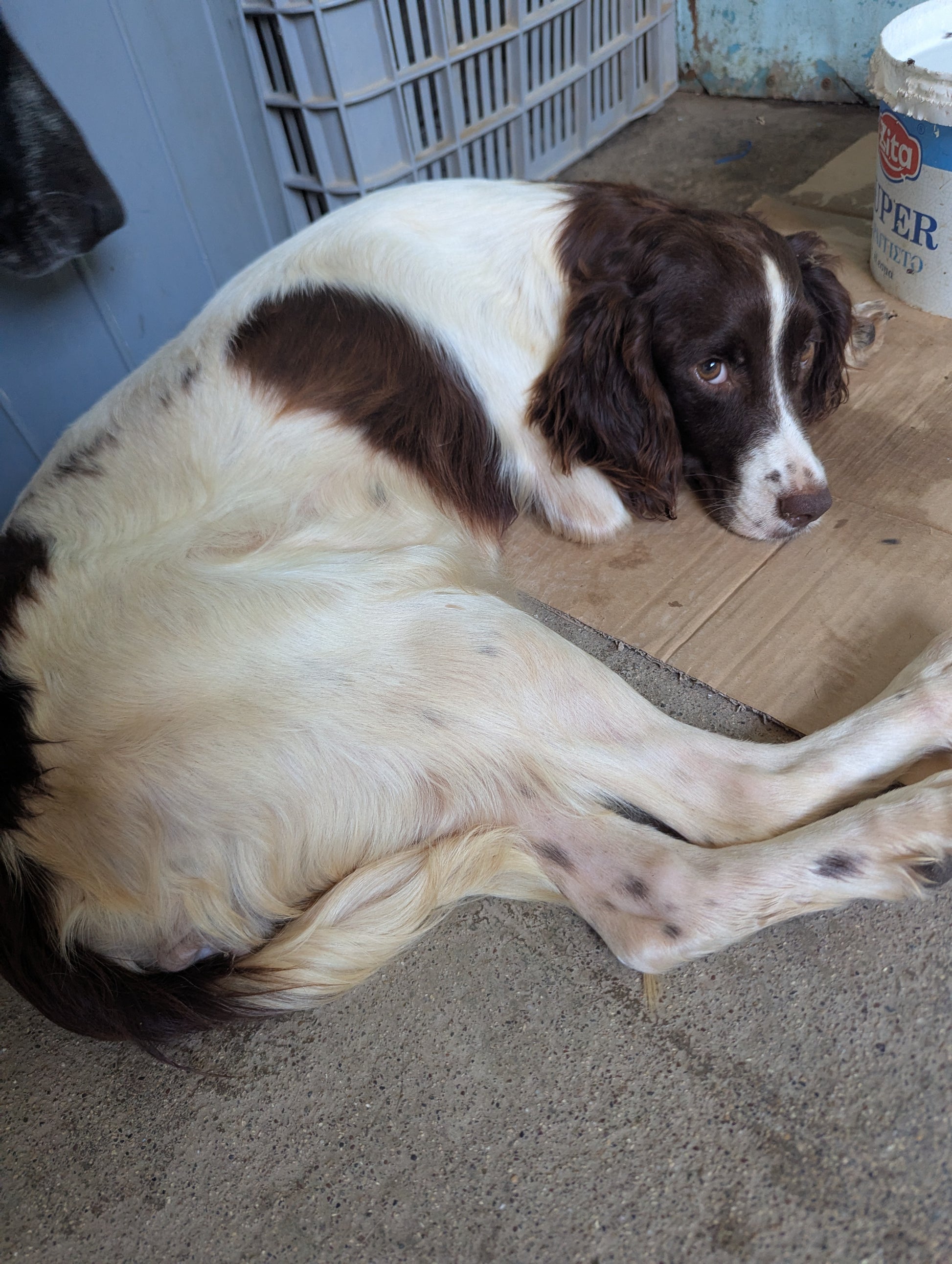 Very shy but very good girl, soulful. White and chocolate Springer Spaniel. Learned to walk on the lead at the shelter, better with harness.