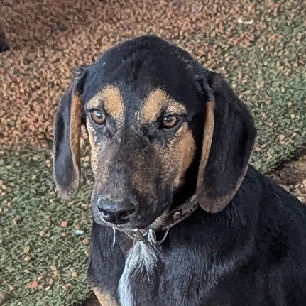Небольшая девочка, метис охотничей породы. Окрас черный с коричневым и былым пятном на груди