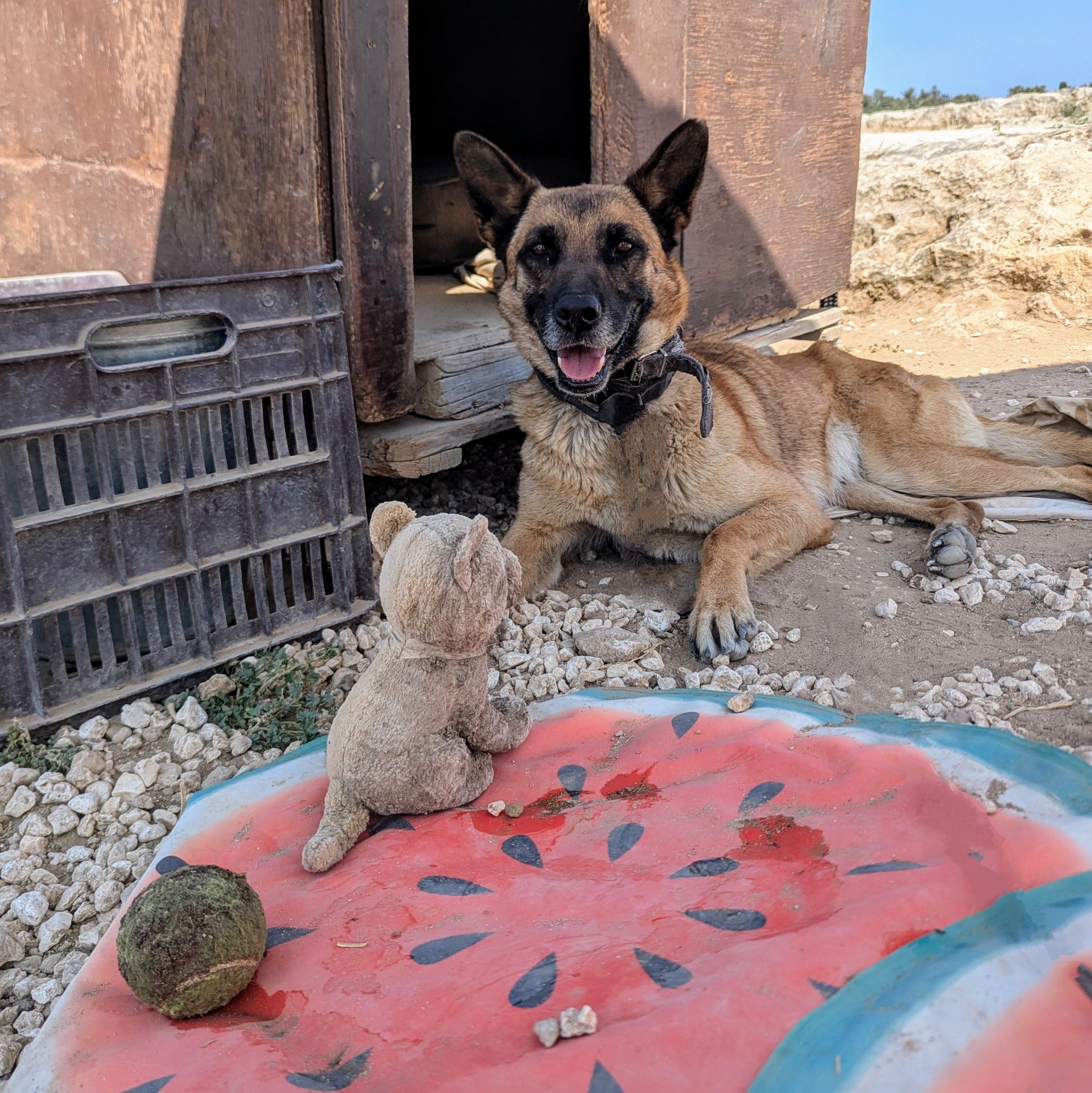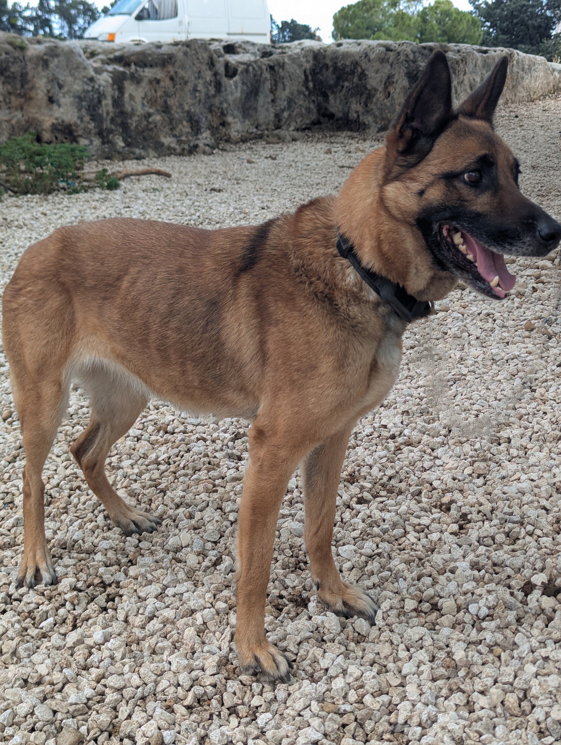 Крупная девочка овчарка, рыжего окраса с черным подпалом на морде, ушах и спине. Активная, прыгучая. Дружелюбна к человеку, уживается в стае. Знает команды