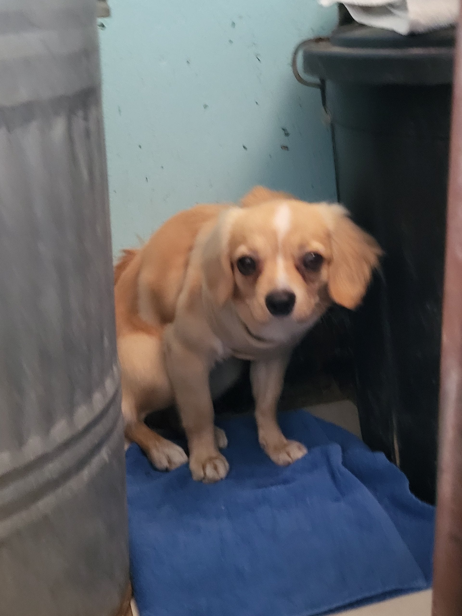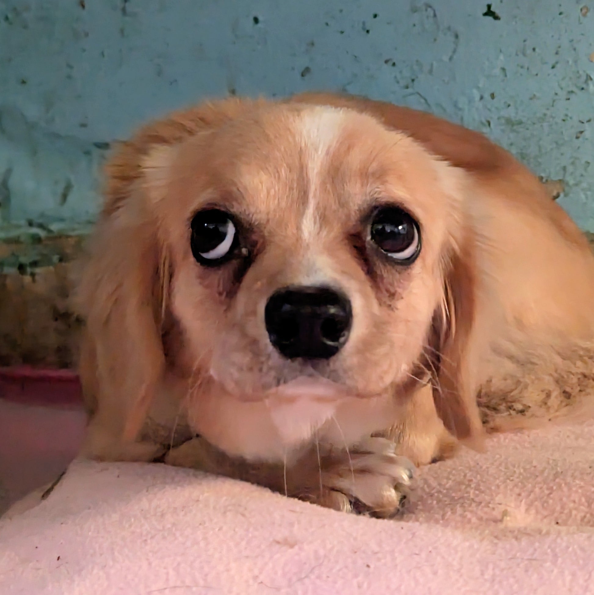 Mimiat Spaniel cross female, tan and beige. Very timid