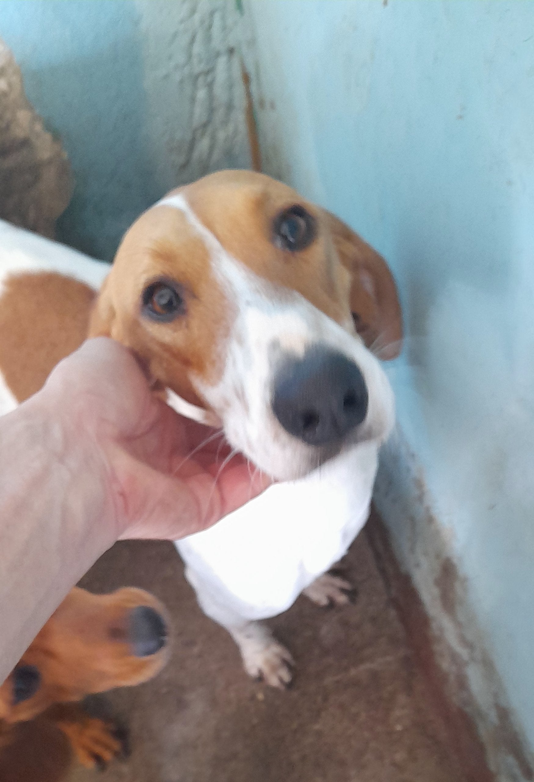 Elegant medium sized hound, white with ginger, slim head. Very friendly with people and other dogs, lively and playful.