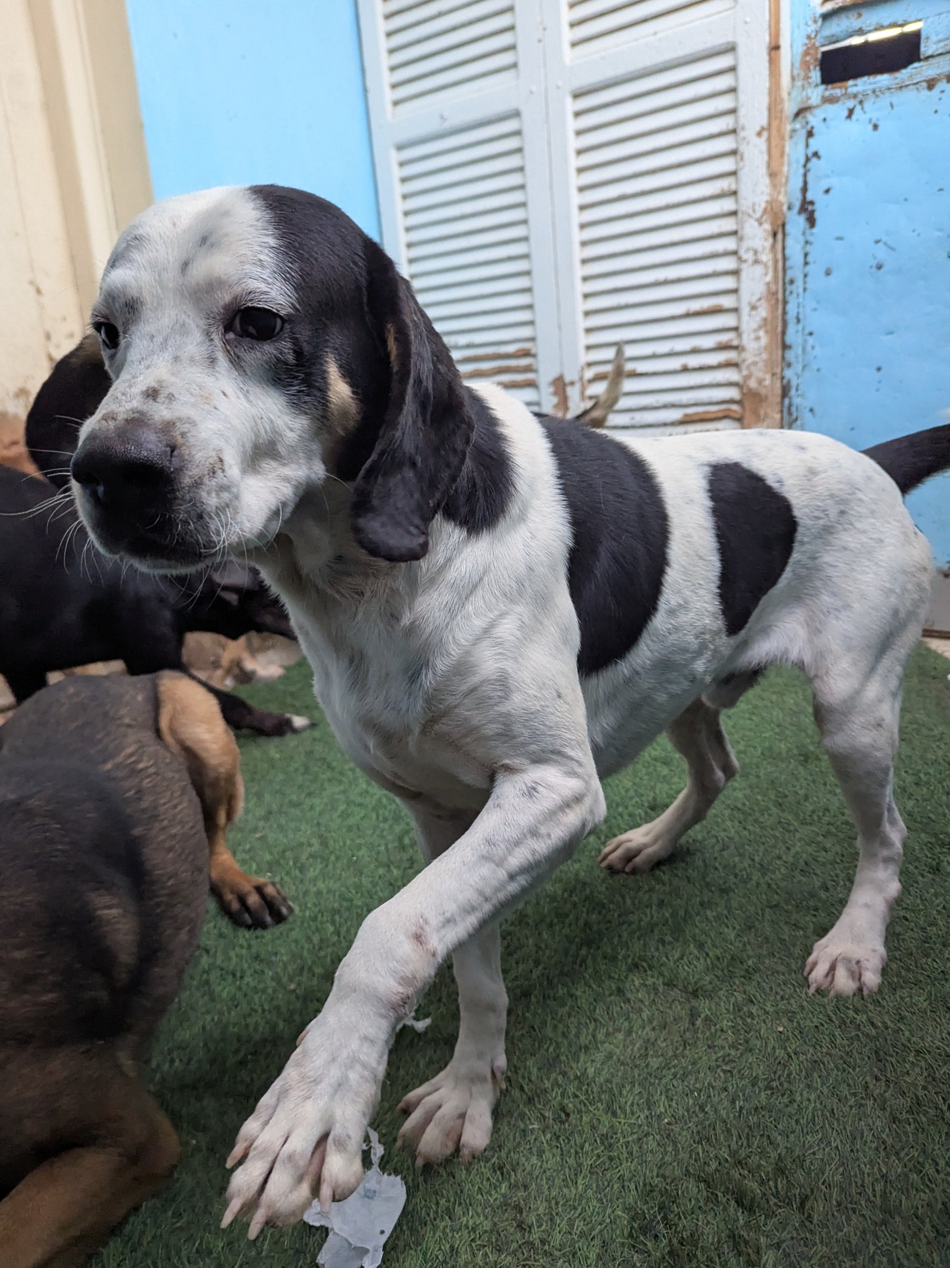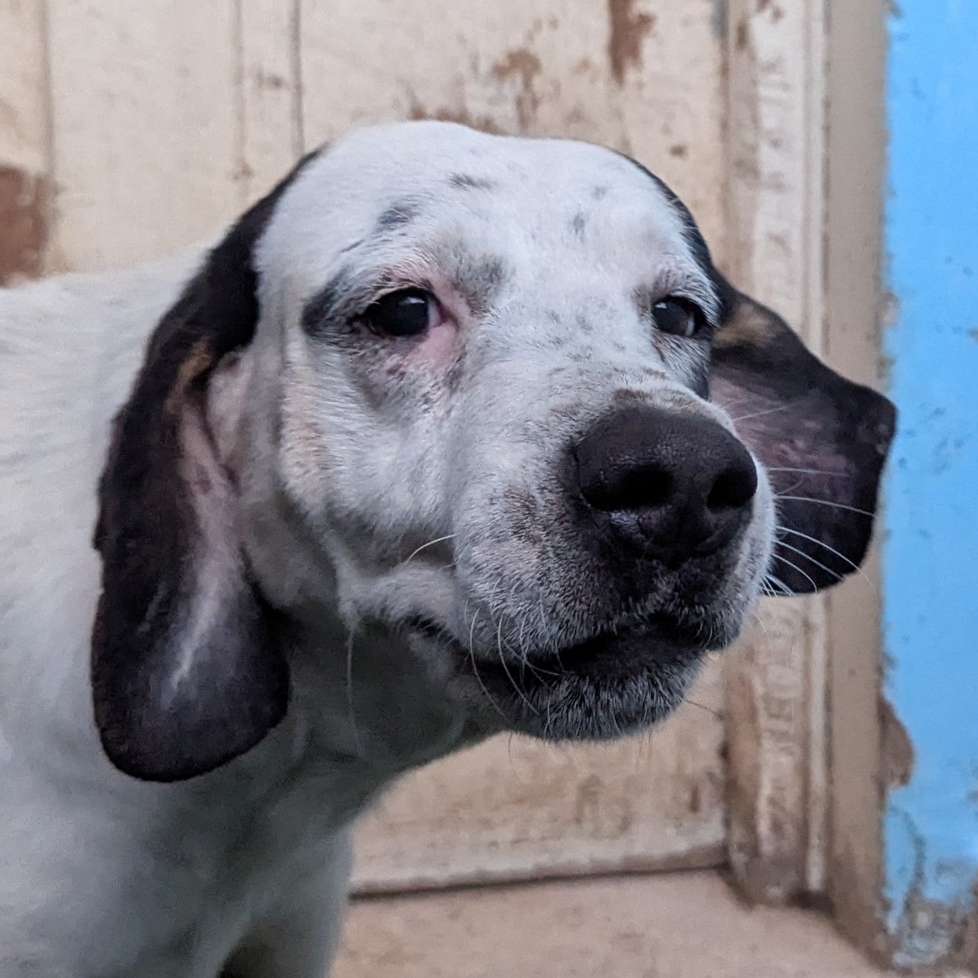 Крупный мальчик, пойнтер или метис охотничей породы. Окрас белый с черными пятнами. Игривый, ориентирован на человека
