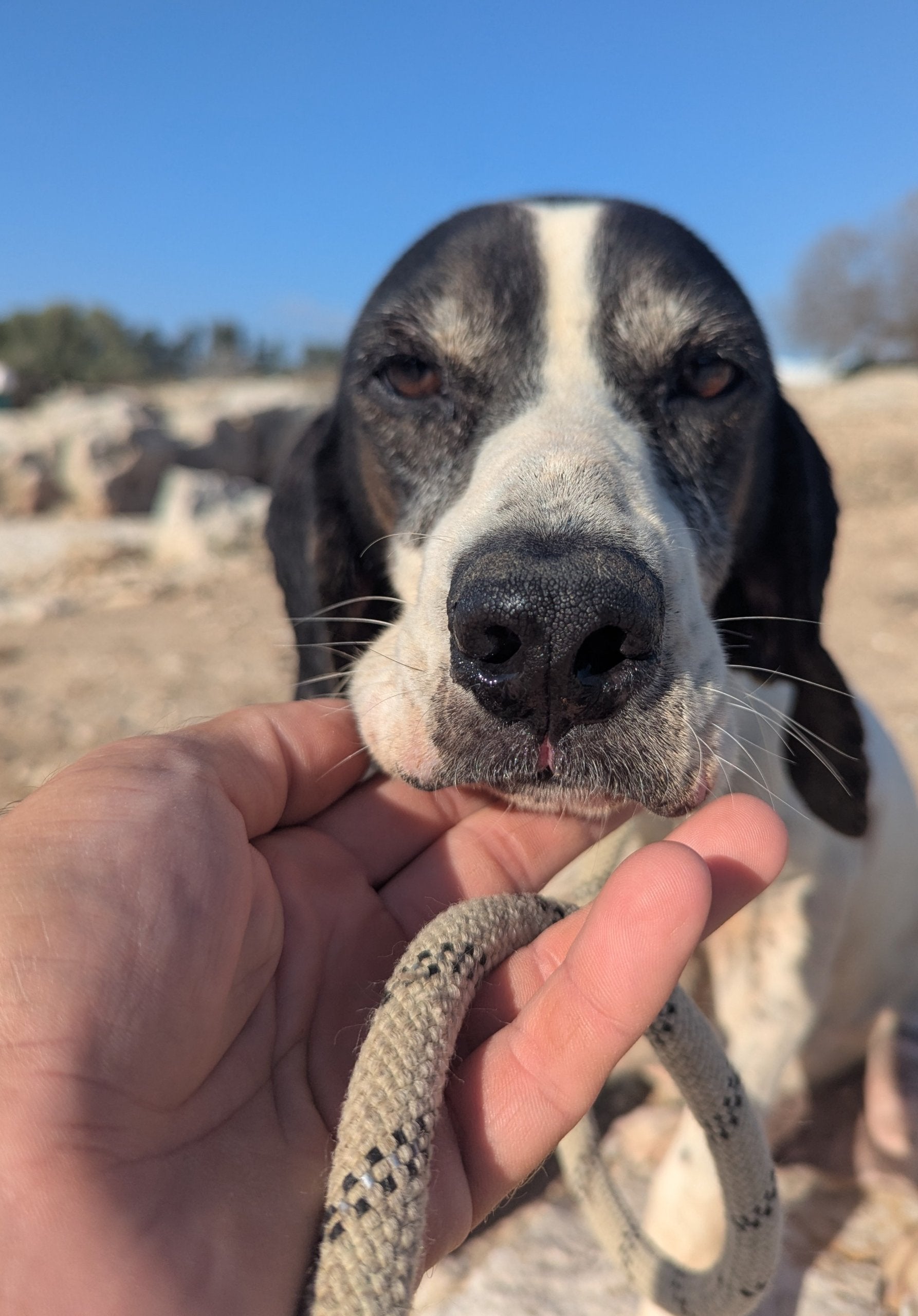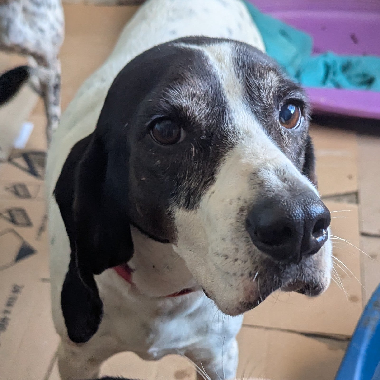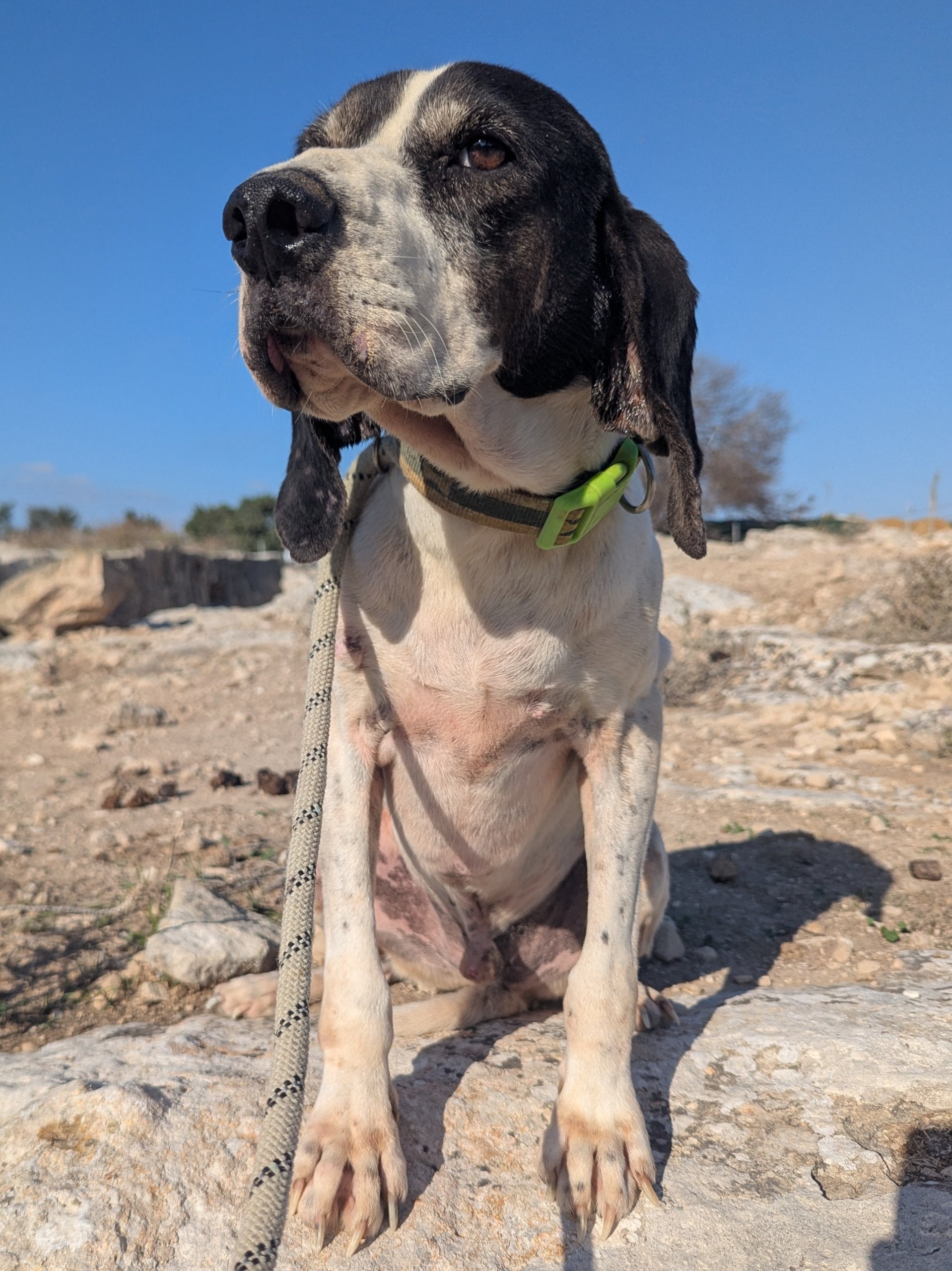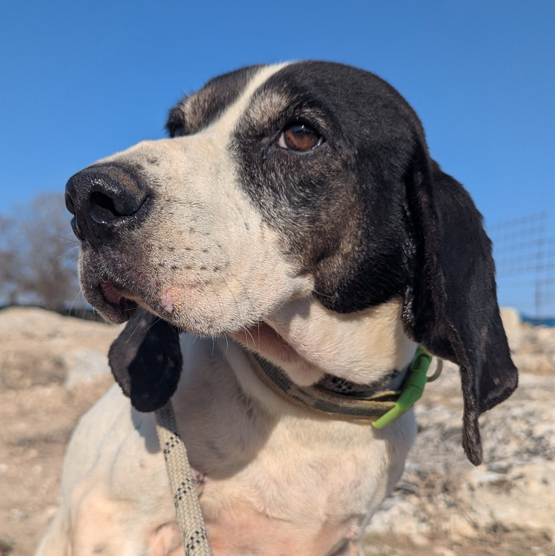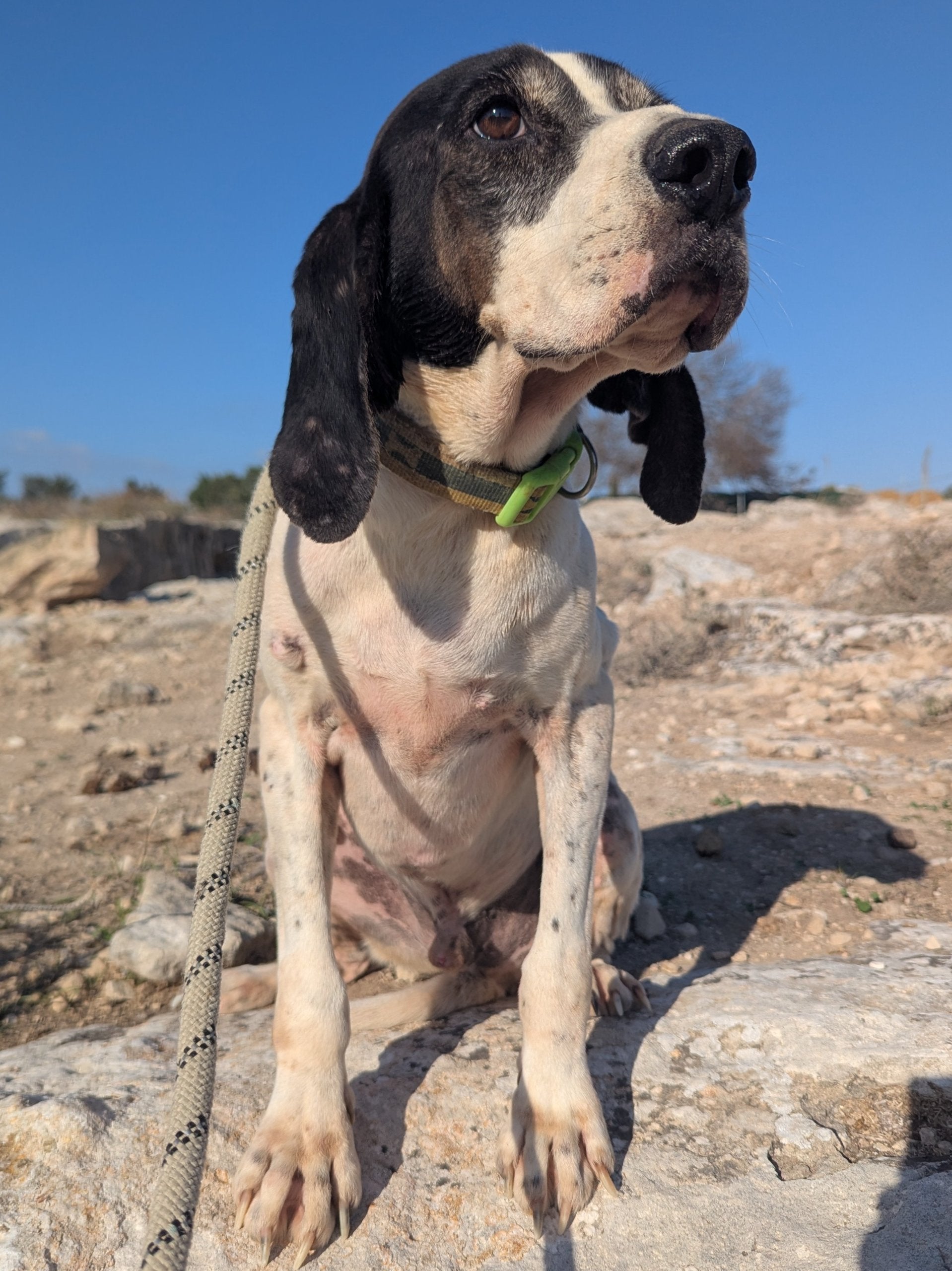 Среднего размера мальчик охотничей породы, белый с черными пятнами. Спокойный, ориентированный на человека