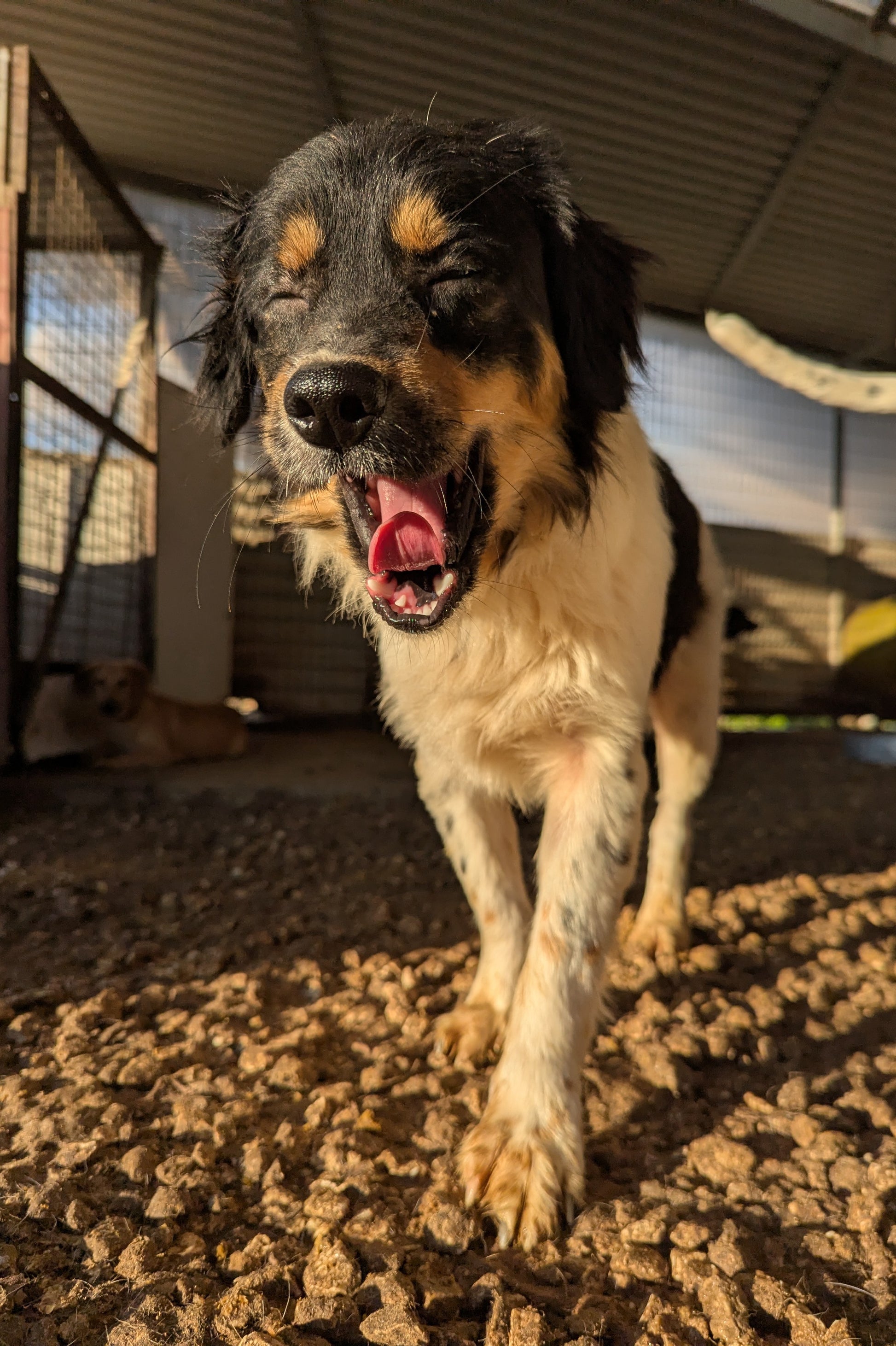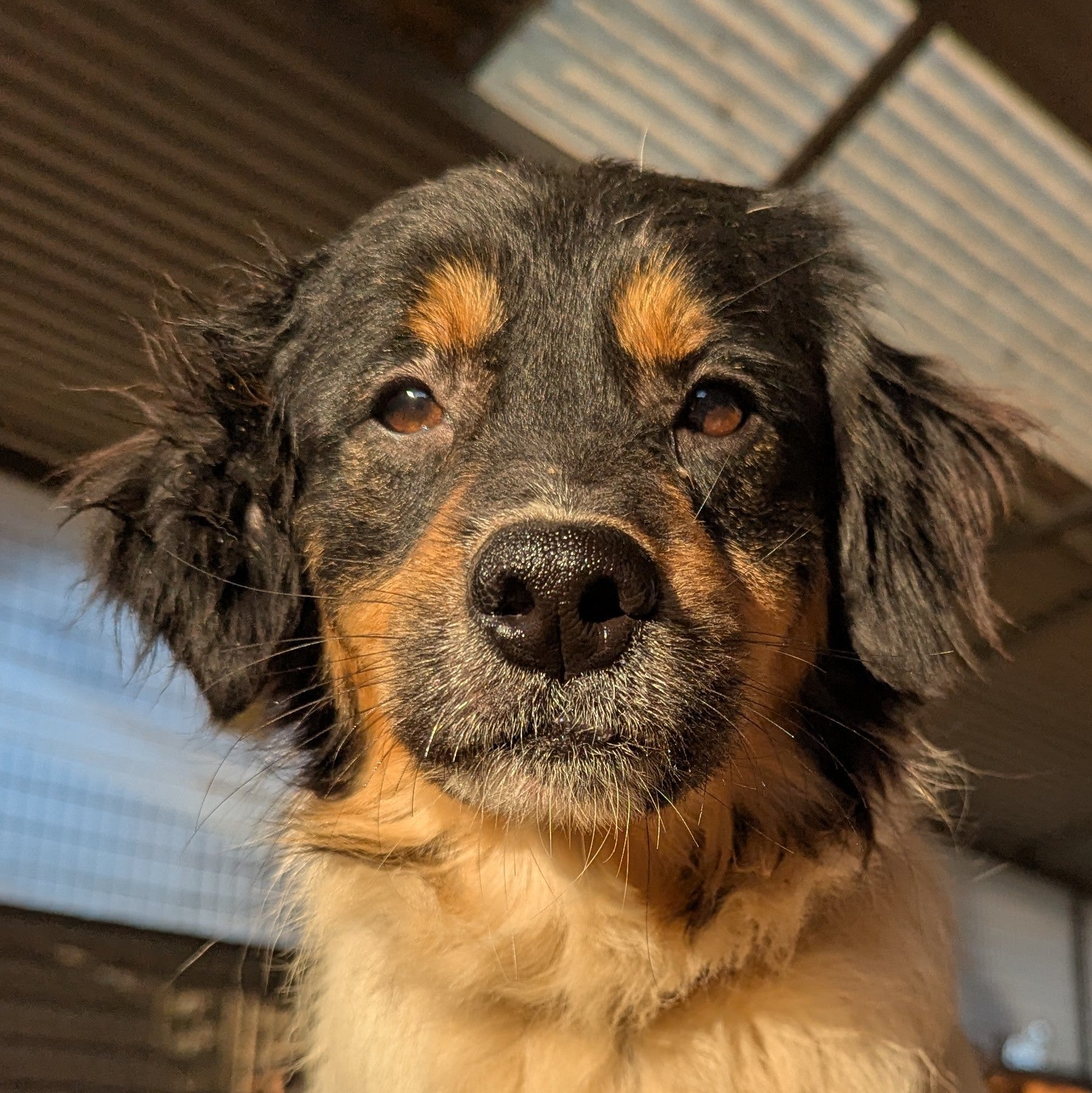Небольшой пёс, длинношерстный. Трехцветный окрас: черный, белый, с рыжим подпалом. Активный, иногда проявляет доминантность по отношению к другим собакам