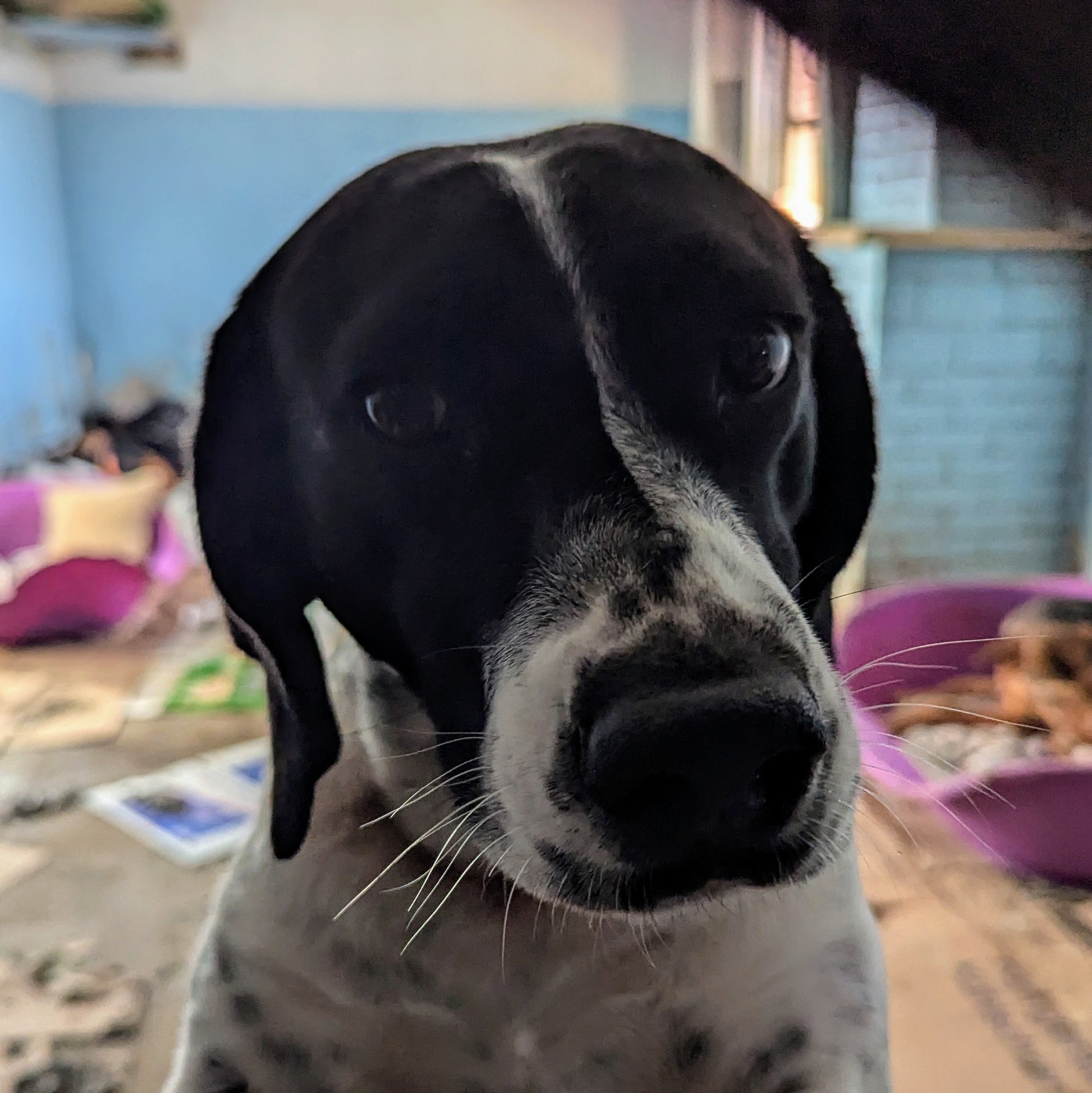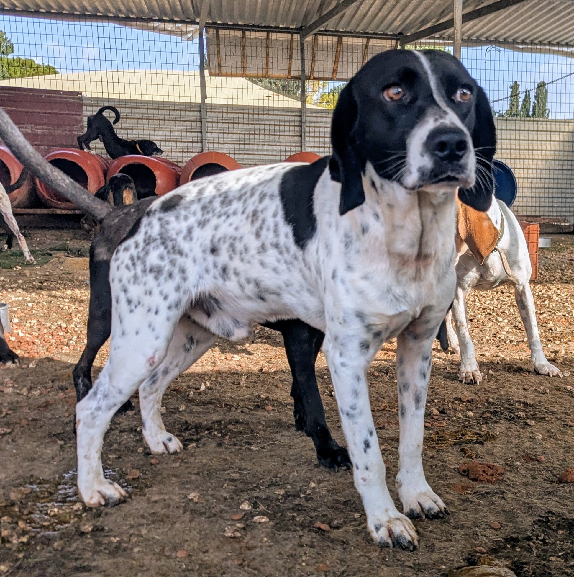 Среднего размера мальчик охотничей породы. Окрас белый с чёрным. Наполовину купированный хвост. Очень любит внимание человека, но бывает задирист с собаками