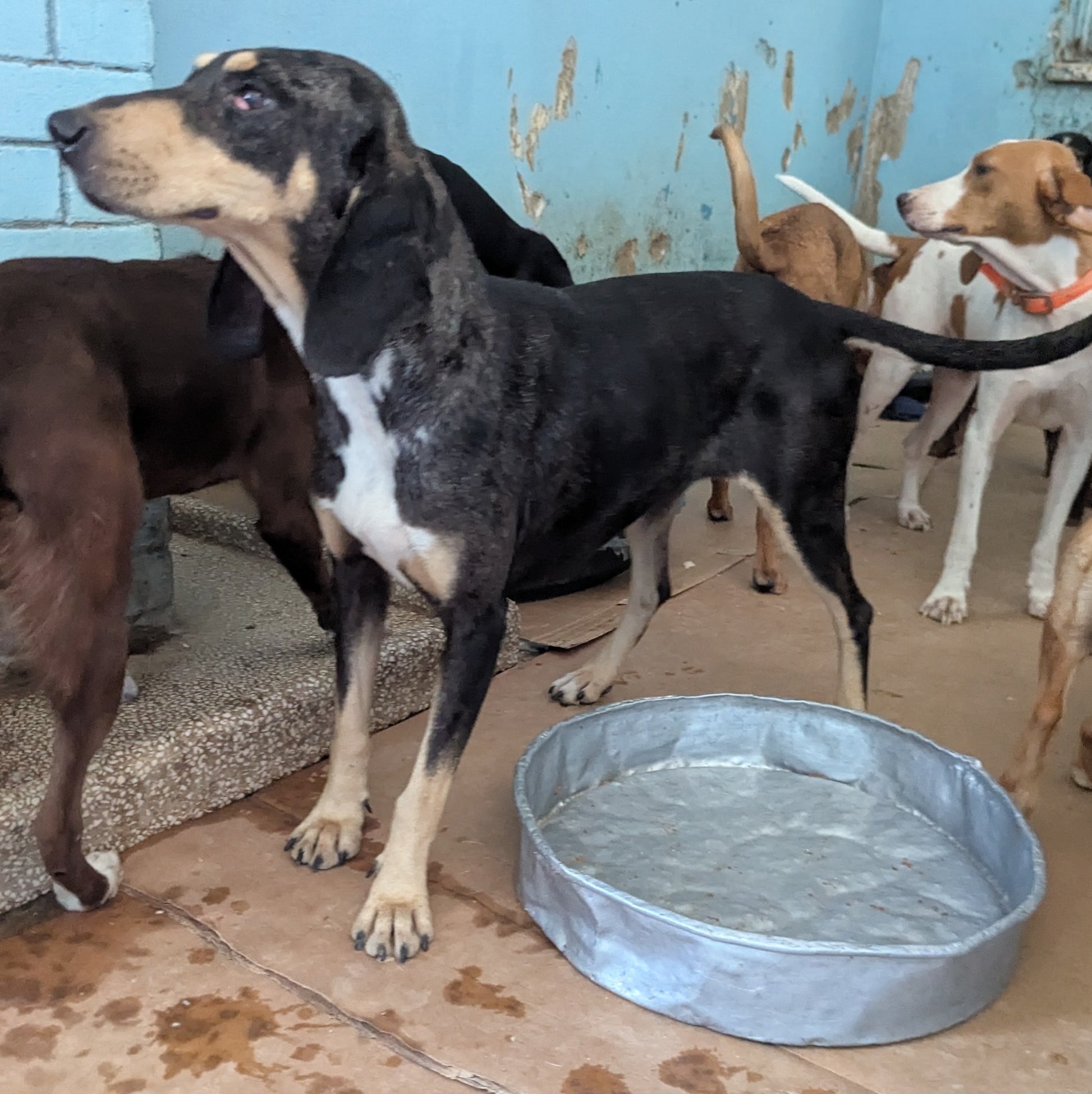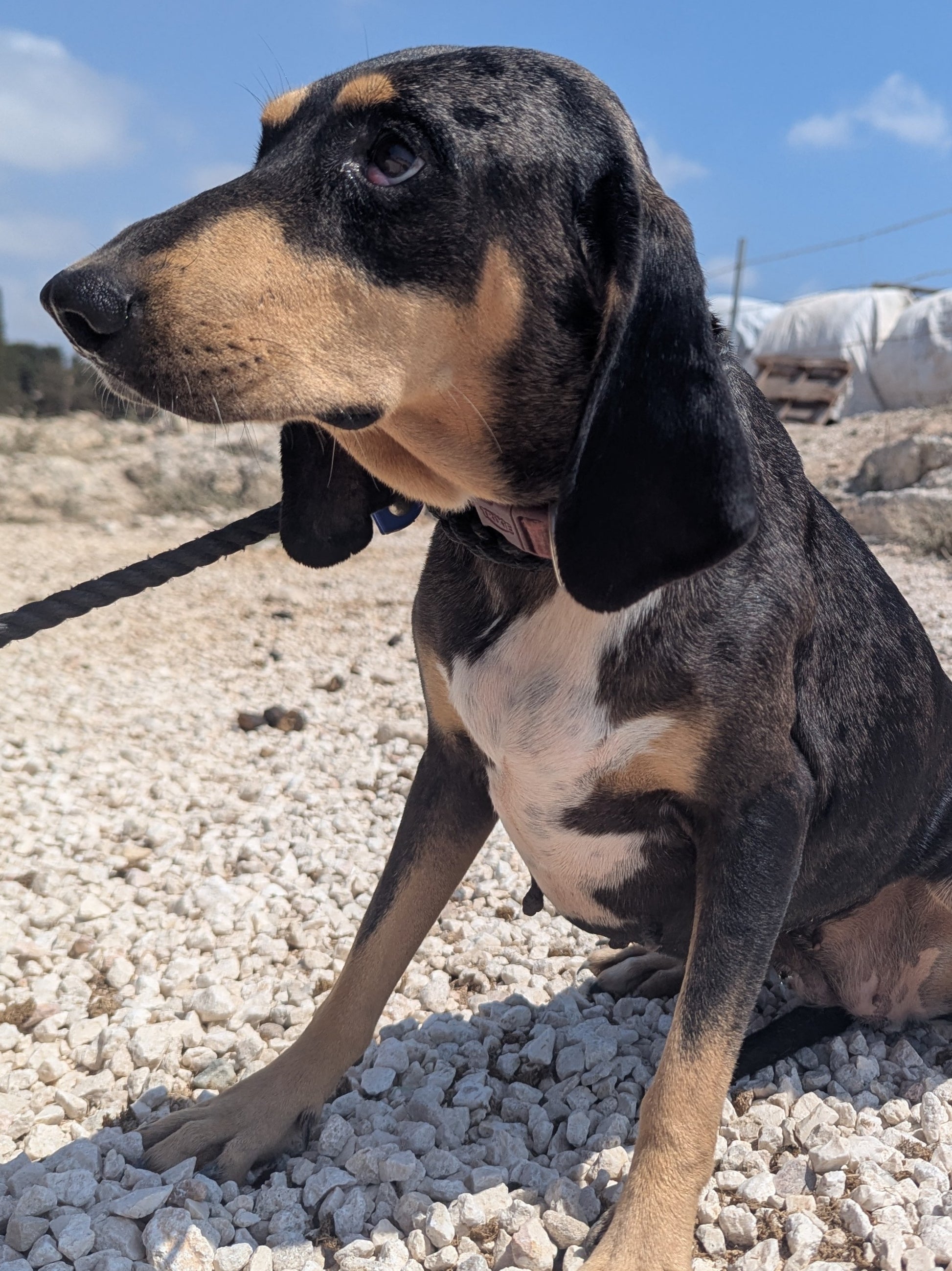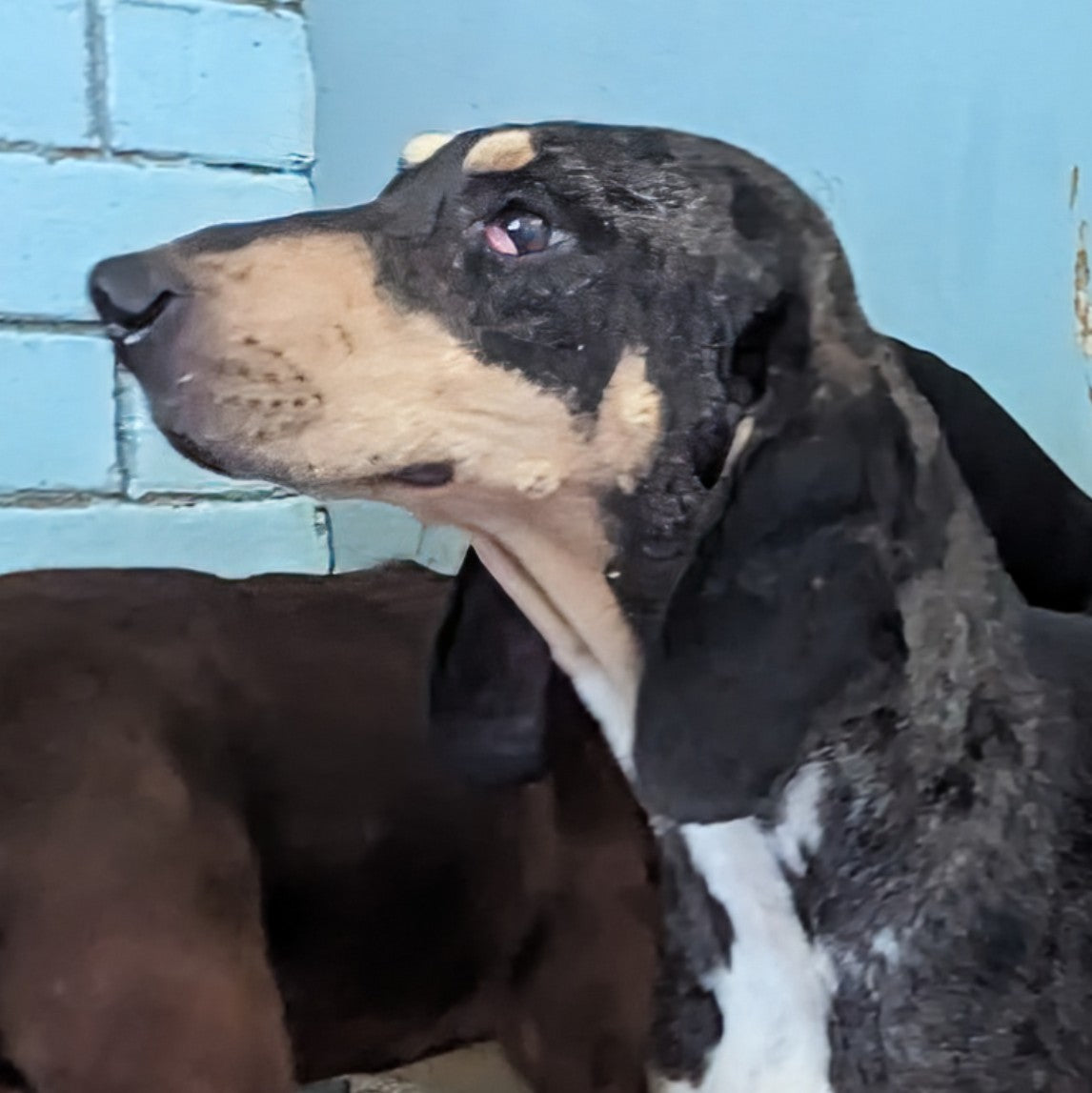 Небольшого к среднему размера девочка охотничей породы темно-серого окраса с чёрным пятнами, белым пятном на груди и рыжим подпалом. Немного пуглива