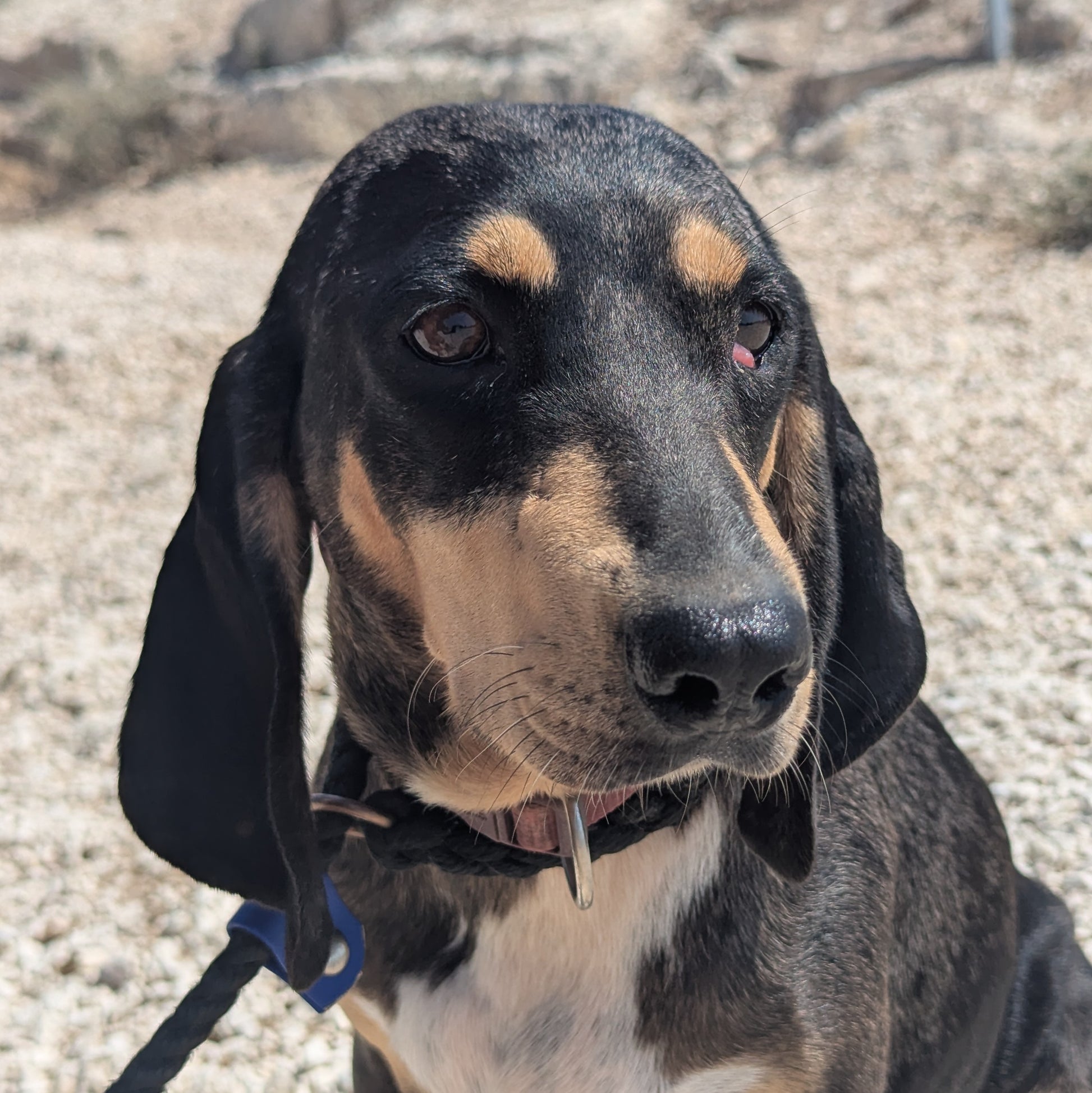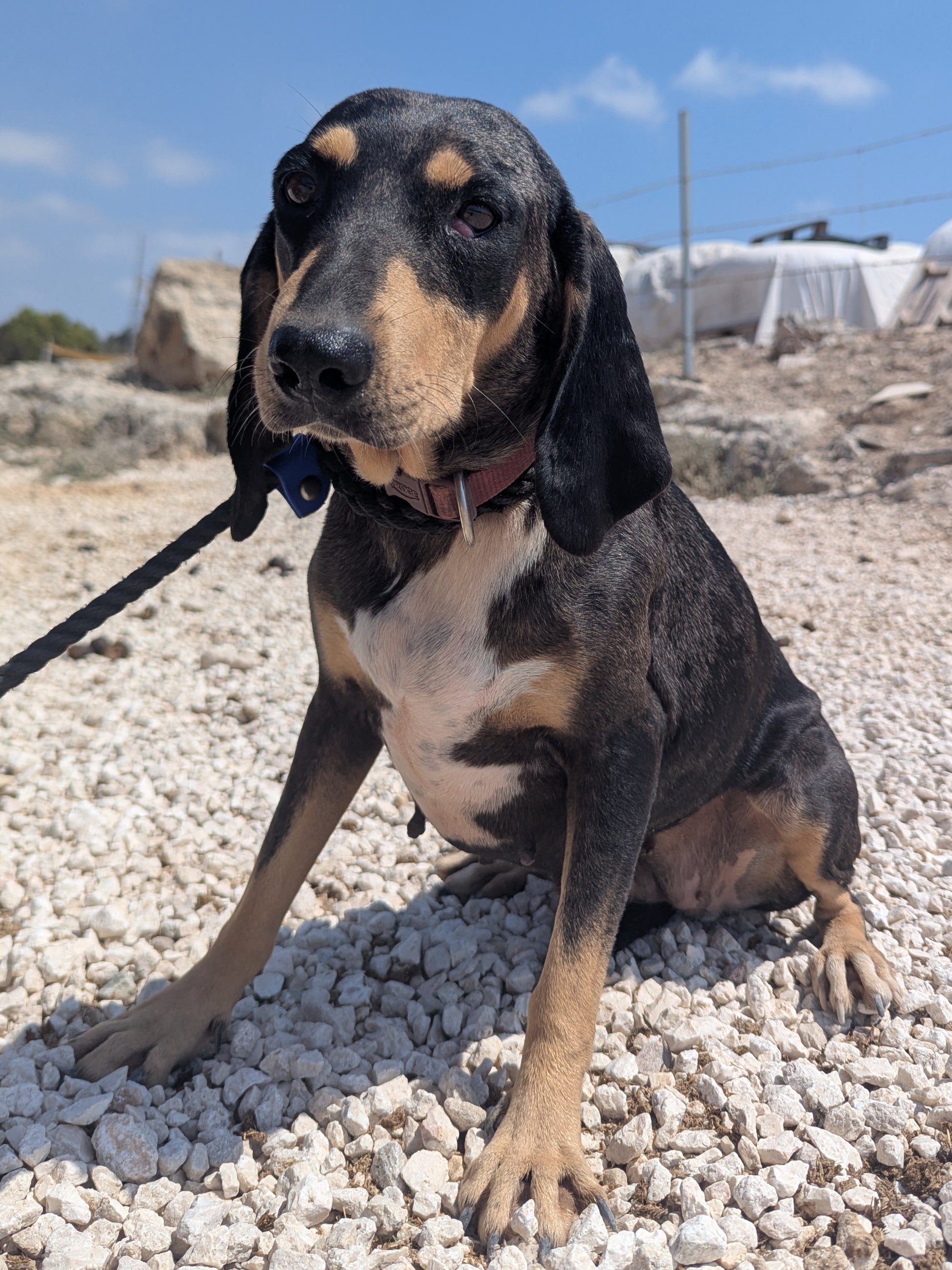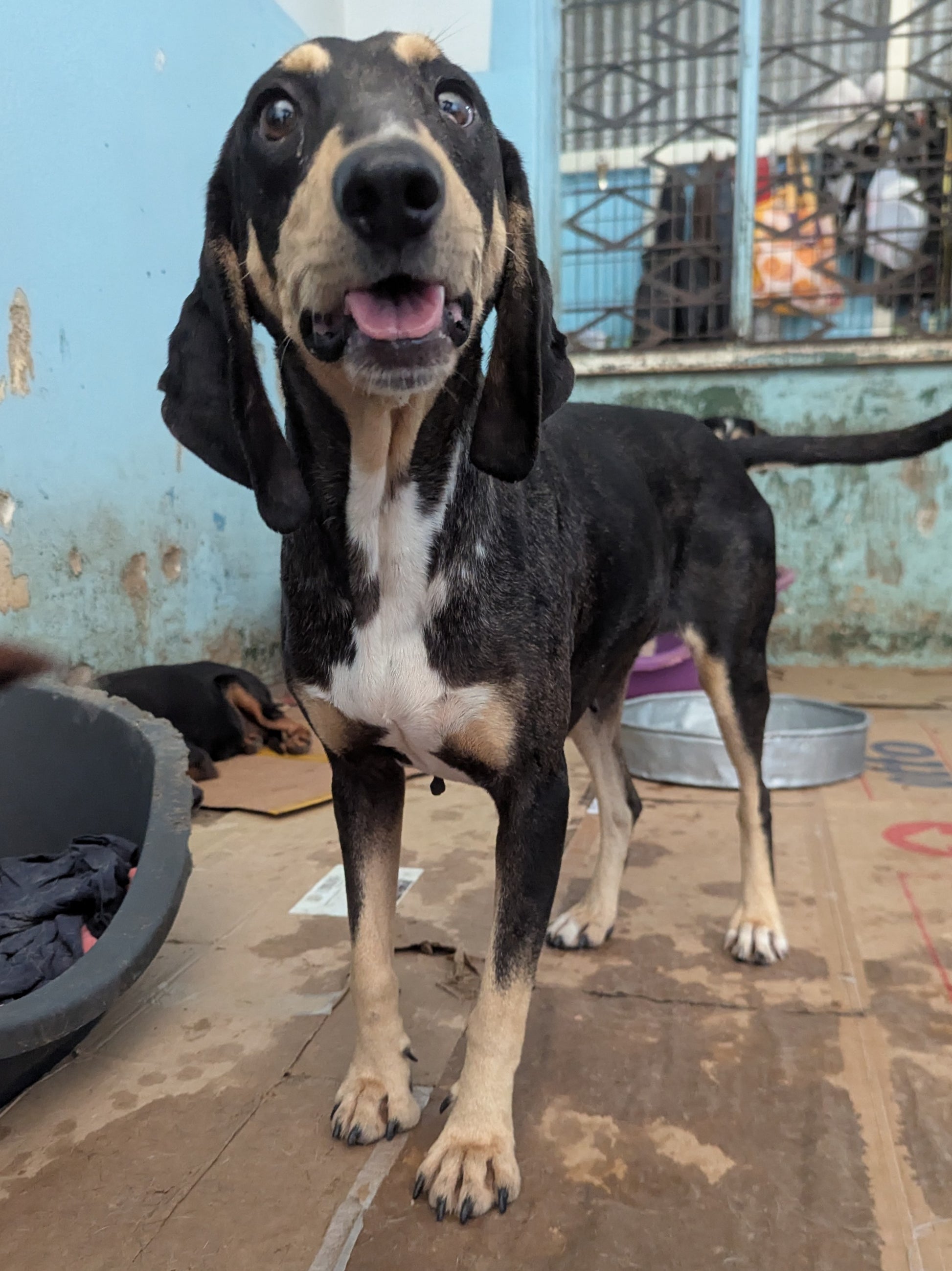 Небольшого к среднему размера девочка охотничей породы темно-серого окраса с чёрным пятнами, белым пятном на груди и рыжим подпалом. Немного пуглива