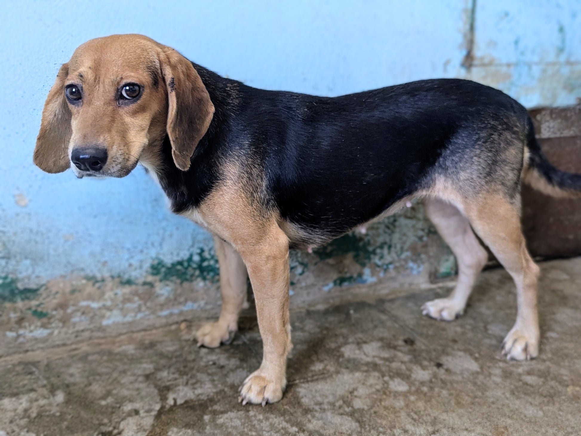 Small-sized short-legged hunter cross female, black and tan with a white stripe on her chest. Affectionate and friendly