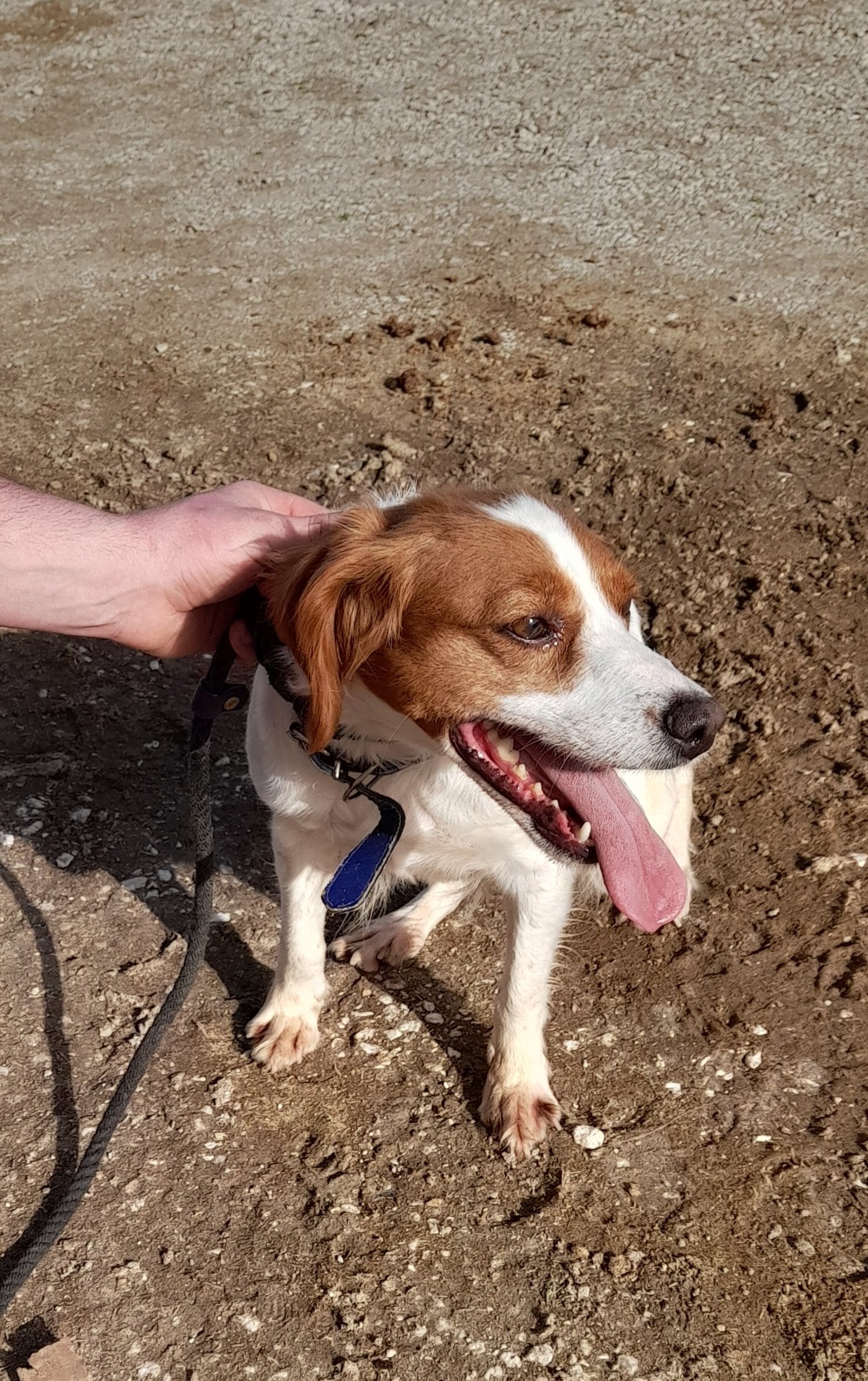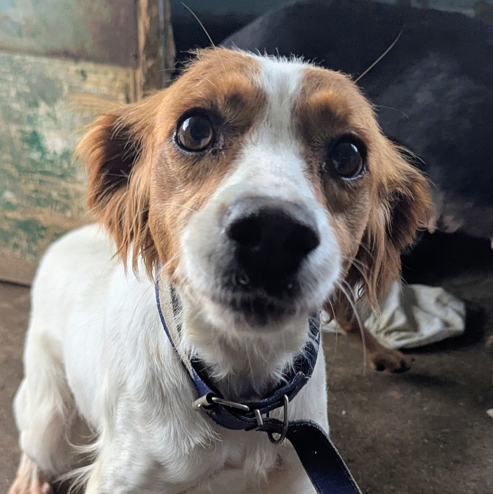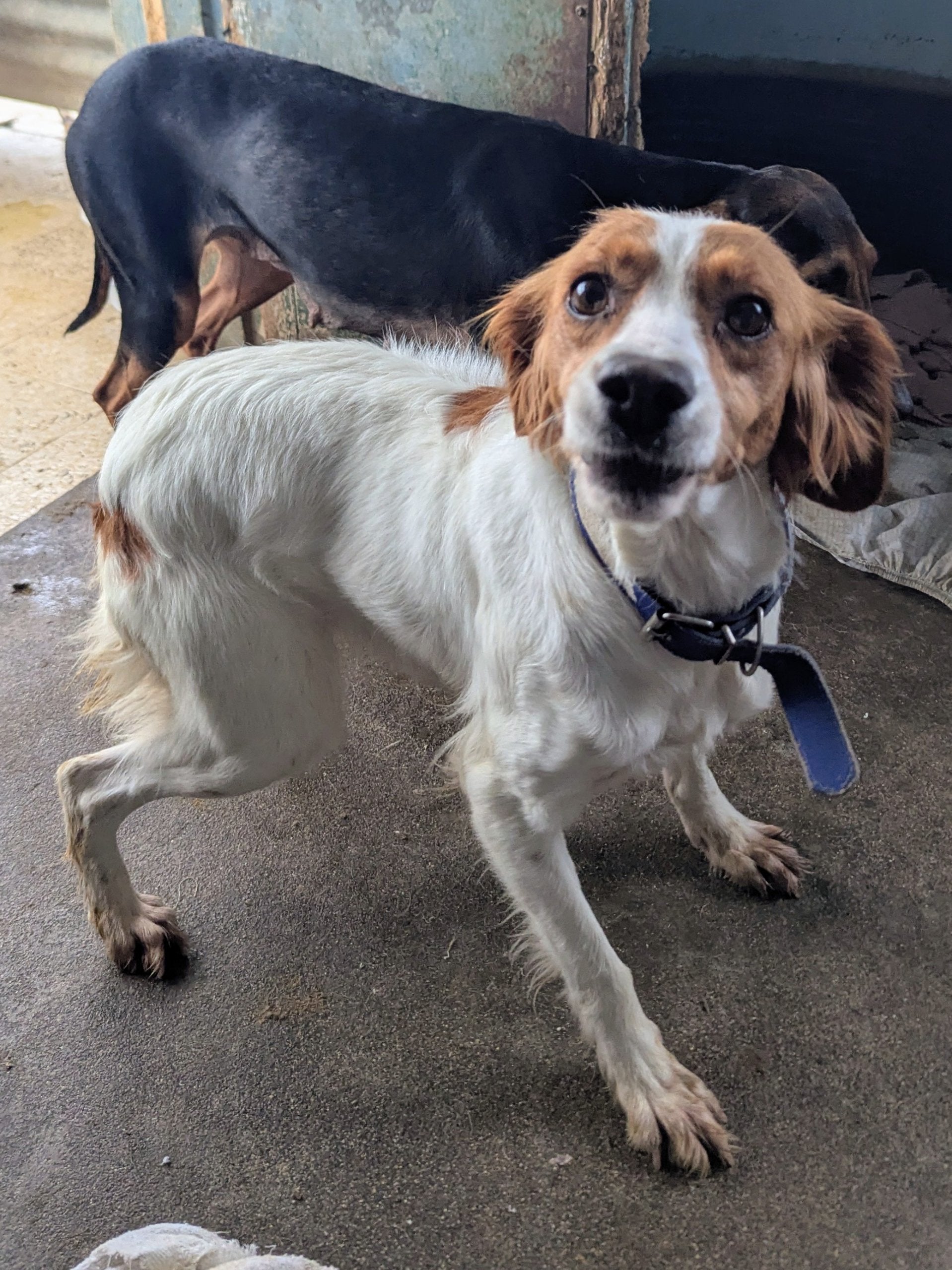 Gorgeous spaniel cross girl, white and ginger beautiful coat, no tail. Very friendly. bewildered that she is at the shelter. Walks nicely, good with other dogs