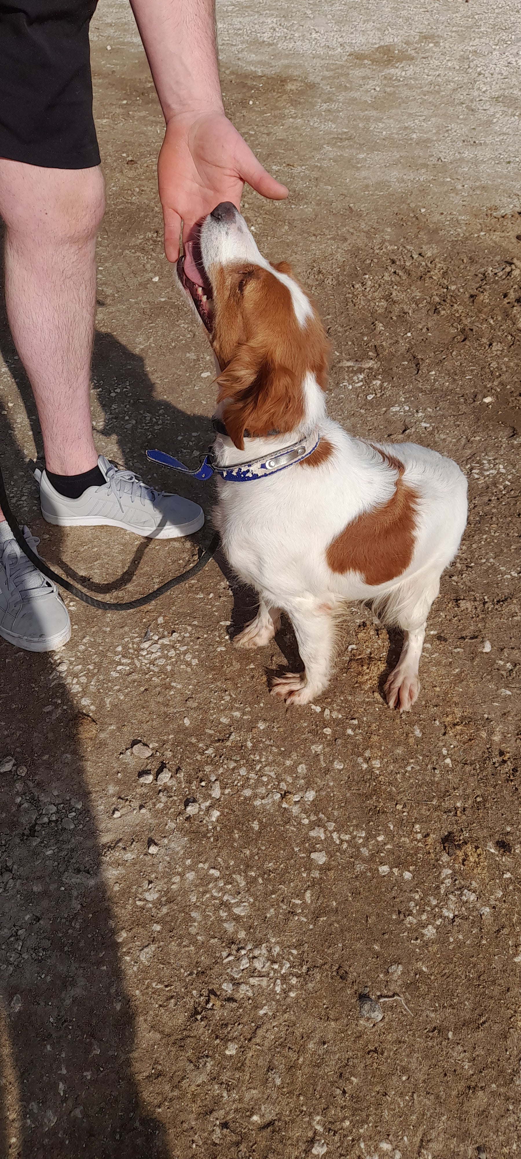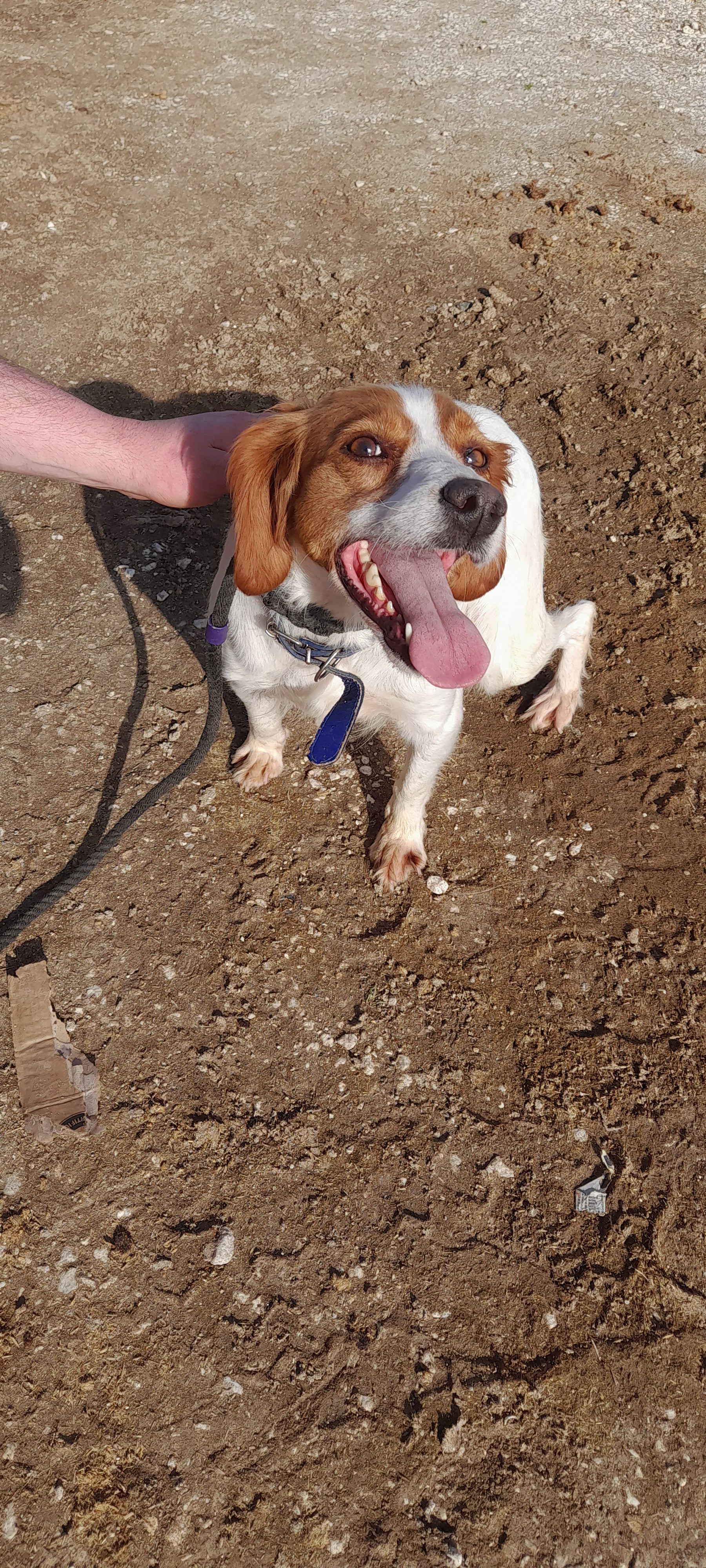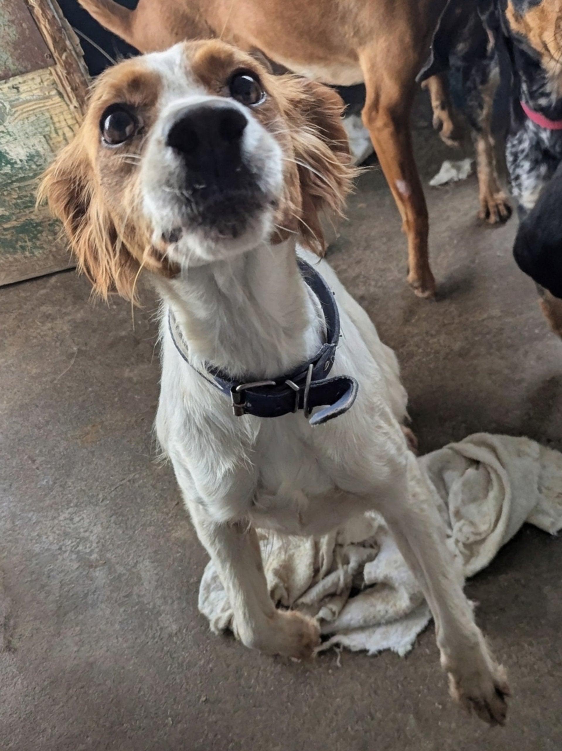 Gorgeous spaniel cross girl, white and ginger beautiful coat, no tail. Very friendly. bewildered that she is at the shelter. Walks nicely, good with other dogs