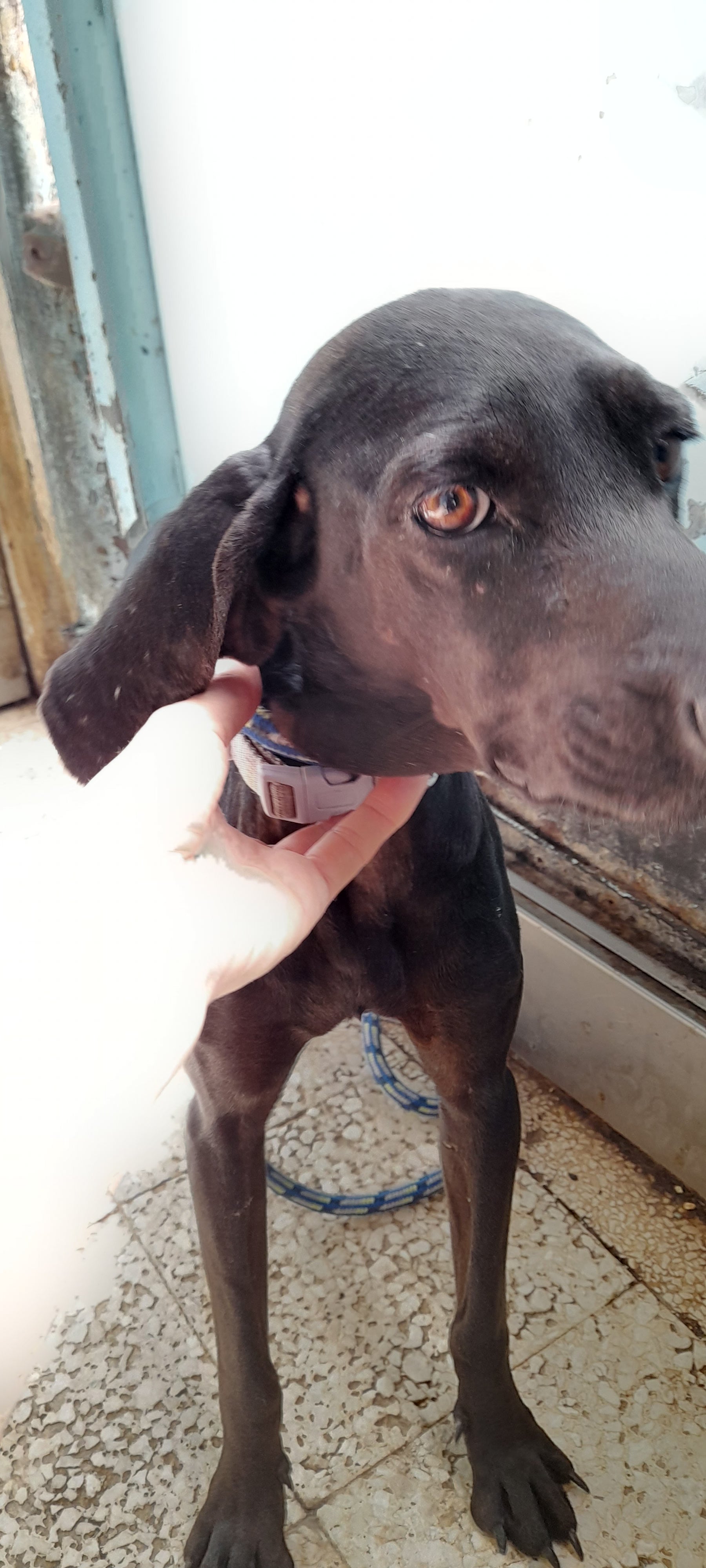 Black short-haired shiny fur, very friendly. Bit skinny..Gets often attacked by others in big pen. Was pregnant and got operated in April 2025.