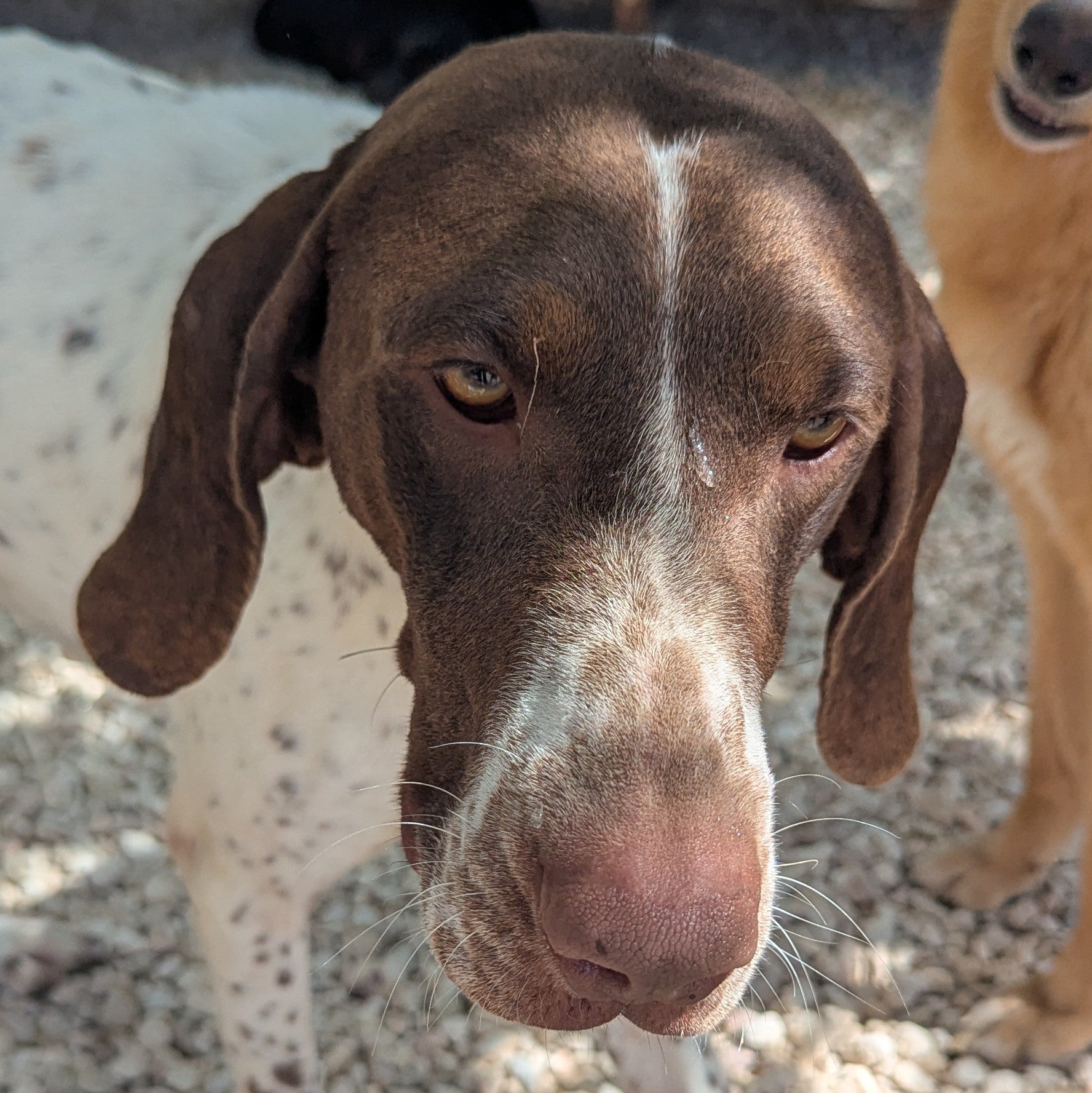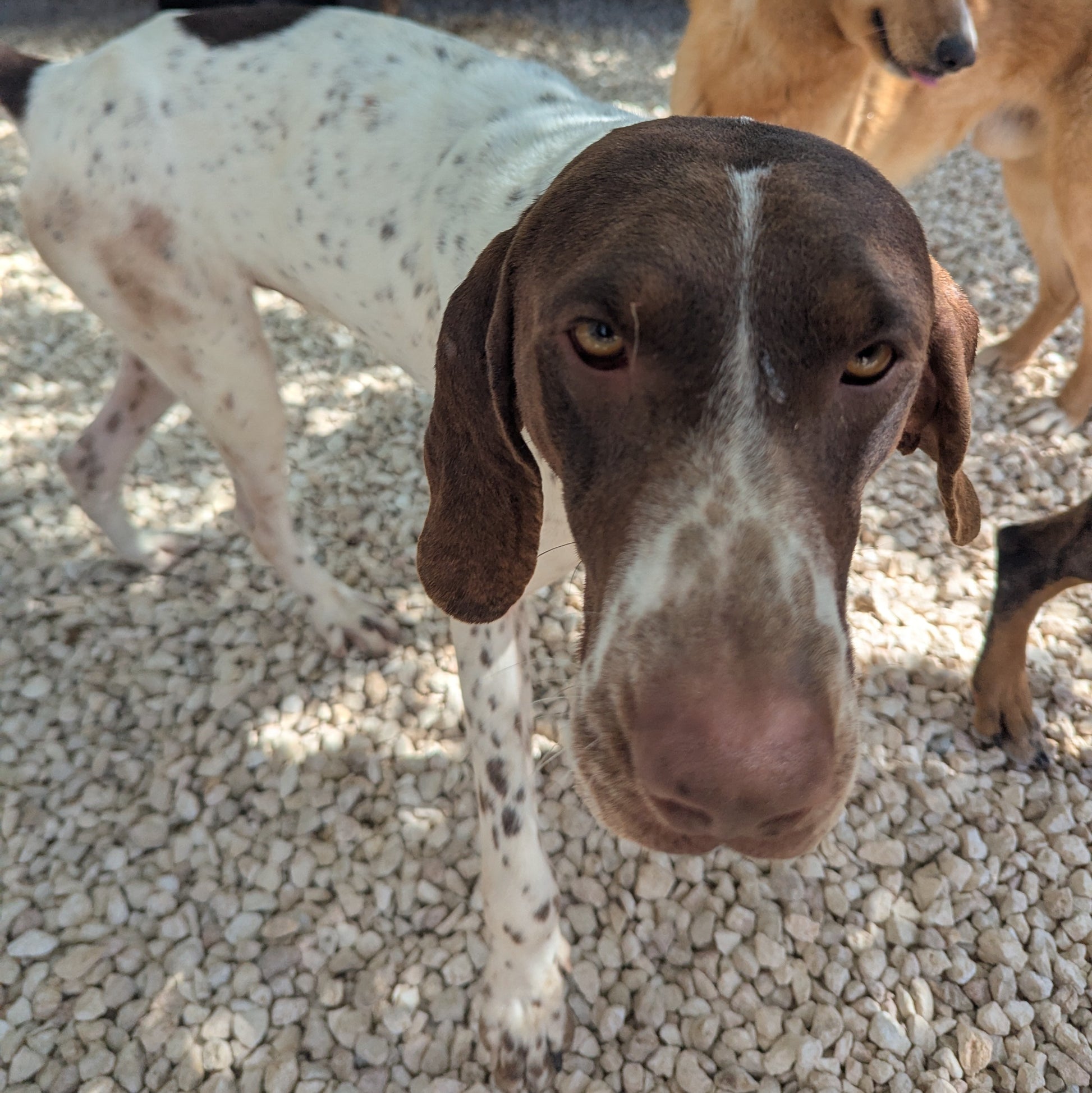 Крупный мальчик породы немецкий пойнтер. Окрас белый с коричневым. Наполовину купированный хвост. Человекоориентированный