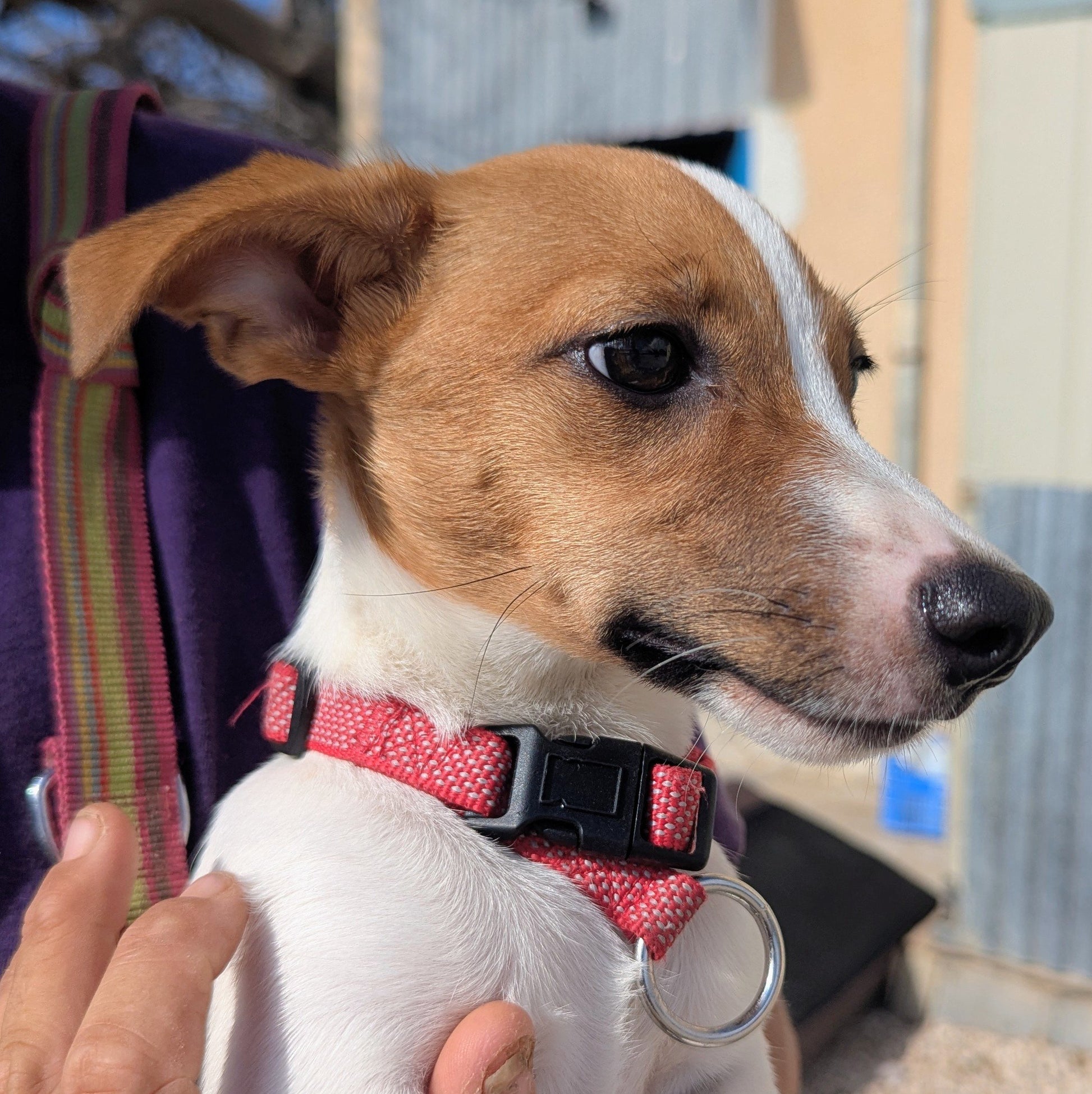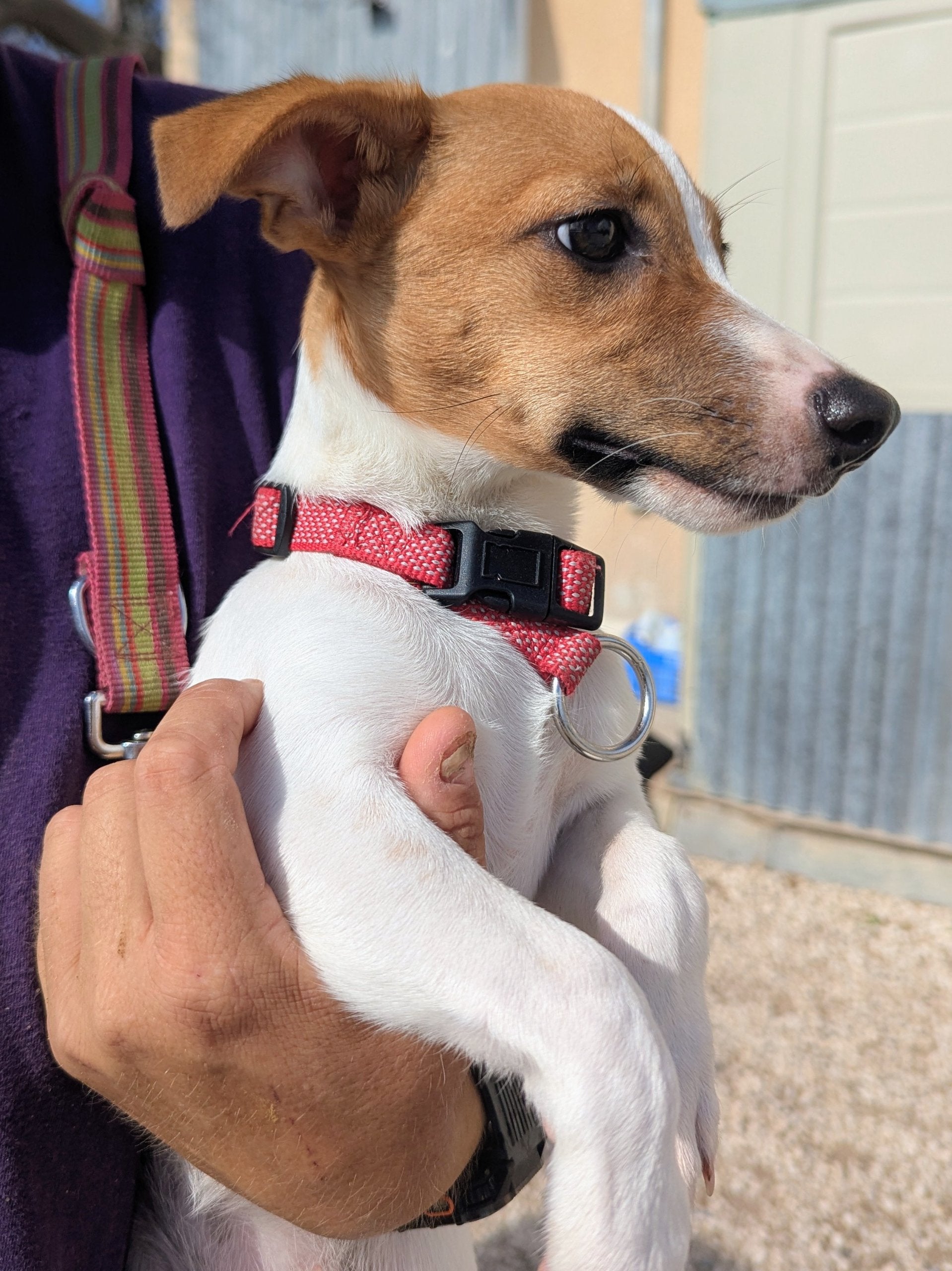 Small-sized young Jack Russell Terrier cross female, white with brown patches