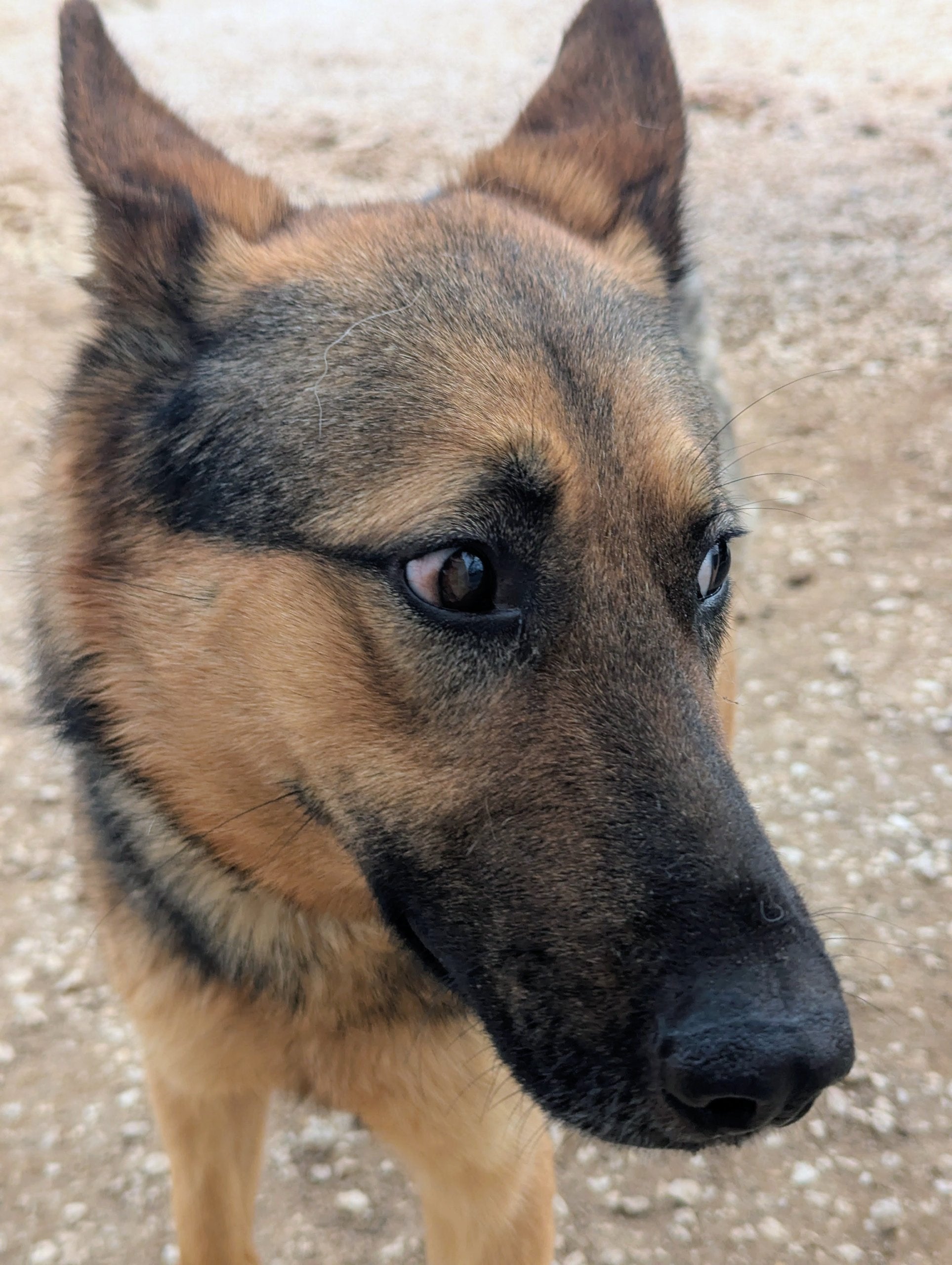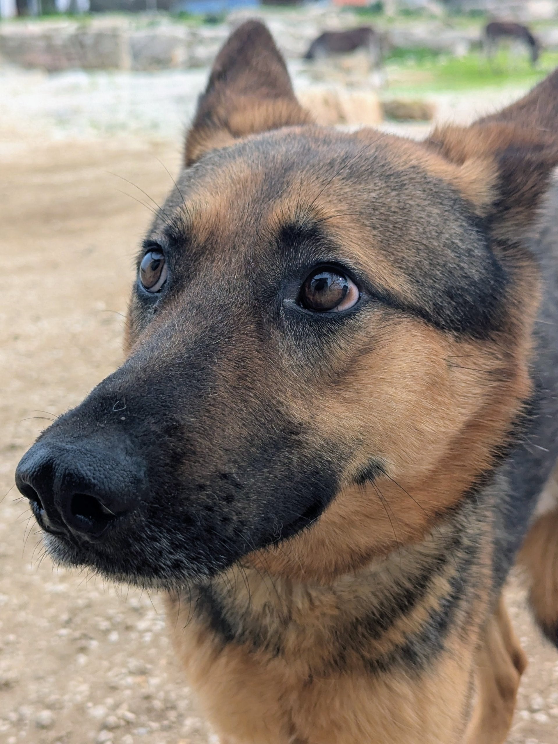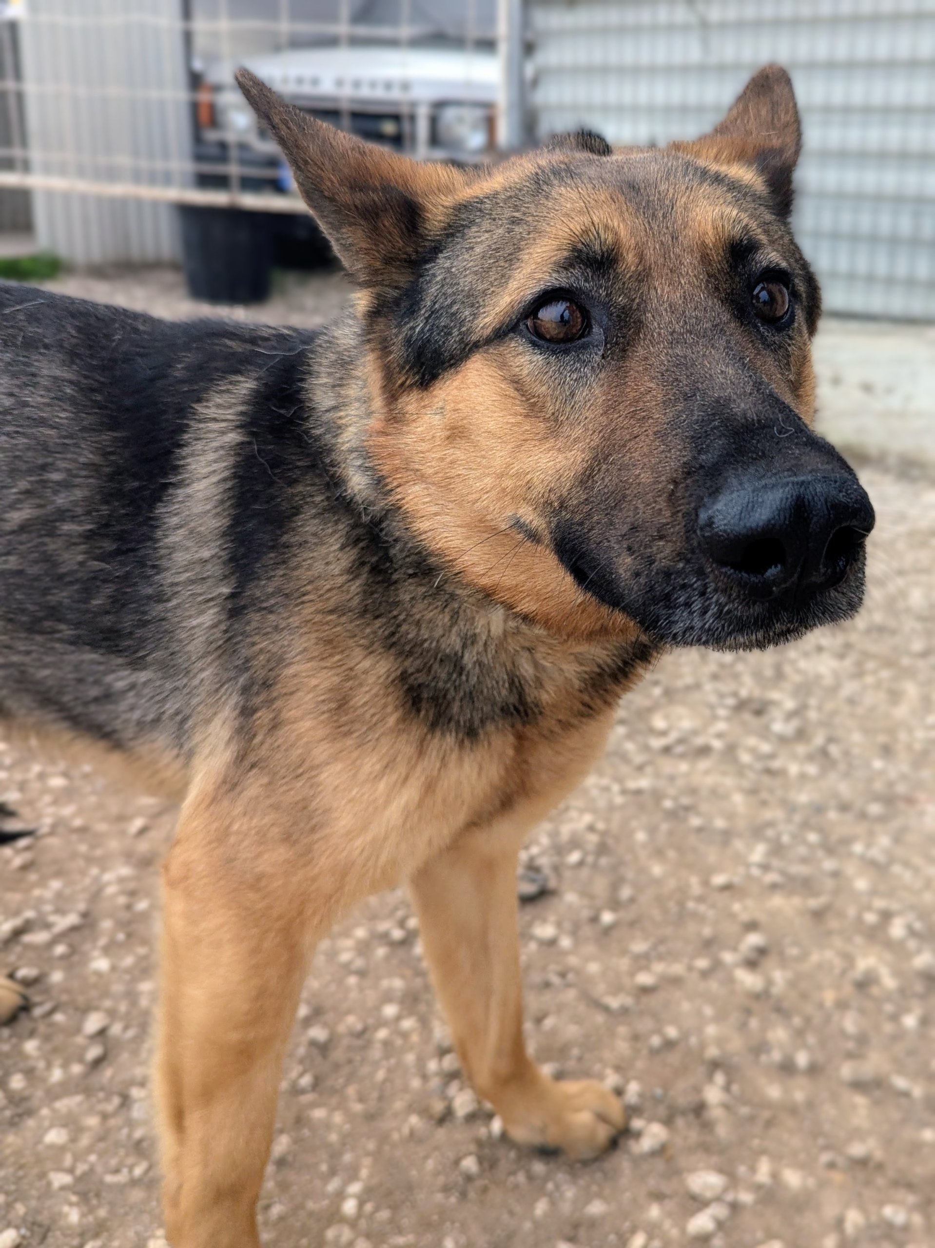 Medium to big-sized German shepherd male. Very timid and scared, though friendly with people and other dogs