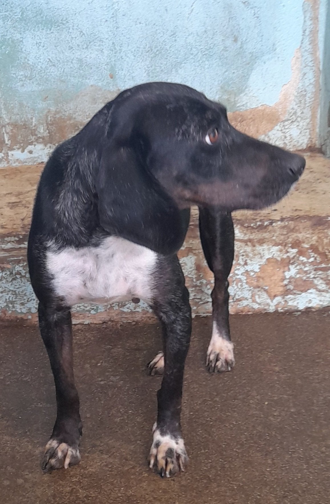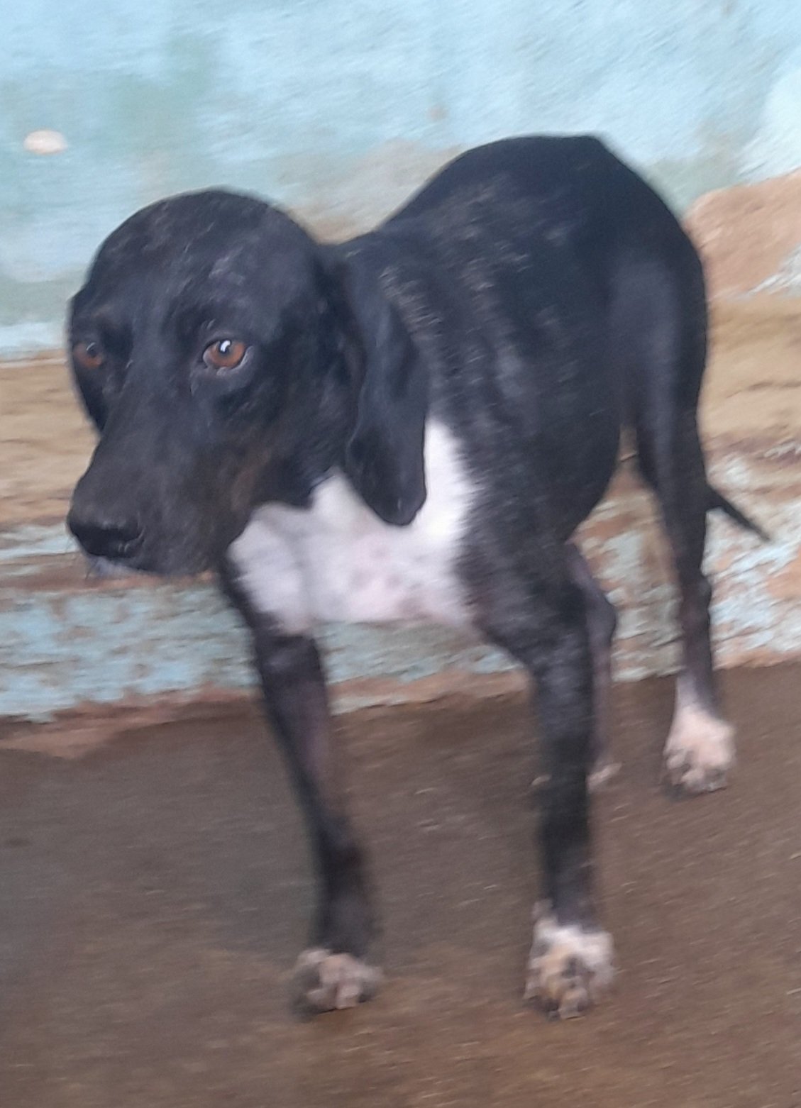 Very timid hound cross, mostly black with white chest.