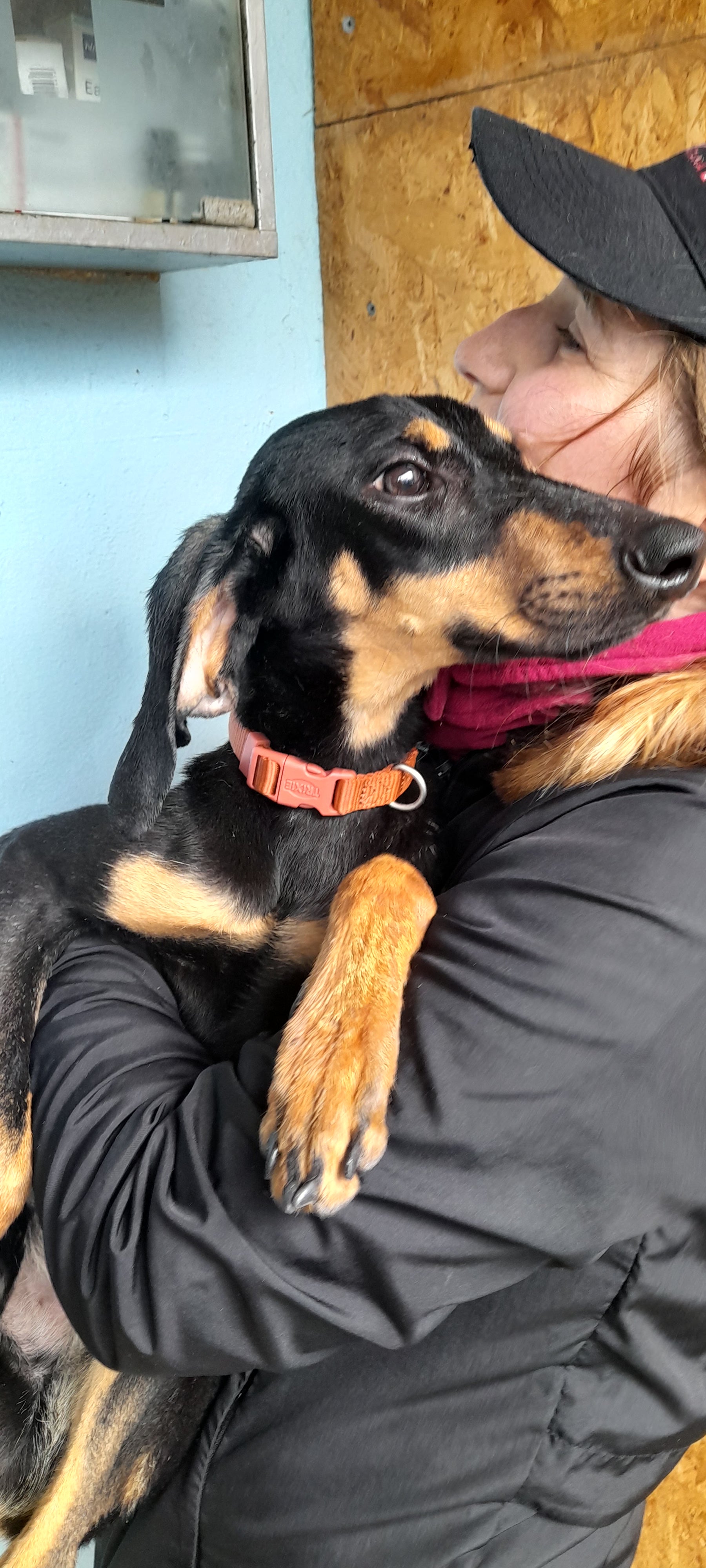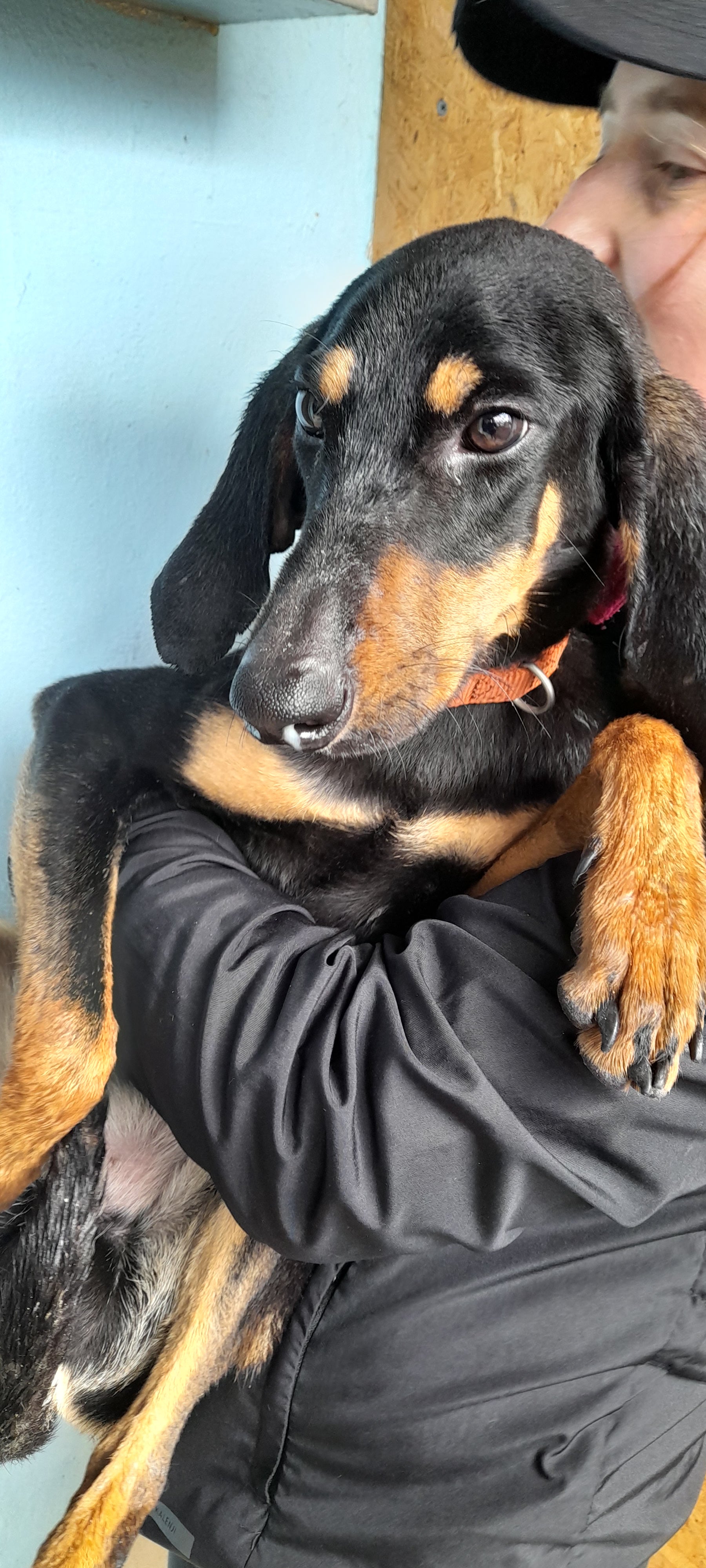 Slim medium sized hunter cross, perhaps Segugio cross. Black and tan, very handsome and calm.